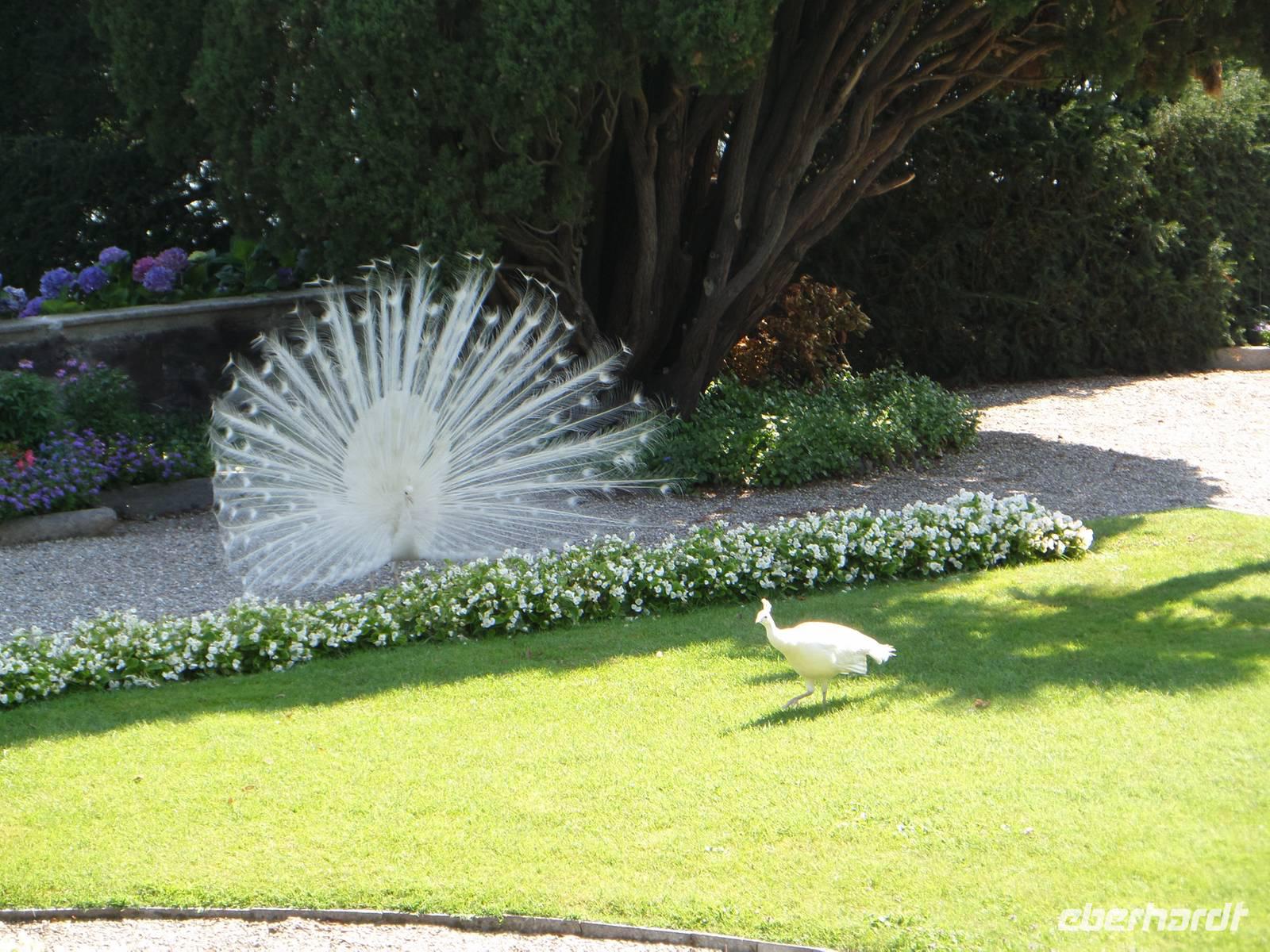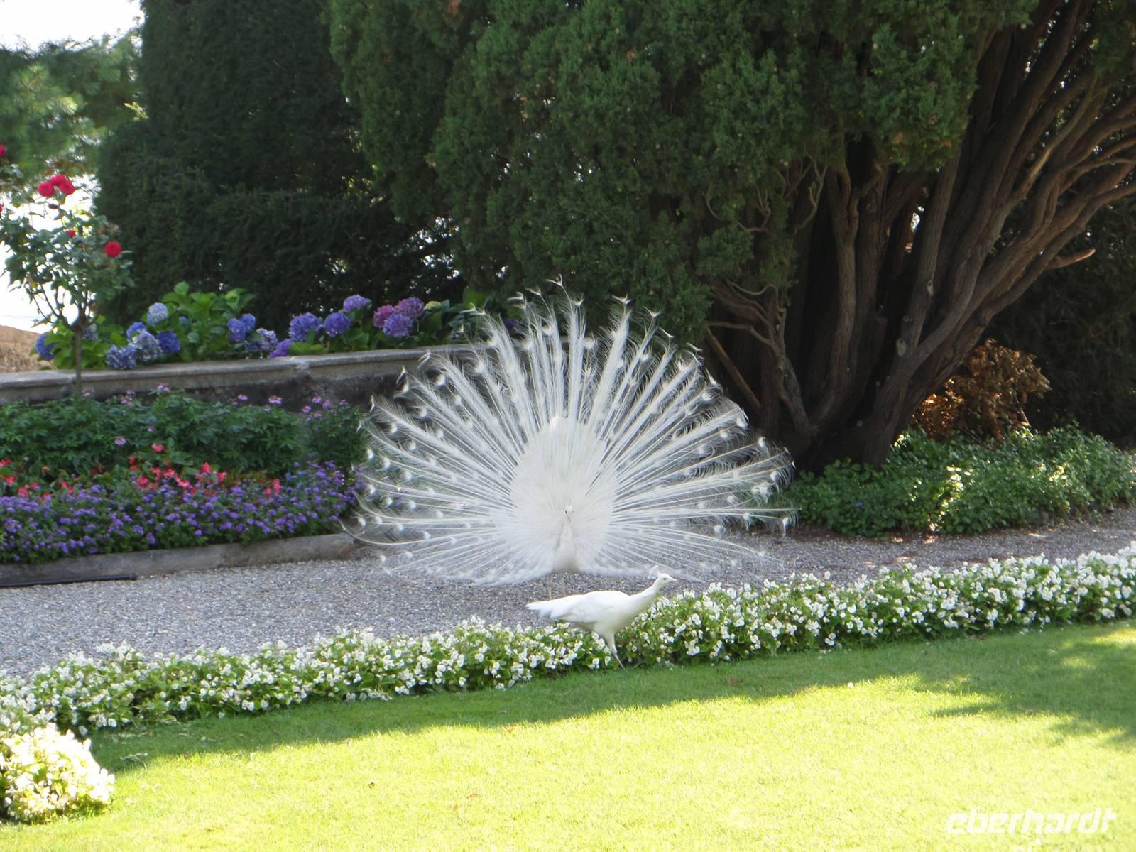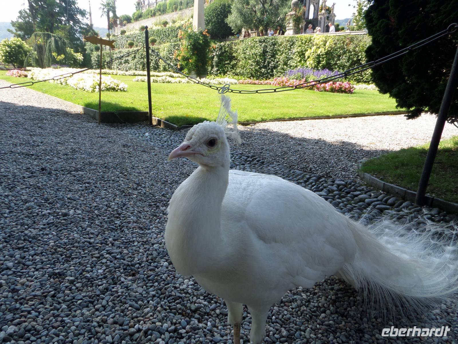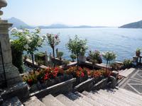 Zuerst führt uns eine nette Schlossdame humorvoll durch den Palazzo Borromeo, der noch immer im Familienbesitz ist. Wir bewundern die wertvolle Ausstattung. Dann der ausgiebige Besuch des wunderschönen Terrassengartens, ein Meisterwerk der italienischen Gartenkunst. Besonders beeindruckten uns die berühmten weißen Pfauen der Insel. Ein erhabener Anblick, wenn sie stolz ihr Rad schlagen und sich präsentieren. Aber heute bevorzugen die meisten Tier den Schatten. Später noch eine kurze Schifffahrt zur Mutterinsel, der Isola Madre. Die Insel ist eine der ältesten Gartenanlagen Italiens. Auch hier werden wir von Pfauen und auch Fasanen - und Hunden, wenn auch als Kunstwerk- begrüßt. Eine Führung bringt uns ins Innere des Palazzo Madre. Dann durchstreifen wir noch den Landschaftsgarten im englischen Stil auf einer Fläche von fast acht Hektar. Im Gegensatz zur Isola Bella findet man hier nur wenige Touristen. Am späten Nachmittag bringt uns das Boot wieder in unser Hotel.