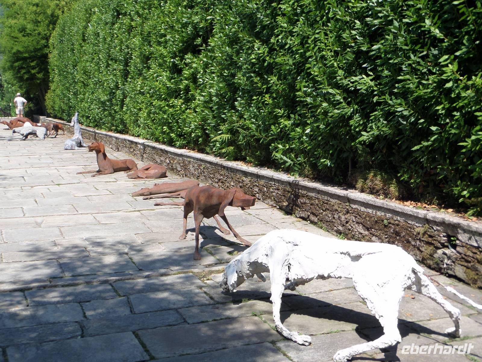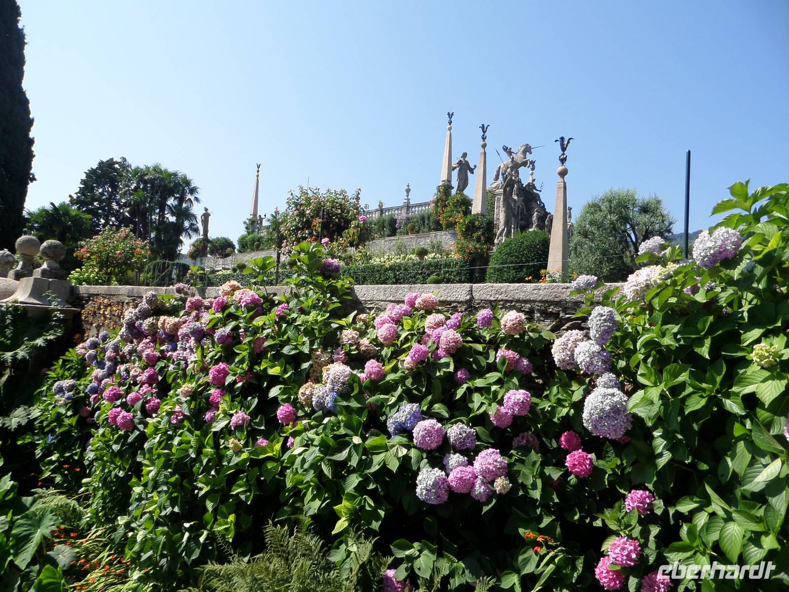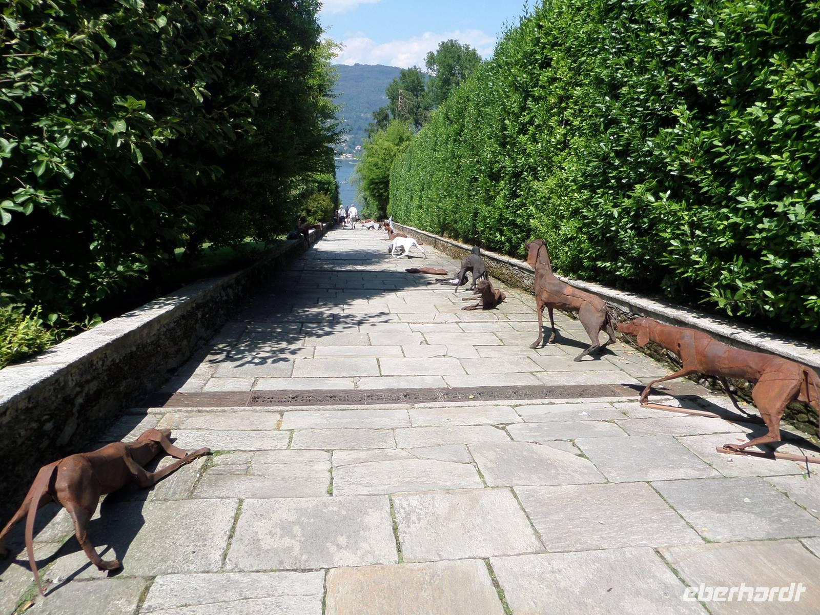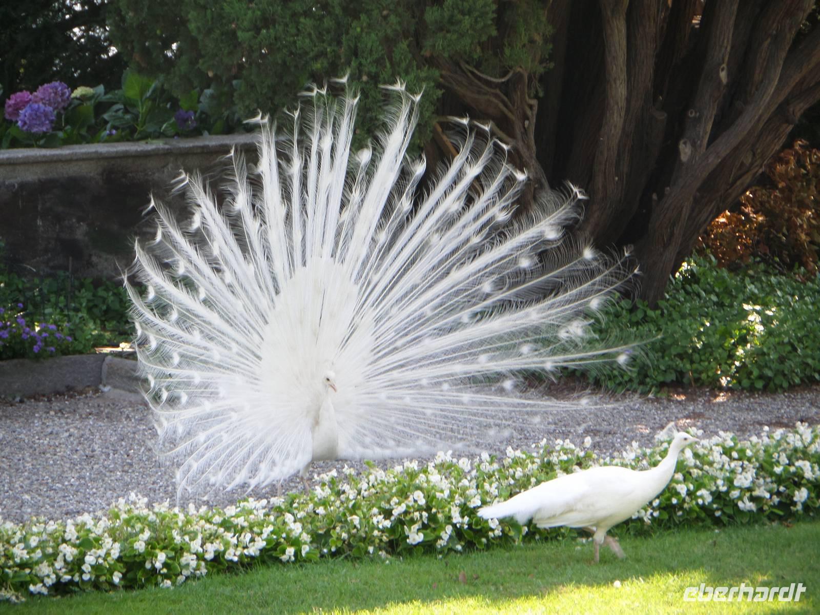 Zuerst führt uns eine nette Schlossdame humorvoll durch den Palazzo Borromeo, der noch immer im Familienbesitz ist. Wir bewundern die wertvolle Ausstattung. Dann der ausgiebige Besuch des wunderschönen Terrassengartens, ein Meisterwerk der italienischen Gartenkunst. Besonders beeindruckten uns die berühmten weißen Pfauen der Insel. Ein erhabener Anblick, wenn sie stolz ihr Rad schlagen und sich präsentieren. Aber heute bevorzugen die meisten Tier den Schatten. Später noch eine kurze Schifffahrt zur Mutterinsel, der Isola Madre. Die Insel ist eine der ältesten Gartenanlagen Italiens. Auch hier werden wir von Pfauen und auch Fasanen - und Hunden, wenn auch als Kunstwerk- begrüßt. Eine Führung bringt uns ins Innere des Palazzo Madre. Dann durchstreifen wir noch den Landschaftsgarten im englischen Stil auf einer Fläche von fast acht Hektar. Im Gegensatz zur Isola Bella findet man hier nur wenige Touristen. Am späten Nachmittag bringt uns das Boot wieder in unser Hotel.