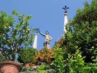 Unser Ziel ist Bellagio, bekanntester und beliebtester Ferienort am See, auch Perle des Lario genannt. Am Fähranleger teilt unser Busteam schnell noch die bestellten Würstchen aus, da wir zum Essen in Lugano weder Zeit noch Franken hatten. Mit der Fähre fahren wir in zehn Minuten hinüber nach Bellagio. Der Ort liegt herrlich zwischen den beiden südlichen Seearmen, dem Lago di Como und dem Lago di Lecco. Hier haben wir freie Zeit, um durch die kleinen Gassen der Stadt zu bummeln. Petra empfiehlt uns die Villa Melzi, einen herrlicher Park. Franz Liszt und die verheiratete Gräfin d'Agoult verbrachten drei romantische Monate in Bellagio! Am Seeufer steht ein kleiner Pavillon im maurischen Stil, davor die berühmte Statue Dante mit Beatrice. Hier soll Liszt die „Sonate für Dante" komponiert haben.
