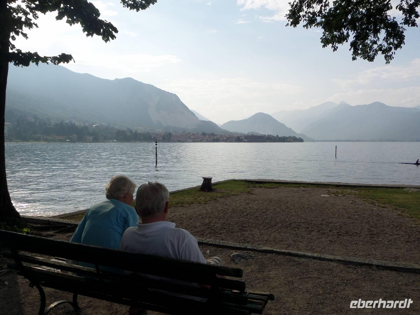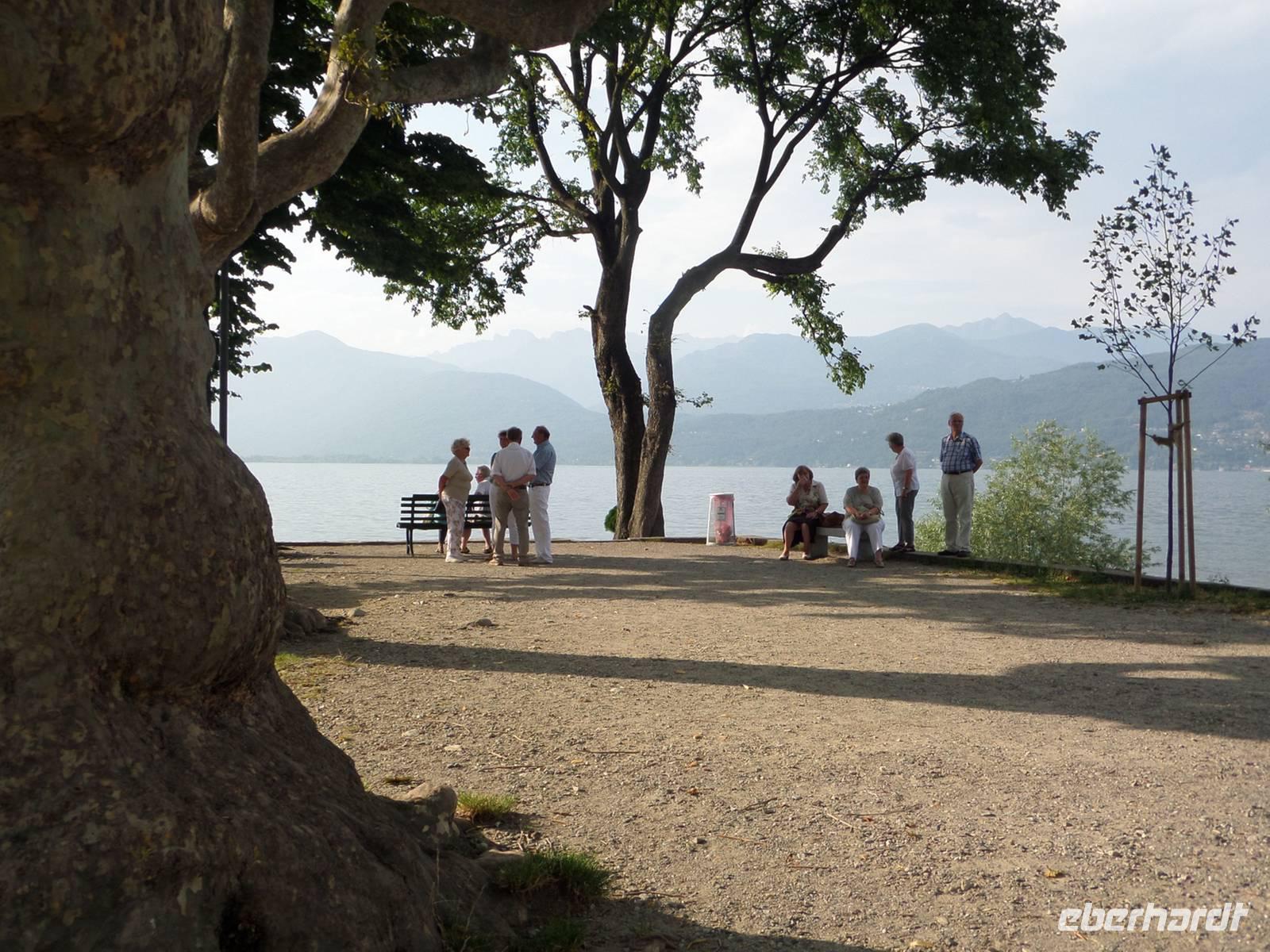 In der Freizeit fahren einige Gäste auf das Dach des Domes. Oder sie bummeln durch die berühmten Einkaufsstraßen, denn die Geschäfte haben auch am Sonntag geöffnet. Gemeinsam spazieren wir zu unserem Bus zurück, der am Castello Sforza auf uns wartet, und fahren wieder zum Lago Maggiore zurück. Am See entlang lernen wir das südwestliche Seeufer auf Piemonteser Seite kennen.