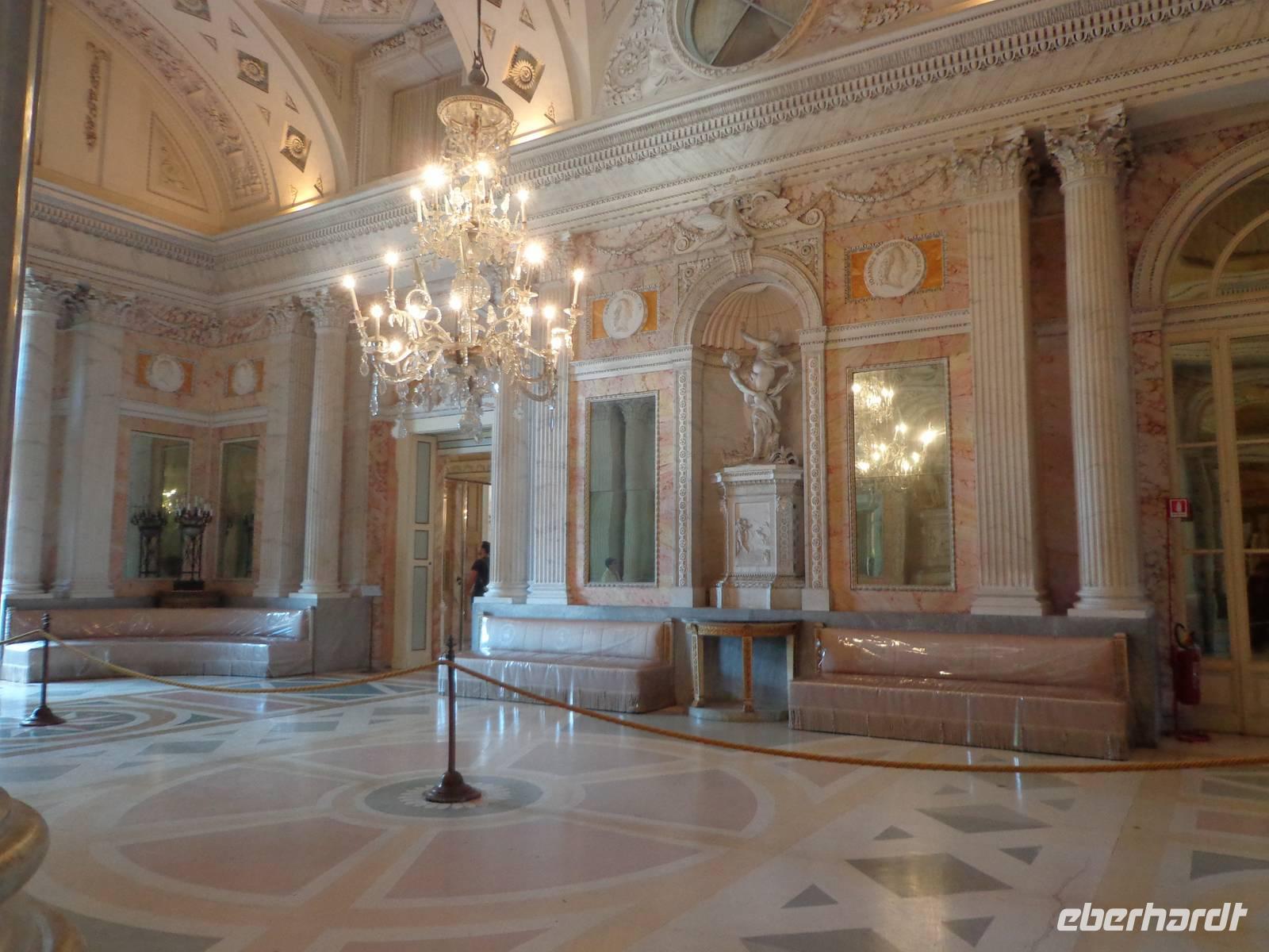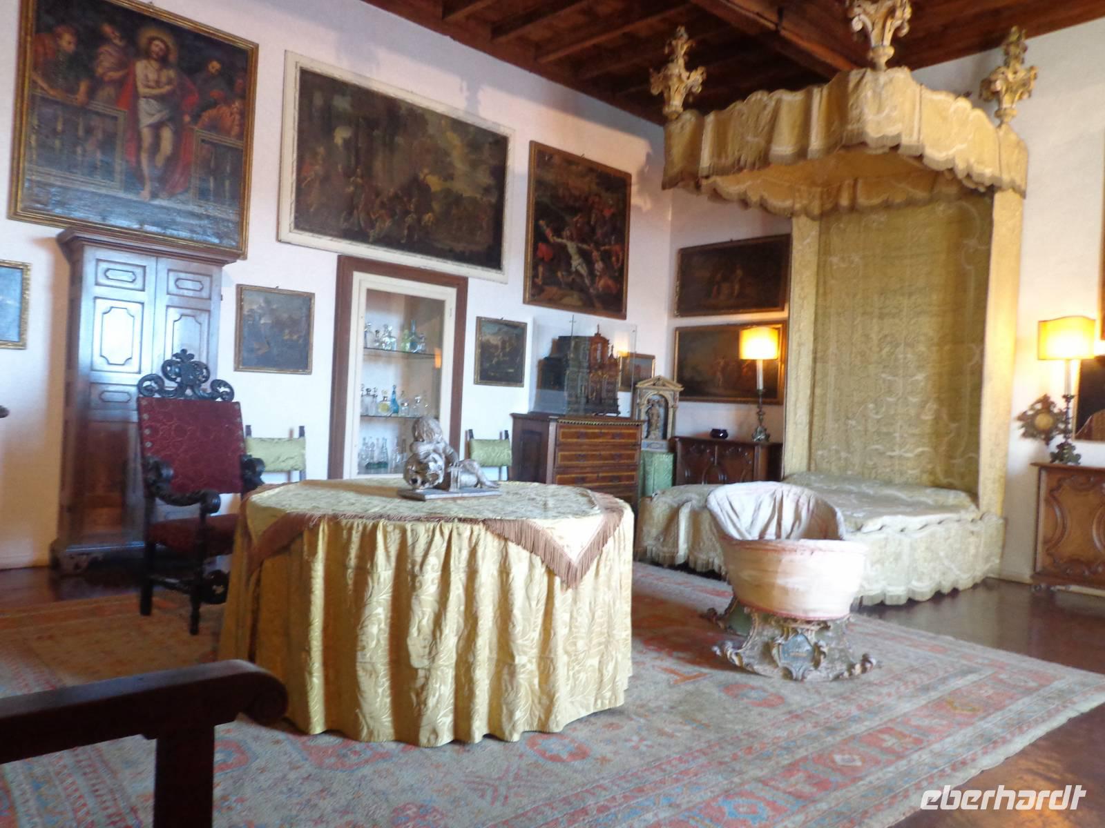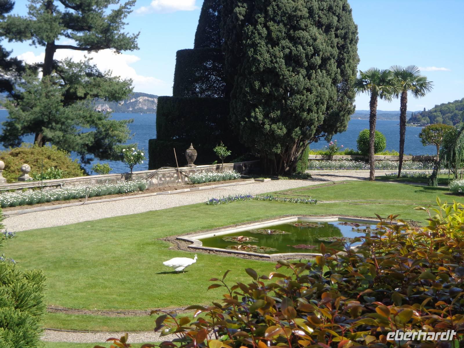 Markantes Merkmal der Insel ist der Palazzo Borromeo. Gemeinsam mit dem Gästeführer Alessio unternehmen wir einen Rundgang durch den Palast. Er sucht sich auch gleich zu Beginn der Führung seine Eva unter unseren Gästen aus. Der Palast ist reich ausgestattet mit Gemälden aus dem 17. Jahrhundert, einem Puppenmuseum. Besonders sehenswert sind die alten Theaterkulissen und die dazu gehörigen Marionetten. Auf der Insel ist auch ein botanischen Garten, mit der Zypresse aus Kaschmir verschiedenen exotischen Pflanzen und freilaufende Fasane und Pfaue.