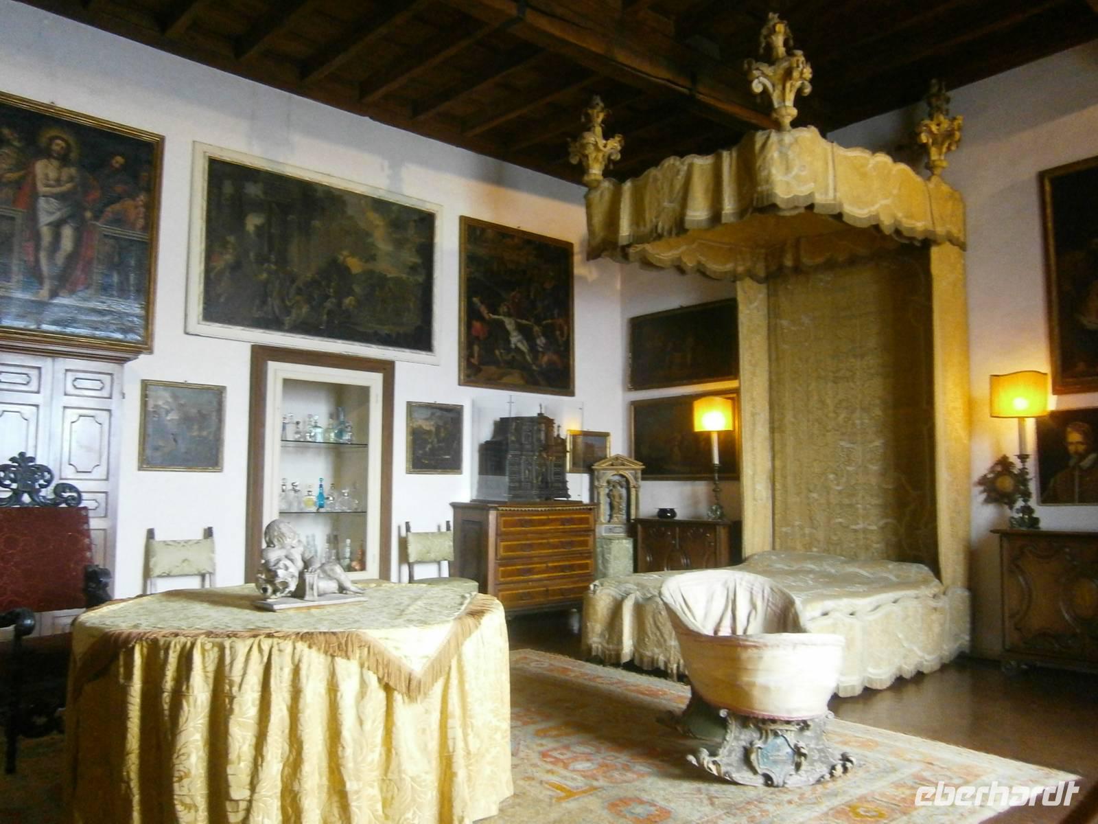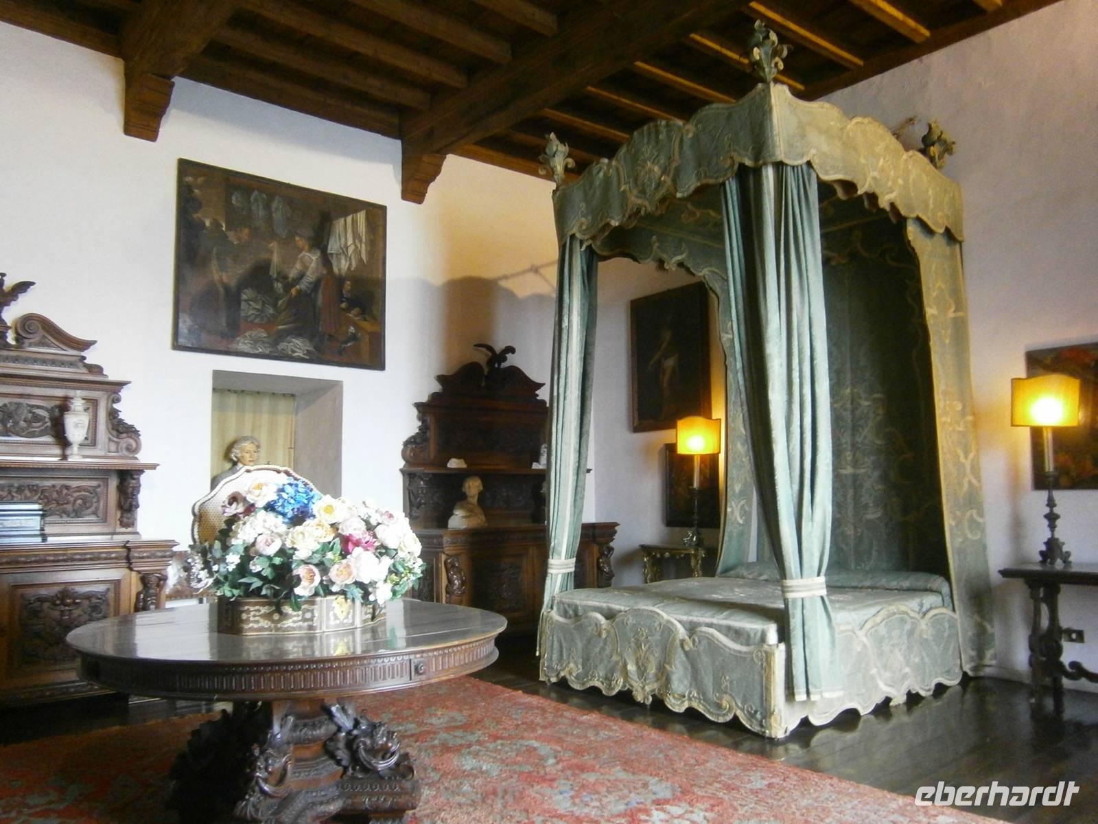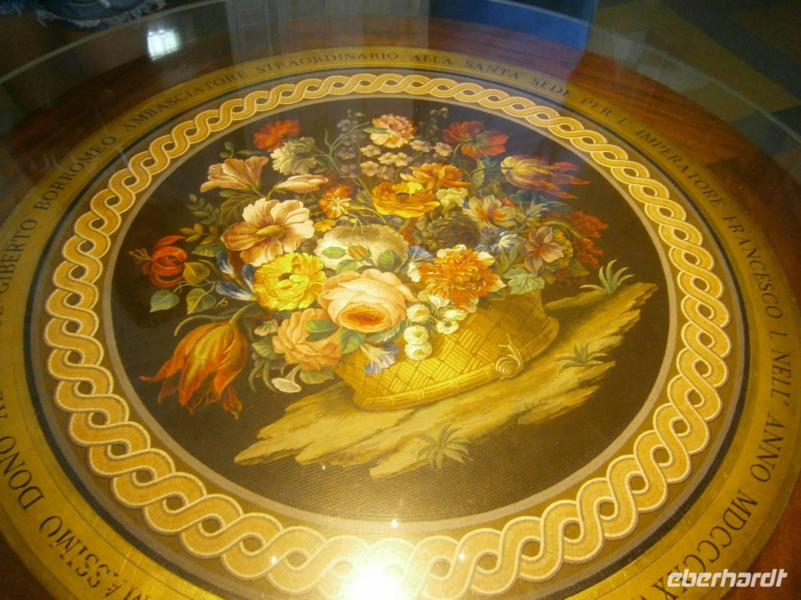 Privatboote bringen uns, nach der Mittagspause, zur Mutterinsel. Die Isola Madre - ist die Größte der vier Inseln. Auf ihr steht auch ein Palazzo der Familie Boromeo. In diesem wohnte man. Bestes Beispiel dafür sind die Kamine, die in fast jedem Zimmer noch heute vorhanden sind. Der Palast ist mit Möbeln ausgestattet die nicht zur ursprünglichen Einrichtung gehörten, vielmehr stammen diese aus den verschiedenen Palästen der Familie Boromeo in Mailand. Mit Anna, unserer Gästeführerin, besichtigen wir den Palast. Gobelins, Keramik, Gemälde aus dem 17. Jahrhundert zählen ebenso zu den Ausstellungsstücken wie auch das Marionettentheater und die Puppensammlung. Vor dem Palast erhebt sich eine prächtige Zypresse aus Kaschmir. In der Nacht zum 28. Juni 2006 fegte ein Sturm über die Isola Madre. Ihm konnte die Zypresse nicht stand halten und wurde aus ihren Wurzeln gerissen. Die umfangreichen Rettungsmaßnahmen haben sich gelohnt. Die Zypresse erholt sich von Jahr zu Jahr und ist eine der Hauptattraktionen der Insel. Die Gartenanlage auf der Isola Madre zählt zu den ältesten und wichtigsten in Italien. Auch hier stolzieren Fasane und Pfaue würdigen Schrittes durch den botanischen Garten und bieten so manch reizvolles Fotomotiv für unsere Gäste.