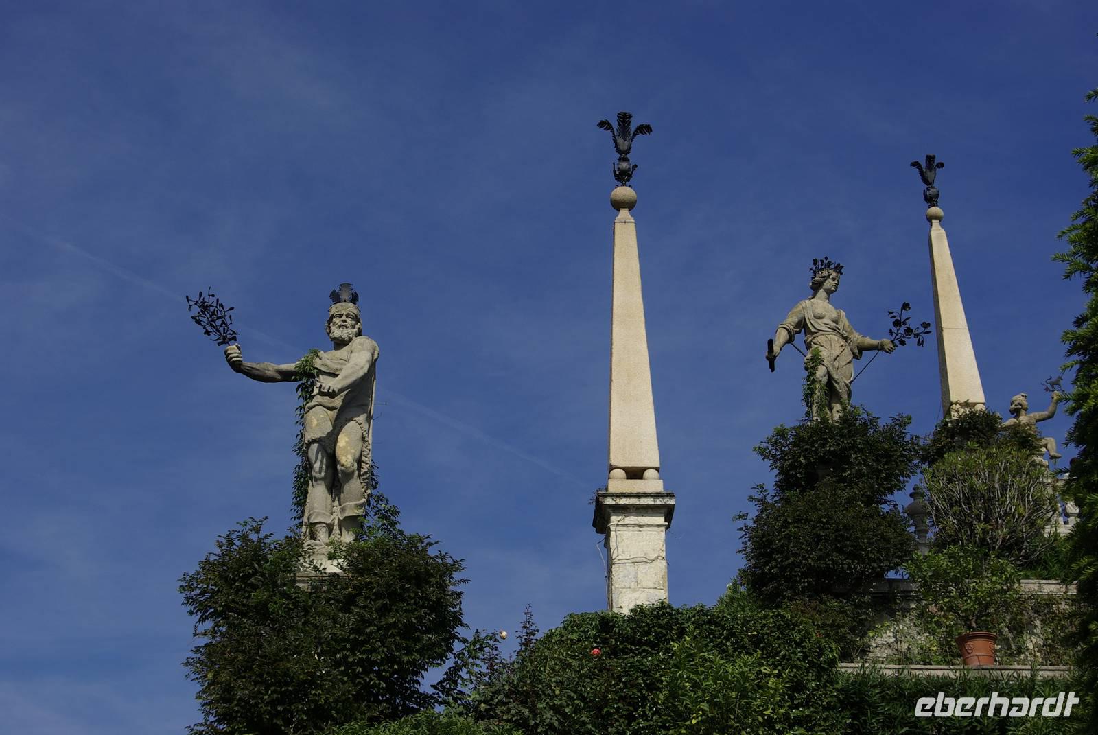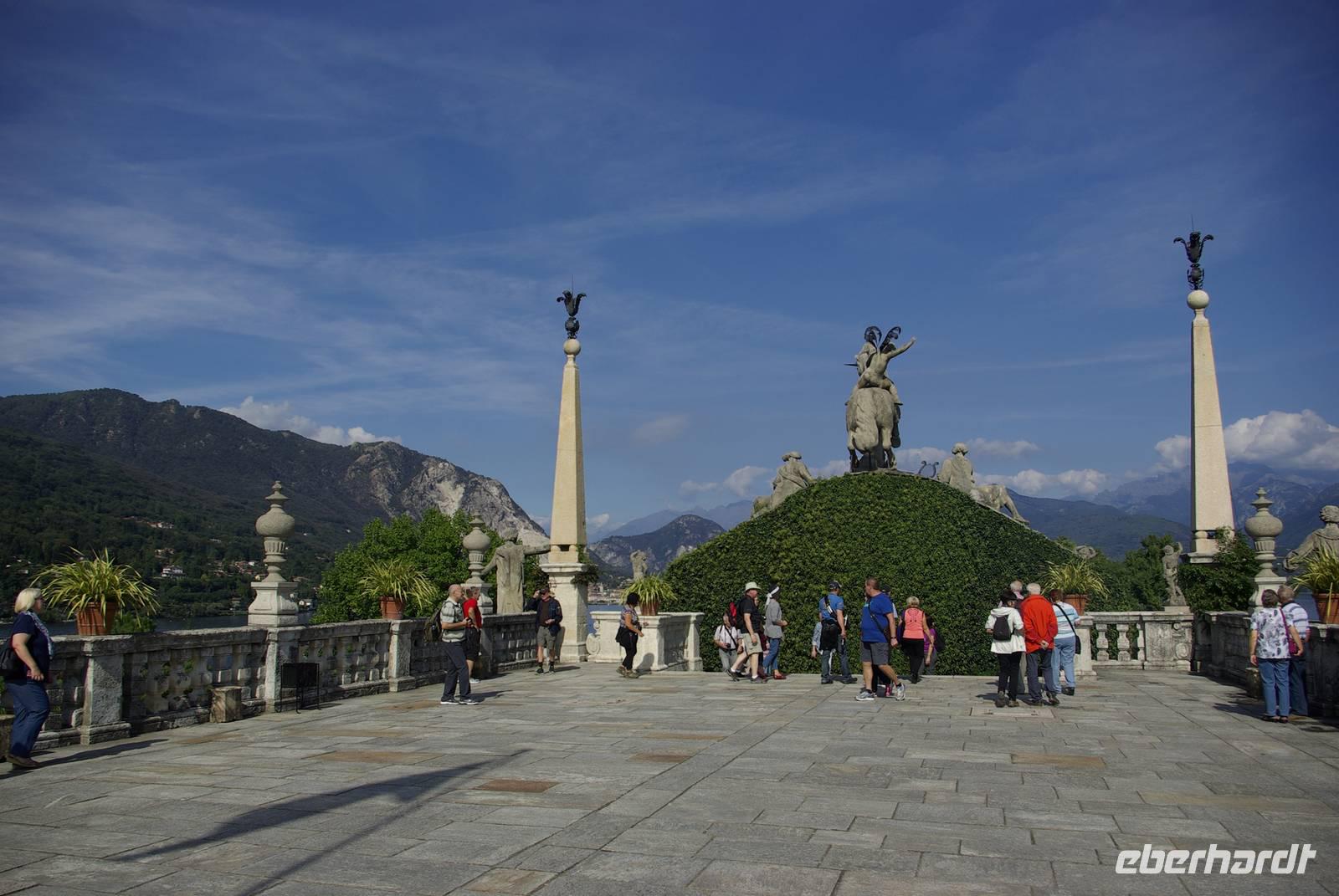 Nach dem Frühstück spazierten alle die paar Schritte zur Pizza di Lido hinter dem Hotel, wo bereits zwei Boote warteten, um uns auf die Isola Bella zu bringen.. Sie gehört zu den Borromäischen Inseln, einer Gruppe von fünf Binneninseln im italienischen Teil des Lago Maggiore. Sie liegen im Golf von Verbania, zwischen Verbania im Norden und Stresa im Süden und haben eine Gesamtfläche von 18 Hektar. Ihr Name leitet sich von der Familie Borromeo ab, in deren Besitz die Inseln seit dem zwölften Jahrhundert waren. Die Isola Bella, benannt nach der Comtesse Isabella Borromeo, war ursprünglich ein hauptsächlich unfruchtbarer Felsen. Zwischen 1650 und 1671 baute Vitaliano Borromeo auf der Insel einen attraktiven Sommerpalast. Er ließ große Mengen Erde auf die Insel bringen, um ein pyramidenartiges System von zehn Terrassen für den Garten zu errichten. Das unvollendete Gebäude beherbergt Gemälde von lombardischen Künstlern und flämische Teppiche. Von einem prächtigen Treppenhaus gelangt man in den Raum der Medaillen, der nach den runden Bildern an der Decke benannt ist. Dann folgen das Musikzimmer, ein Konferenzraum und das prächtige napoleonische Zimmer. Dort hat Napoleon eine Nacht verbracht. Ebenfalls sehenswert ist der große Bankettsaal. Auch die „Grotten" des Schlosses sind berühmt für die vielen Steine und die ausgestellten Korallen. Eine Führung machte uns mit den Details der Anlage vertraut und anschließend konnte man individuell das Gartenreich erkunden. Die Boote brachten uns dann zur Isola Madre, der größten Insel im Lago Maggiore. Die 220 Meter breite und 330 Meter lange Insel ist von einem historischen Gebäudeensemble, dem Palazzo Madre, und einer Parkanlage im Stil eines botanischen Gartens bedeckt. Ursprünglich hieß die Insel Isola di San Vittore. Historische Quellen erwähnen im 9. Jahrhundert eine Kirche auf der Insel, die dem heiligen Viktor geweiht war, sowie einen Friedhof. Zu dieser Zeit wurde auf der Insel Olivenöl zu sakralen Zwecken gewonnen.