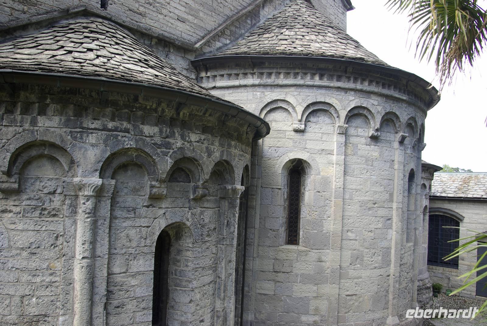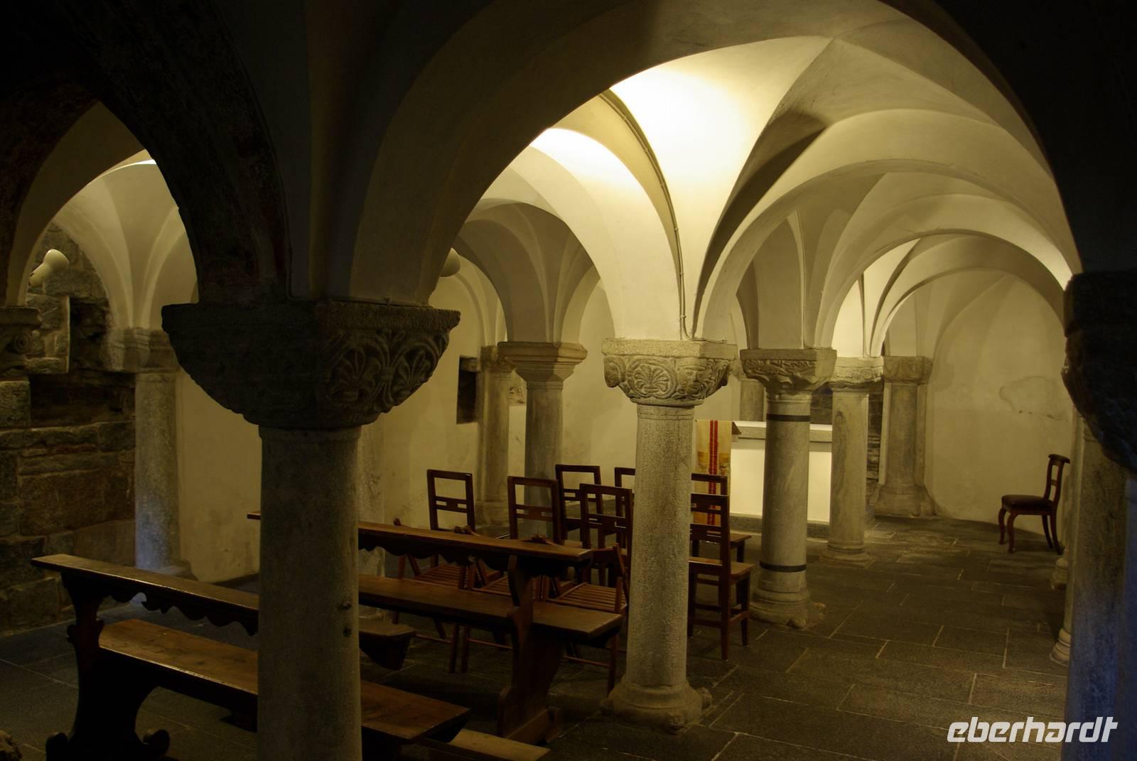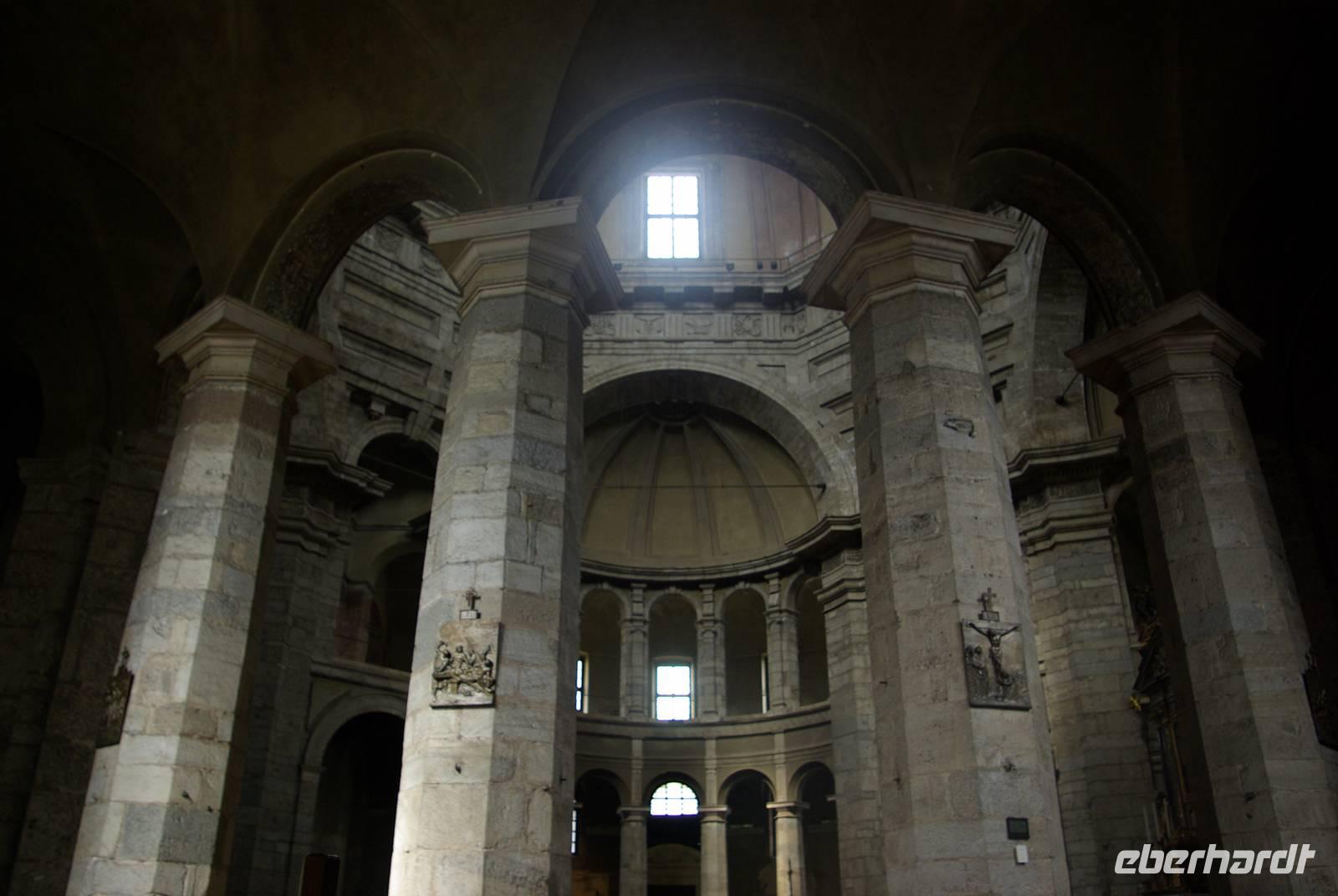 Wir fuhren mit einer kleinen Bahn vom Busbahnhof Orta hinunter zum See und mit einem Boot zur Insel, wo wir direkt vor der alten Klosterkirche anlandeten. Die dreischiffige Kirche mit romanischem Gepräge wurde im 12. Jahrhundert nach dem Vorbild der alten Kathedrale von Novara errichtet. Innen befindet sich ein wertvoller Ambo aus grünem Serpentinmarmor aus Oira, der von vier älteren Säulen getragen wird und ein Meisterwerk der romanischen Bildhauerei des 12. Jahrhunderts darstellt. Der Ambo ist mit den vier Symbolen der Evangelisten und Szenen des Kampfes zwischen Gut und Böse verziert.