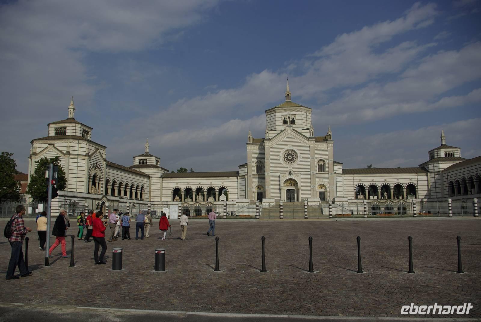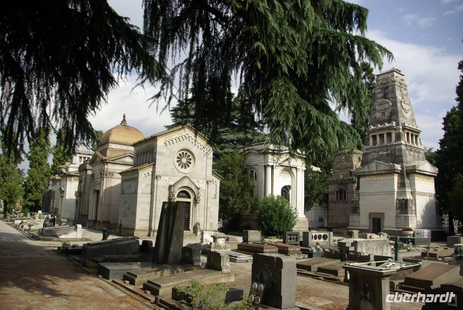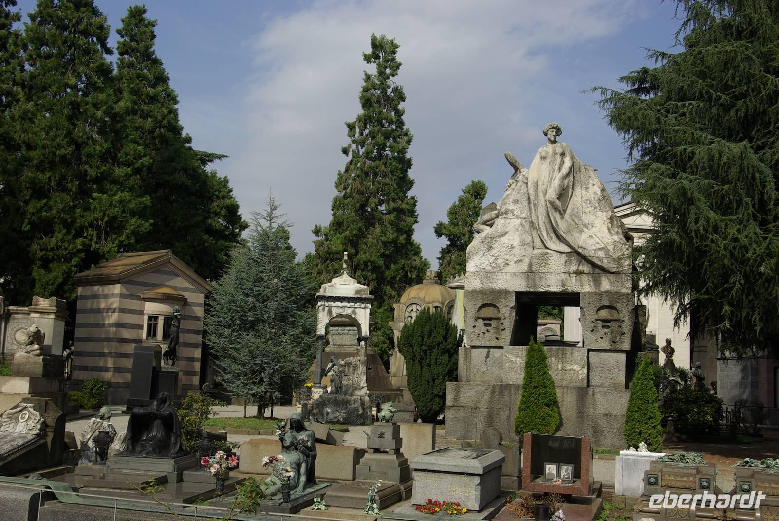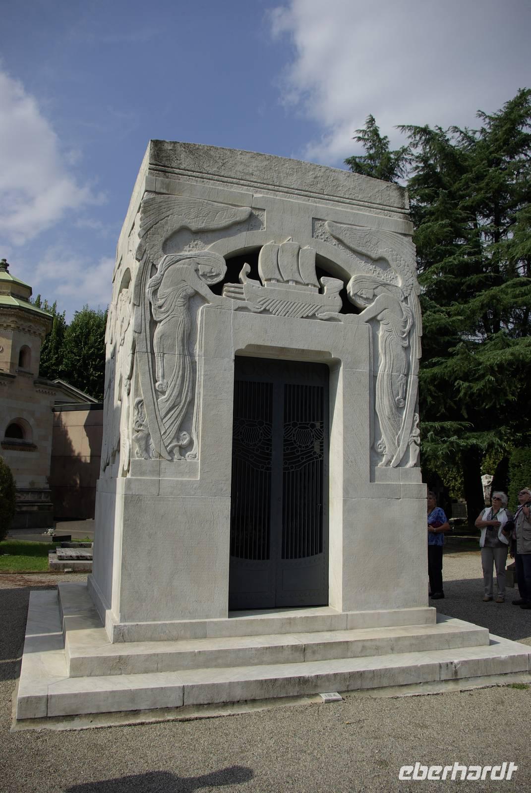 Noch im feuchten Nebel ging es um halbneun los nach Mailand, wo wir vor dem Monumentalfreidhof unsere Führerin Freda trafen, die uns zunächst mit der Geschichte der riesigen Anlage vertraut machte und uns zu schönen und interessanten Gräbern führte. Der Cimitero Monumentale von Mailand ist ein 1866 eröffneter Zentralfriedhof mit zahlreichen künstlerisch interessanten oder sonst berühmten Gräbern. Als Architekt fungierte Carlo Maciachini (1818-1899). Ein Ruhmestempel dient als Grabstätte für einige der berühmtesten Italiener. Von Interesse sind allerdings auch zahlreiche andere Grabstätten, in denen das Mailänder Großbürgertum sich gegenseitig an Prunk und Pomp zu übertreffen suchte. Zu nennen sind etwa die Gräber der Familien Falck, Bocconi, die Gründer des Warenhauskonzerns La Rinascente, sowie das der Familie Campari, die sich ein komplettes Abendmahl in Lebensgröße als Bronzeskulptur auf ihre Grabstätte stellen ließen. Ein weißer Jugendstiltempel aus Carraramarmor steht für die Familie des berühmten Dirigenten Arturo Toscanini, sowie sein Schwiegersohn Wladimir Horowitz. Für eine Zeit lang nahm die Grabstätte auch den Leichnam Giacomo Puccinis auf.