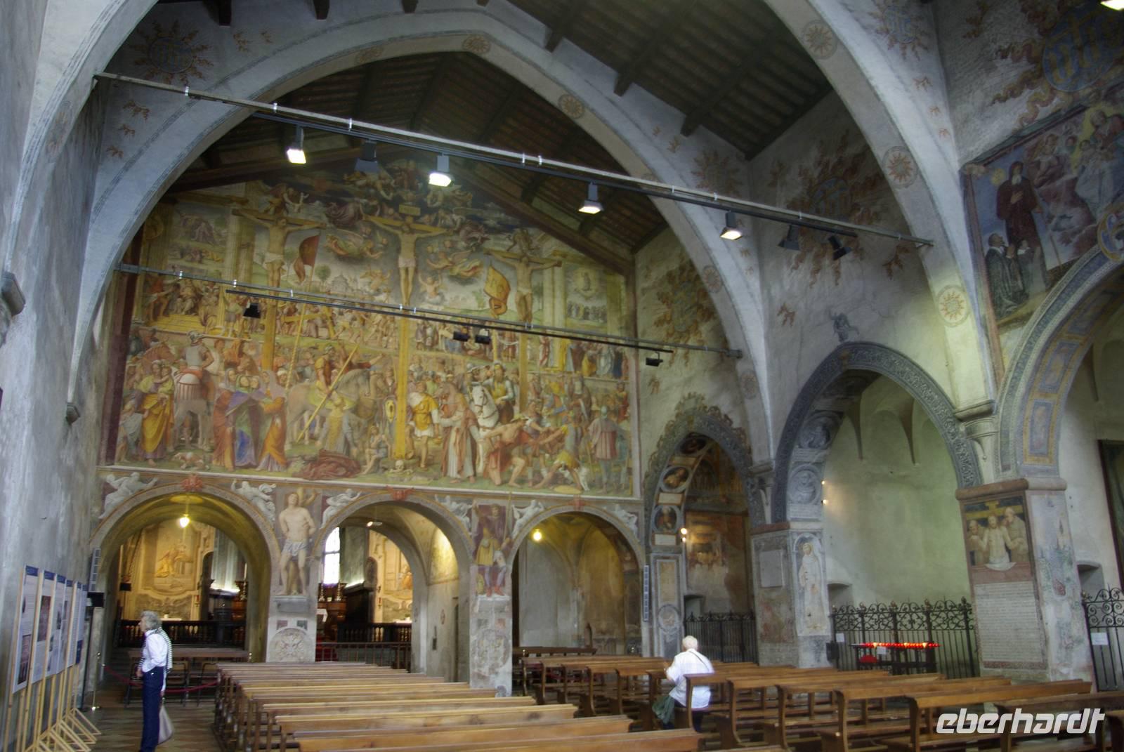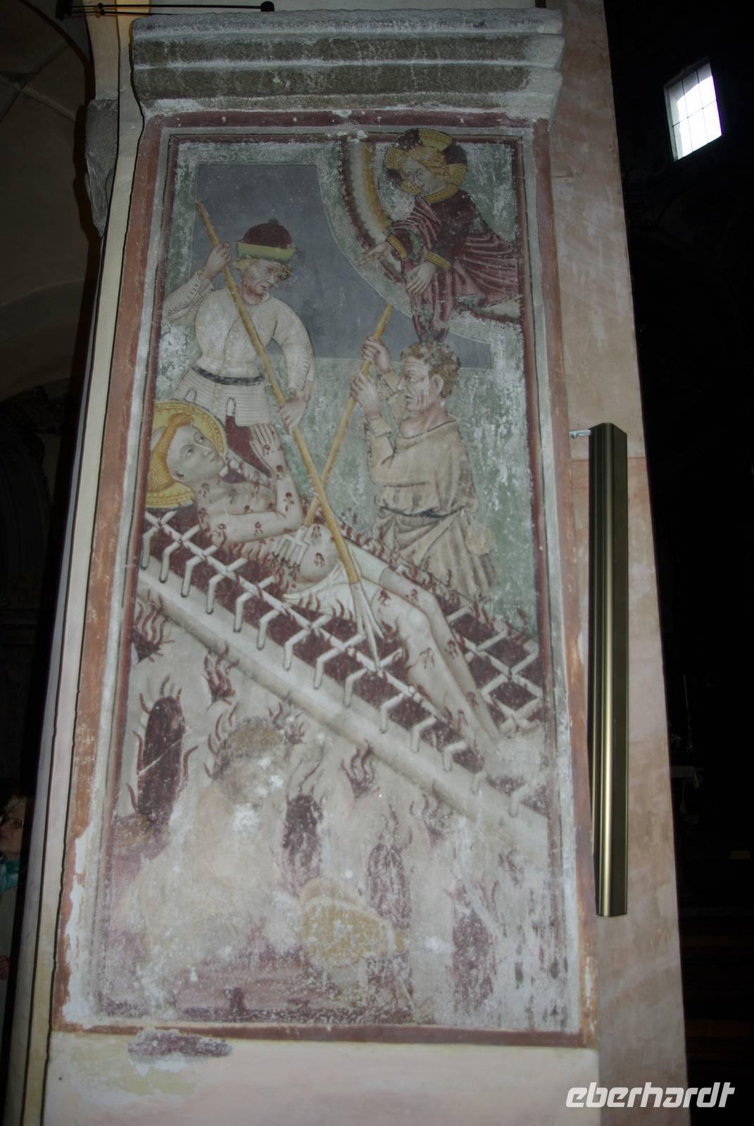 Zahlreiche Fresken bedecken einen Großteil der Wände in den Seitenschiffen, wo auch Kapitelle des 12. Jahrhunderts zu sehen sind. Das älteste Bild ist wahrscheinlich das mit dem Martyrium des hl. Laurentius auf einer Seite des zweiten Pfeilers links. Ebenfalls an den Pfeilern erkennt man die Bilder der Heiligen: Antonius der Große, Martin von Tours, Donninus, Christophorus, Elias, Julius, Audentius, Dorothea, Firmus, Apollonia, Nikolaus von Myra und Leonhard. Der Zyklus der Fresken im dritten Joch lässt sich ans Ende des 15. Jh. datieren; er umfasst: in den Kappen der Decke die Kirchenlehrer; unter dem Bogen Figuren von Heiligen; an der Wand in der Lünette die Geburt Christi und weiter unten die Cosmas und Damian an den Halbsäulen der Wand und in der Mitte davon die Figuren der Sebastian, Rochus, Jakob, Katharina von Alexandrien und Blasius, ein Fresko von 1486.