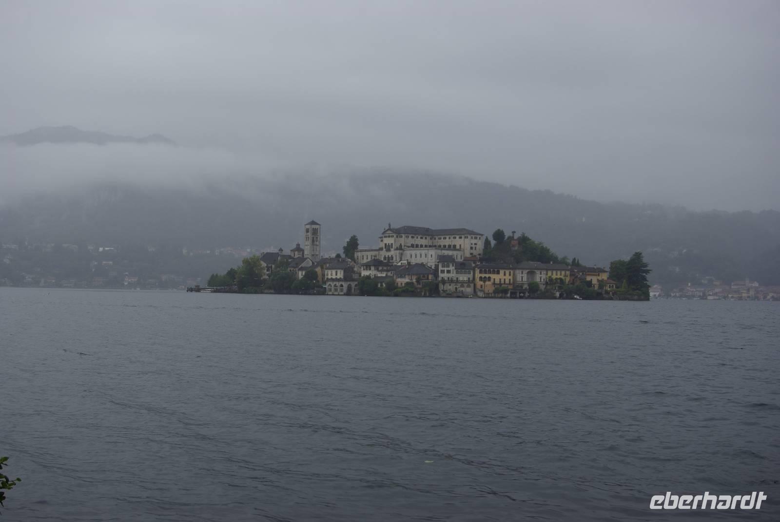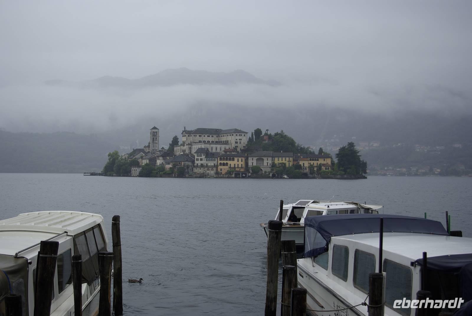 Am Mittwoch ging es nach dem Frühstück zum nahe gelegenen Ortasee. Er bedeckt bei 13,4 km Länge und 2,5 km Breite eine Fläche von 18,136 km². Gemessen an seinem Volumen von 1,286×106 m³ und einer größten Tiefe von 143 Metern ist er in beiden Kategorien der siebtgrößte See Italiens. In der Mitte des Sees liegt die Isola San Giulio, benannt nach dem griechischen Diakon Julius, der hier am Ende des 4. Jahrhunderts lebte und eine kleine Kirche errichtete. Die Insel ist an der längsten Stelle 275 Meter lang, an der breitesten Stelle 143 Meter breit und hat einen Umfang von etwa 700 Meter. Im Mittelalter beherbergte sie vermutlich einen Sitz der Bischöfe von Novara und war als Festung ausgebaut. Auf der Insel thronen die Basilica di San Giulio, ein Nonnenkloster, die Abtei Mater Ecclesiae und ein Glockenturm.