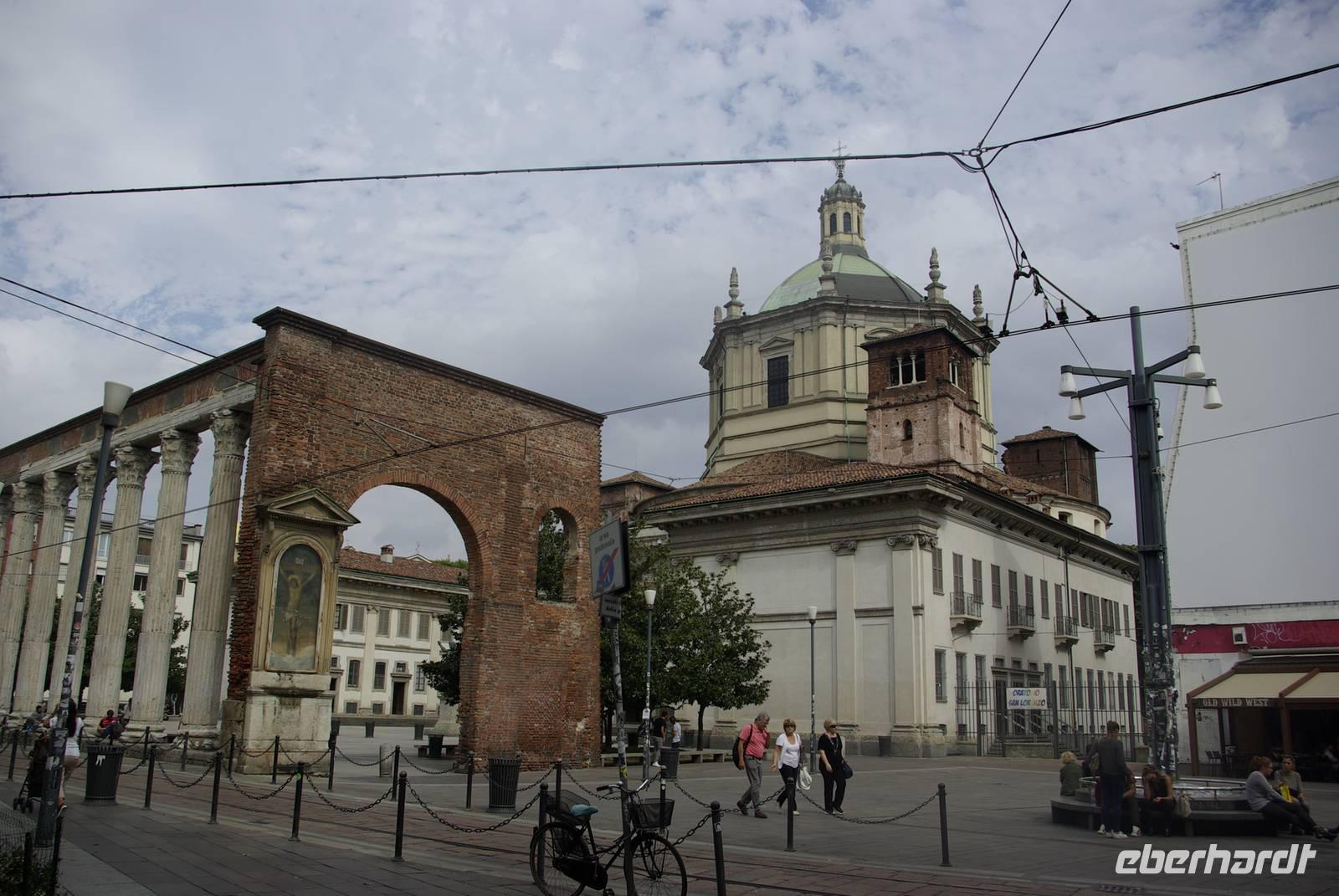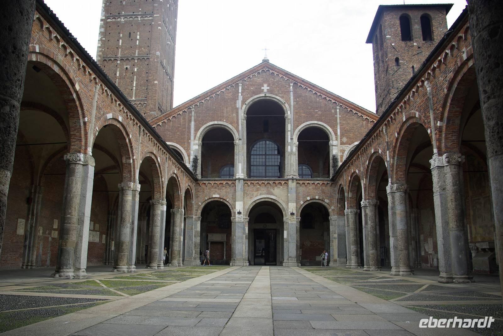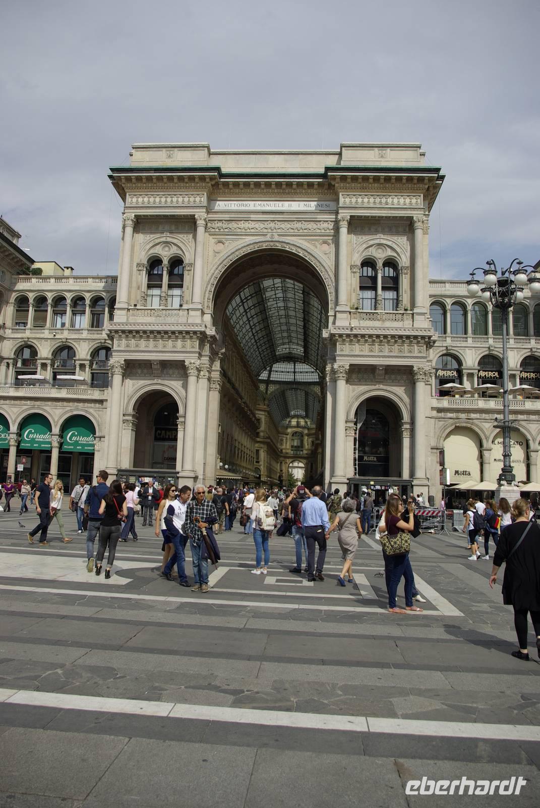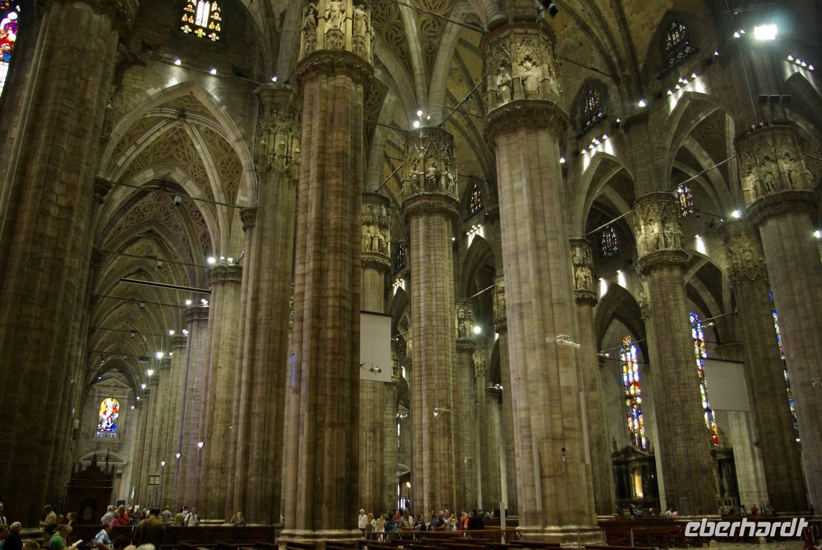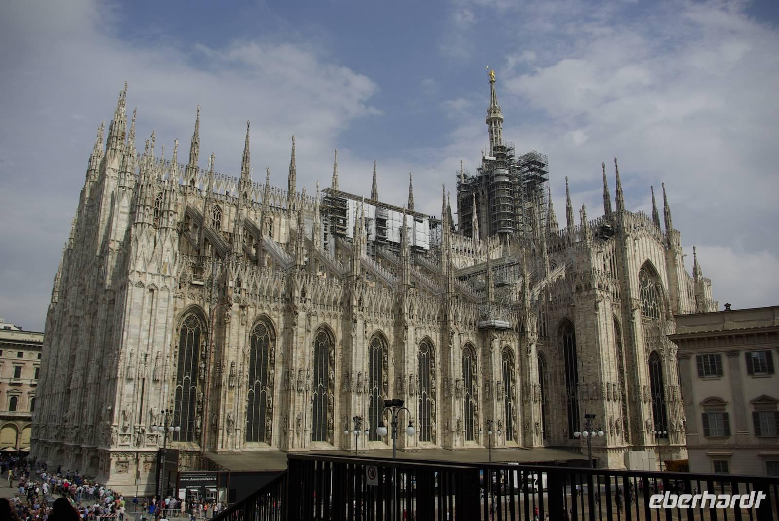 Architekturhistorischer Höhepunkt der Reise überhaupt war der Mailänder Dom als eines der berühmtesten Bauwerke Italiens und Europas. Er ist die Kathedrale des Erzbistums Mailand und nach dem Petersdom im Vatikan und der Kathedrale von Sevilla flächenmäßig die drittgrößte Kirche der Welt. Der fünfschiffige Bau ist 157 Meter lang und 109 Meter breit. Die hohen, farbenprächtigen Glasfenster des Chors gehören zu den größten der Welt und stellen eine Sehenswürdigkeit für sich dar. Das durch den hellen Marmor und die knapp 4000 Statuen einmalige Bauwerk wurde 1572 durch Karl Borromäus auf den Namen Santa Maria Nascente geweiht und trägt somit das Patrozinium Mariä Geburt. Der Stil des Kirchenbaus ist gotisch und stellt damit innerhalb der italienischen Architektur eine Ausnahme dar. Allerdings ist die Fassade, die erst unter Napoleon abgeschlossen wurde, eher als Mischung aus barocken und neugotischen Stilelementen anzusehen. Der große, repräsentative Domplatz wurde erst 1865-1873 geschaffen. Die Seitenwände des Domes stammen aus dem 15. bis 18. Jahrhundert und werden durch rhythmische fialengekrönte Strebepfeiler und hohe Fenster unterbrochen. Bei den Querschiffen sind die Strebepfeiler doppelt ausgeführt, hier führen im Inneren Treppen empor. Die Spitze ist mit feinem Zierwerk versehen und die Wände sind mit über 2000 Skulpturen und 135 Fialen ausgeschmückt, die einen Überblick geben über die Bildhauerkunst der Künstler und Handwerker dieser Zeit.