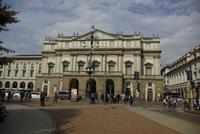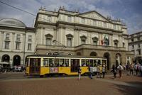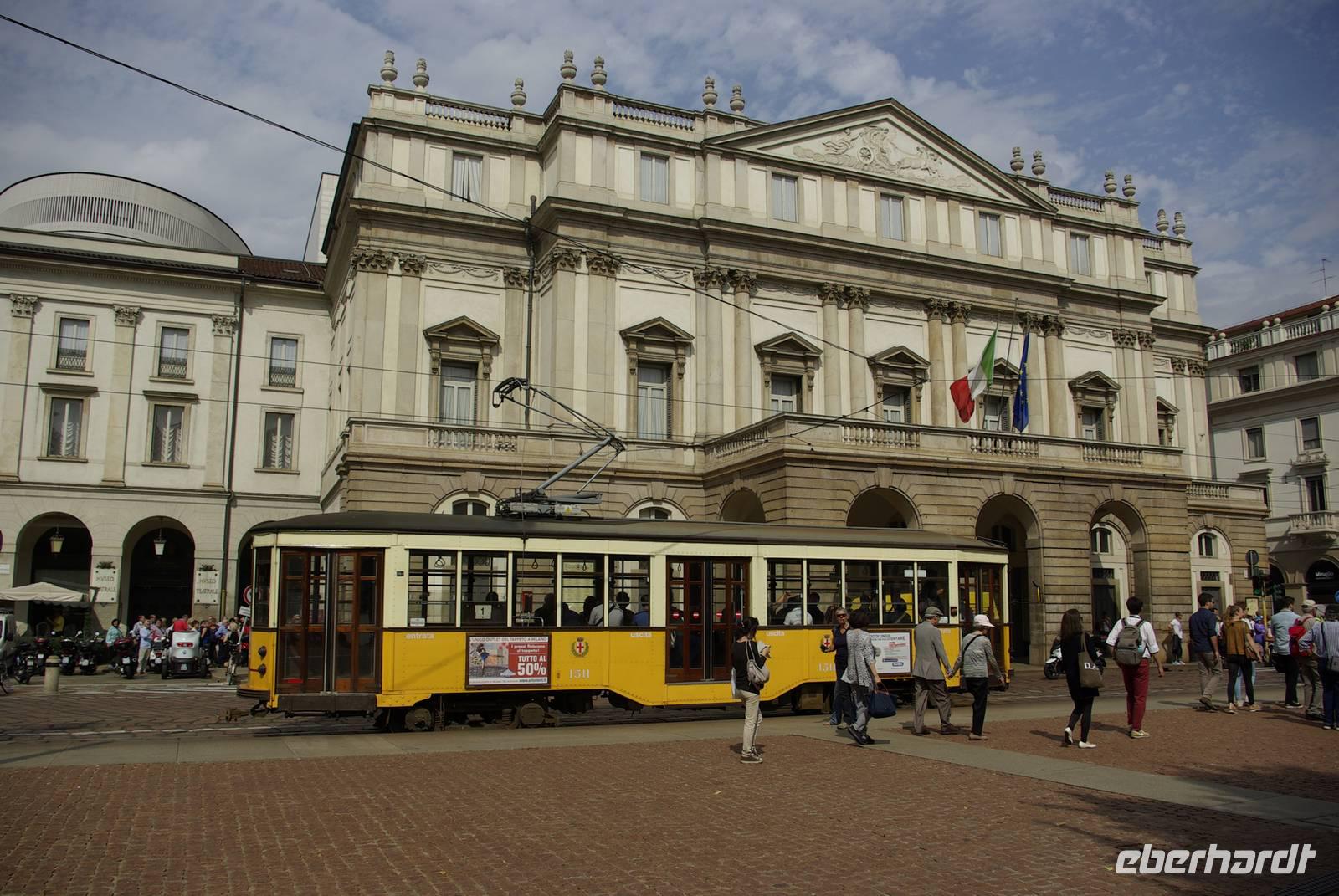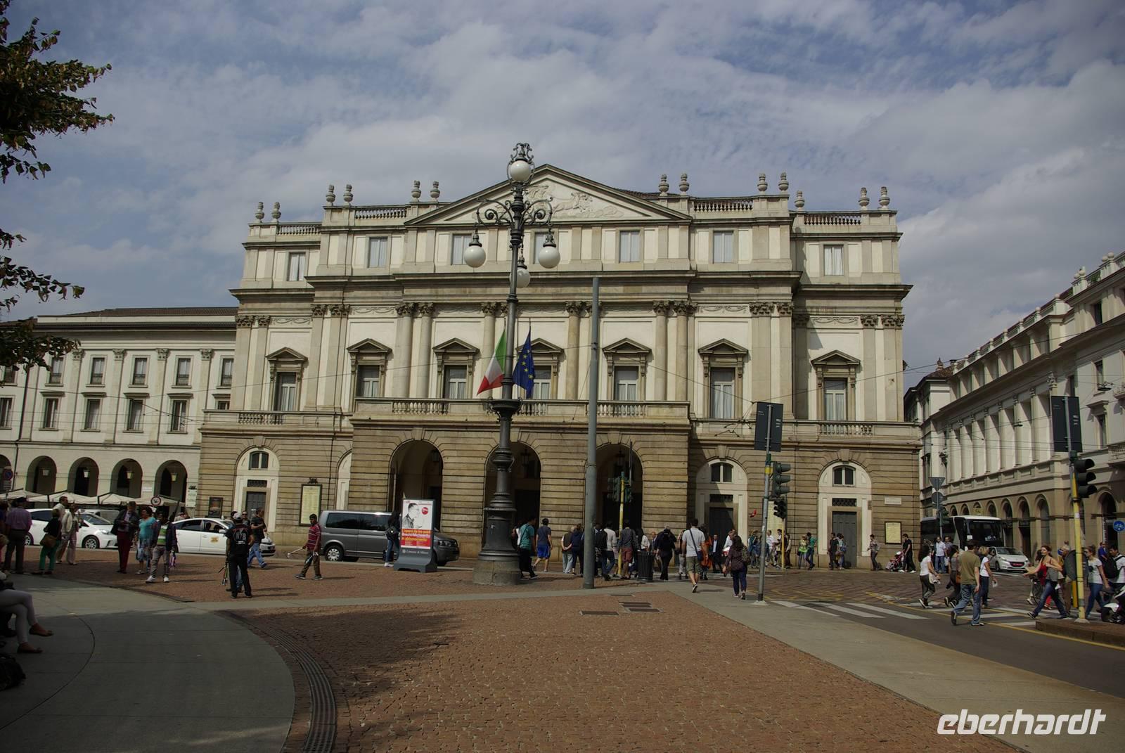 Mit dem Bus fuhren wir weiter ins alte Stadtzentrum zur Mailänder Scala. Der klassizistisch nüchterne Bau enttäuscht zunächst alle, die von diesem weltberühmten Opernhaus eine grandiose Architektur und vor allem reichlich Schmuck erwarten. Bei den sächsischen Gästen liegt der Vergleich mit dem Bau, wo laut TV-Werbung das Radeberger herkommt, recht nahe und fällt natürlich sehr zugunsten der Semperoper aus. Aber die Scala ist eines der bekanntesten und bedeutendsten Opernhäuser der Welt an der Piazza della Scala, der den Namen von der Kirche Santa Maria della Scala erhalten, die hier 1381 errichtet worden war und nach der Stifterin Beatrice Regina della Scala, der Frau von Bernabò Visconti, benannt wurde. Die Scala bietet Platz für rund 2.000 Zuschauer und ist der Nachfolgebau des 1776 abgebrannten Teatro Regio Ducale. Kaiserin Maria Theresia ließ in der Hauptstadt der damals österreichischen Lombardei für den Neubau die Kirche Santa Maria alla Scala abreißen und durch den klassizistischen Architekten Giuseppe Piermarini das eher schlicht wirkende neue Opernhaus in nur 23 Monaten errichten. Nach der schweren Beschädigung im Zweiten Weltkrieg war das legendäre Opernhaus in Rekordzeit wieder aufgebaut worden. Am 11. Mai 1946 wurde es mit einem Konzert unter Arturo Toscanini wiedereröffnet.
