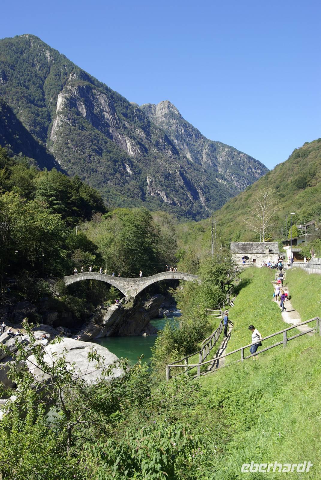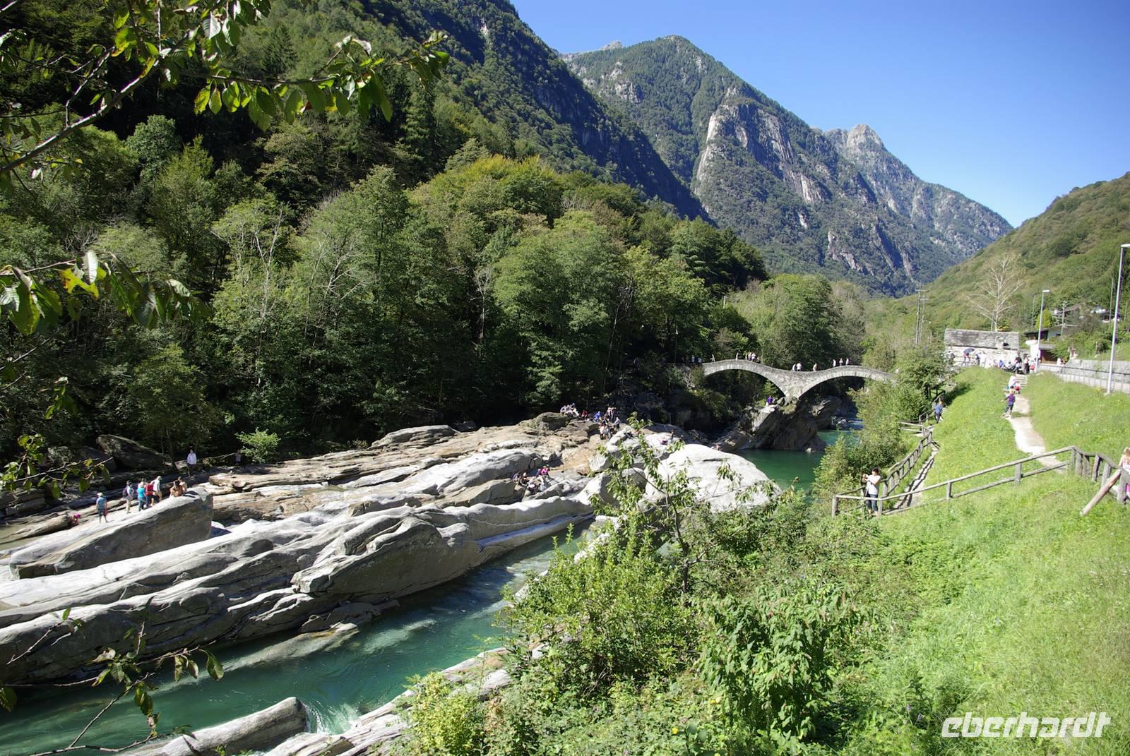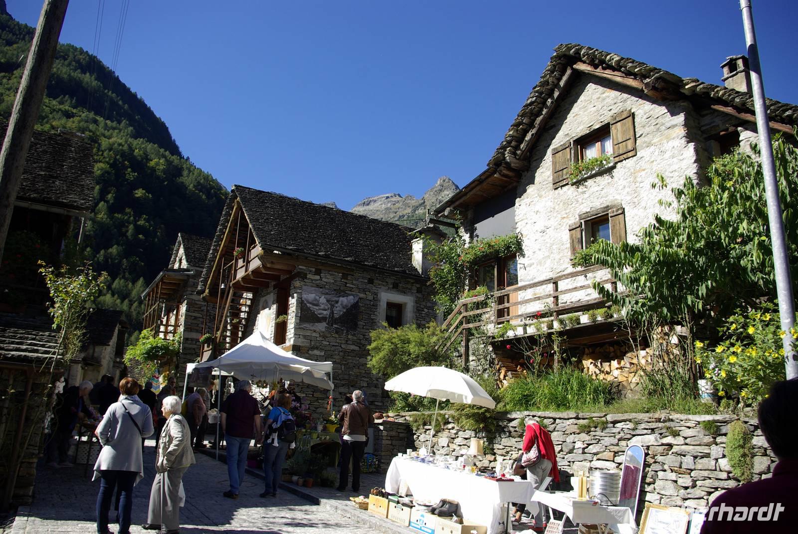 Gleich nach dem Frühstück fuhren wir ins noch urtümlich schroffe Verzascatal, ein wildes Tal mit steilen Hängen und unzähligen Wasserfällen. Die Rustici aus grauem Stein mit weißen Umrandungen an den Fenstern und schweren Steinplattendächern sind typisch für das Tal. Kapellen entlang der Wege zeugen vom religiösen Glauben der Bewohner.