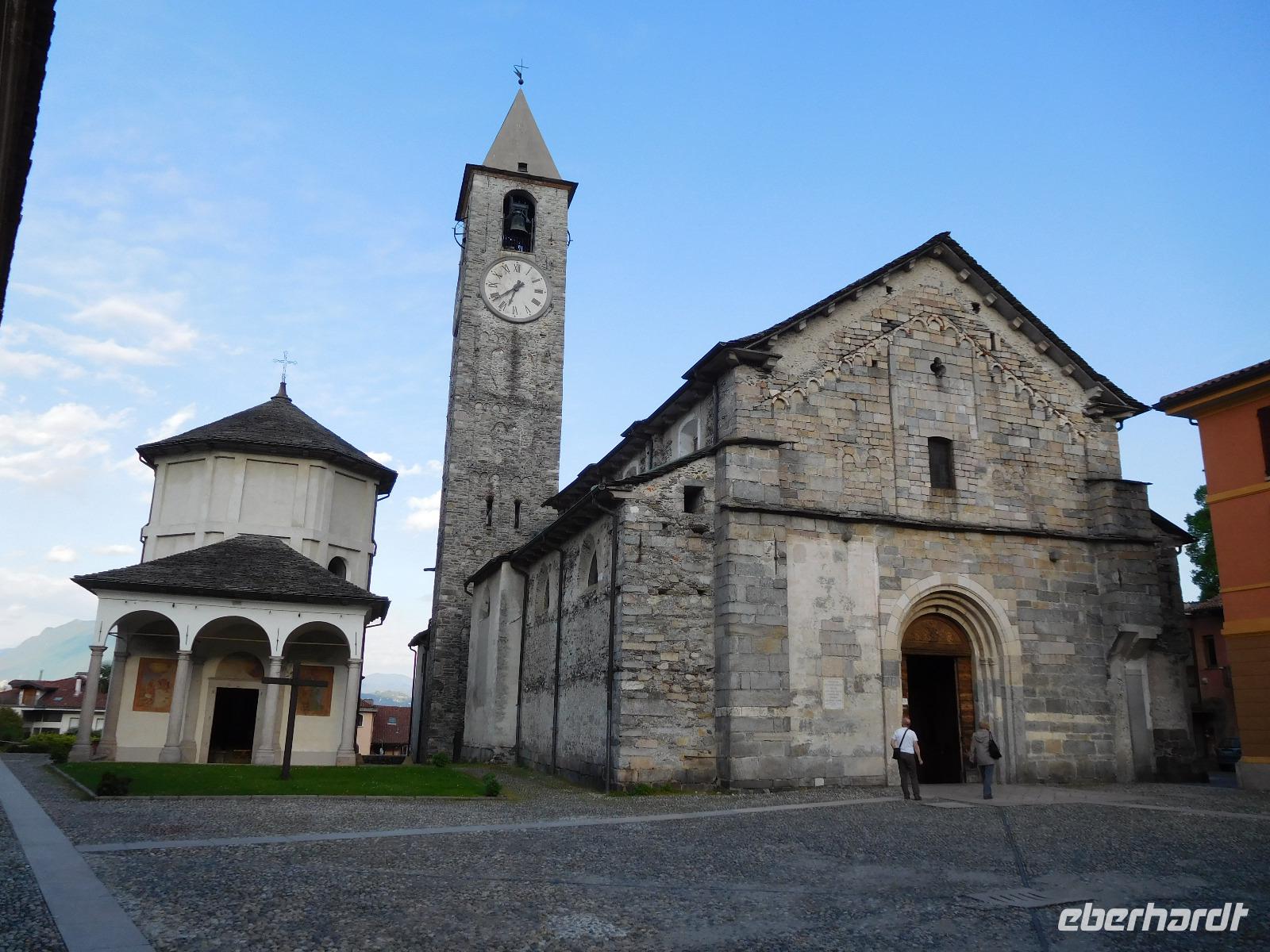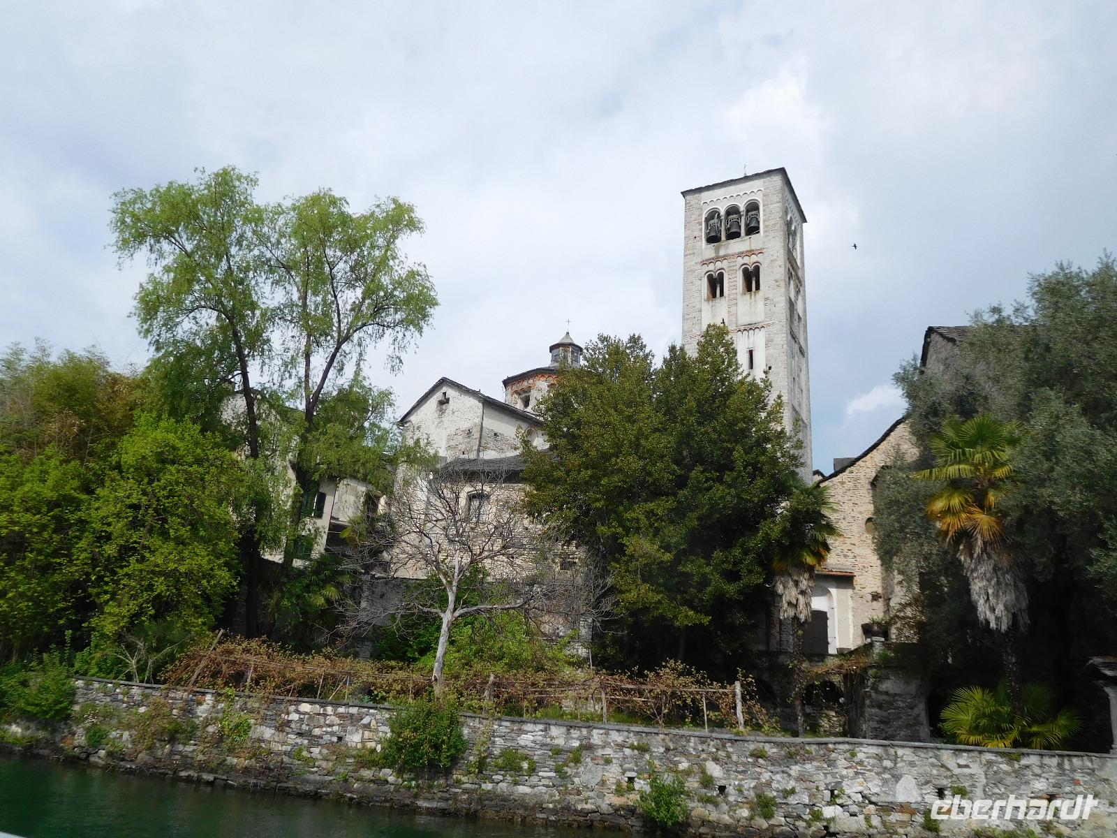 Wir fuhren mit einer kleinen Bahn vom Busbahnhof Orta hinunter zum See und mit einem Boot zur Insel, wo wir direkt vor der alten Klosterkirche anlandeten. Die dreischiffige Kirche mit romanischem Gepräge wurde im 12. Jahrhundert nach dem Vorbild der alten Kathedrale von Novara errichtet. Innen befindet sich ein wertvoller Ambo aus grünem Serpentinmarmor aus Oira, der von vier älteren Säulen getragen wird und ein Meisterwerk der romanischen Bildhauerei des 12. Jahrhunderts darstellt. Der Ambo ist mit den vier Symbolen der Evangelisten und Szenen des Kampfes zwischen Gut und Böse verziert.