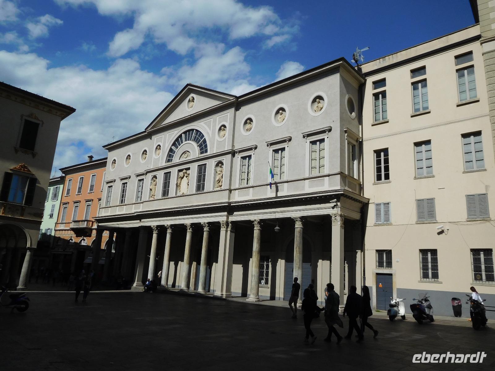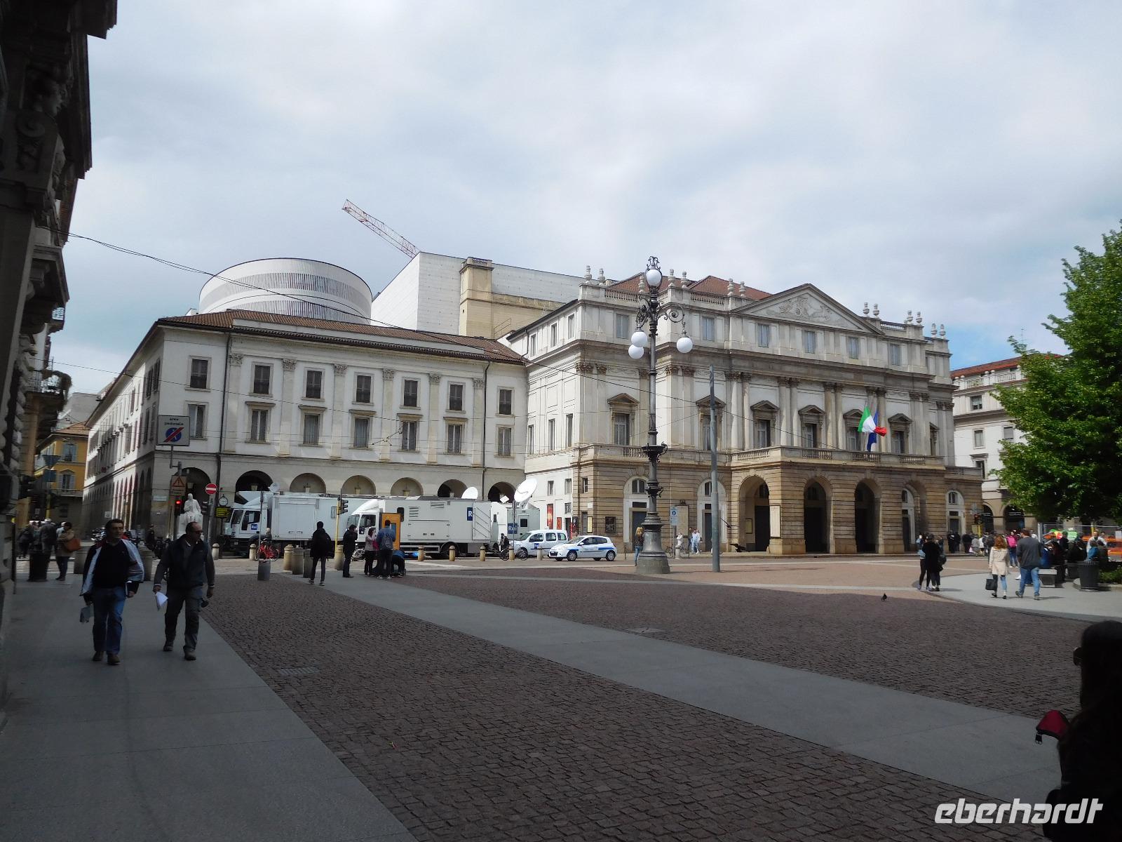 Mit dem Bus fuhren wir weiter ins alte Stadtzentrum zur Mailänder Scala. Der klassizistisch nüchterne Bau enttäuscht zunächst alle, die von diesem weltberühmten Opernhaus eine grandiose Architektur und vor allem reichlich Schmuck erwarten. Bei den sächsischen Gästen liegt der Vergleich mit dem Bau, wo laut TV-Werbung das Radeberger herkommt, recht nahe und fällt natürlich sehr zugunsten der Semperoper aus. Aber die Scala ist eines der bekanntesten und bedeutendsten Opernhäuser der Welt an der Piazza della Scala, der den Namen von der Kirche Santa Maria della Scala erhalten, die hier 1381 errichtet worden war und nach der Stifterin Beatrice Regina della Scala, der Frau von Bernabò Visconti, benannt wurde. Die Scala bietet Platz für rund 2.000 Zuschauer und ist der Nachfolgebau des 1776 abgebrannten Teatro Regio Ducale. Kaiserin Maria Theresia ließ in der Hauptstadt der damals österreichischen Lombardei für den Neubau die Kirche Santa Maria alla Scala abreißen und durch den klassizistischen Architekten Giuseppe Piermarini das eher schlicht wirkende neue Opernhaus in nur 23 Monaten errichten. Nach der schweren Beschädigung im Zweiten Weltkrieg war das legendäre Opernhaus in Rekordzeit wieder aufgebaut worden. Am 11. Mai 1946 wurde es mit einem Konzert unter Arturo Toscanini wiedereröffnet.