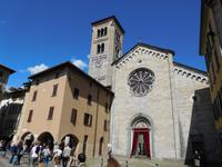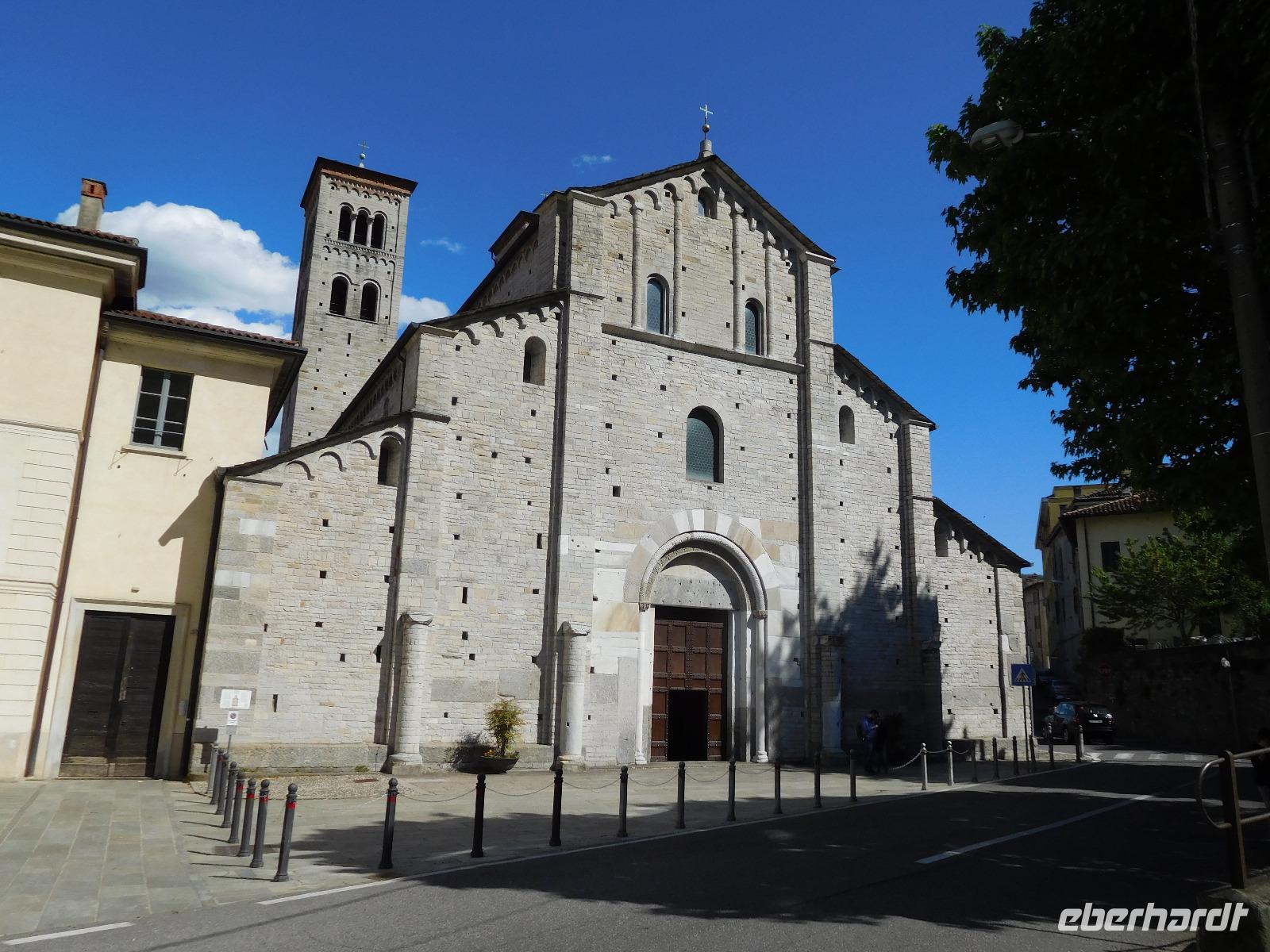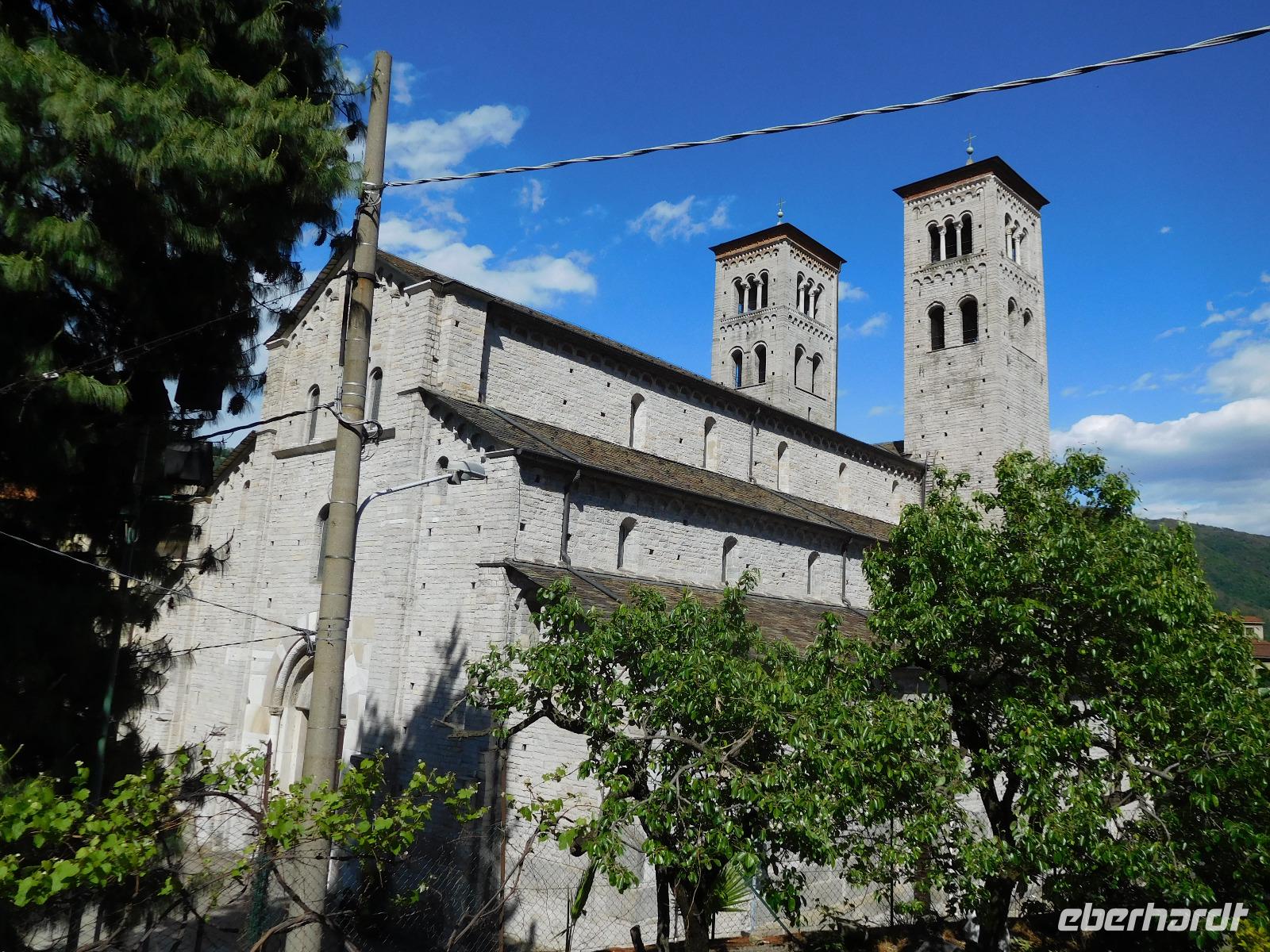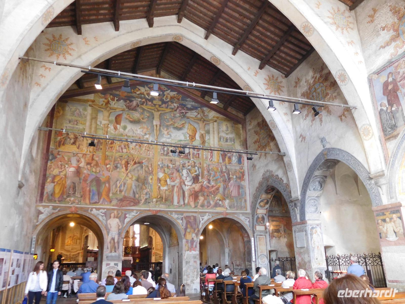 Einige Mitreisende wagten auch den Weg durch das alte Stadttor zur Kirche Sant'Abbondio, die älter ist, als der Dom. Ihr Langhaus wurde von 1022 bis 1095 errichtet, also zur Zeit der Ottonen, weshalb die Ähnlichkeit mit deutschen romanischen Gebäuden offensichtlich ist. Die Ornamentik erinnert sehr an die des Domes zu Speyer, der gleichzeitig gebaut wurde, so dass man hier von der gleichen Bauschule sprechen kann. Die beiden Türme weisen ebenfalls auf nordeuropäische Vorbilder hin, denn italienische Kirchen hatten zu dieser Zeit längst Campanile, also getrennte Glockentürme neben der Kirche. Der Innenraum mit seinen auffallenden Rundstützen verweist auf sein Vorbild Tournus in Burgund. Der Chor wurde über 100 Jahre nach dem Langhaus gebaut. Sein umfangreiches Freskenprogramm stammt aus der Mitte des 14. Jahrhunderts und seine Themen sind das Leben Christi und der Apostel Petrus und Paulus. Diese Malerei erinnert an die Giottos in der Toskana und in Umbrien, und tatsächlich werden diese Fresken einem Sieneser Meister zugeschrieben, der um 1350 diesen Stil in den Norden gebracht hat.