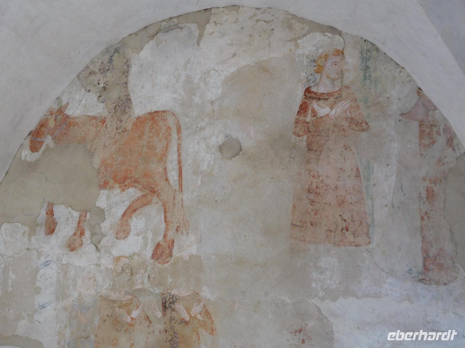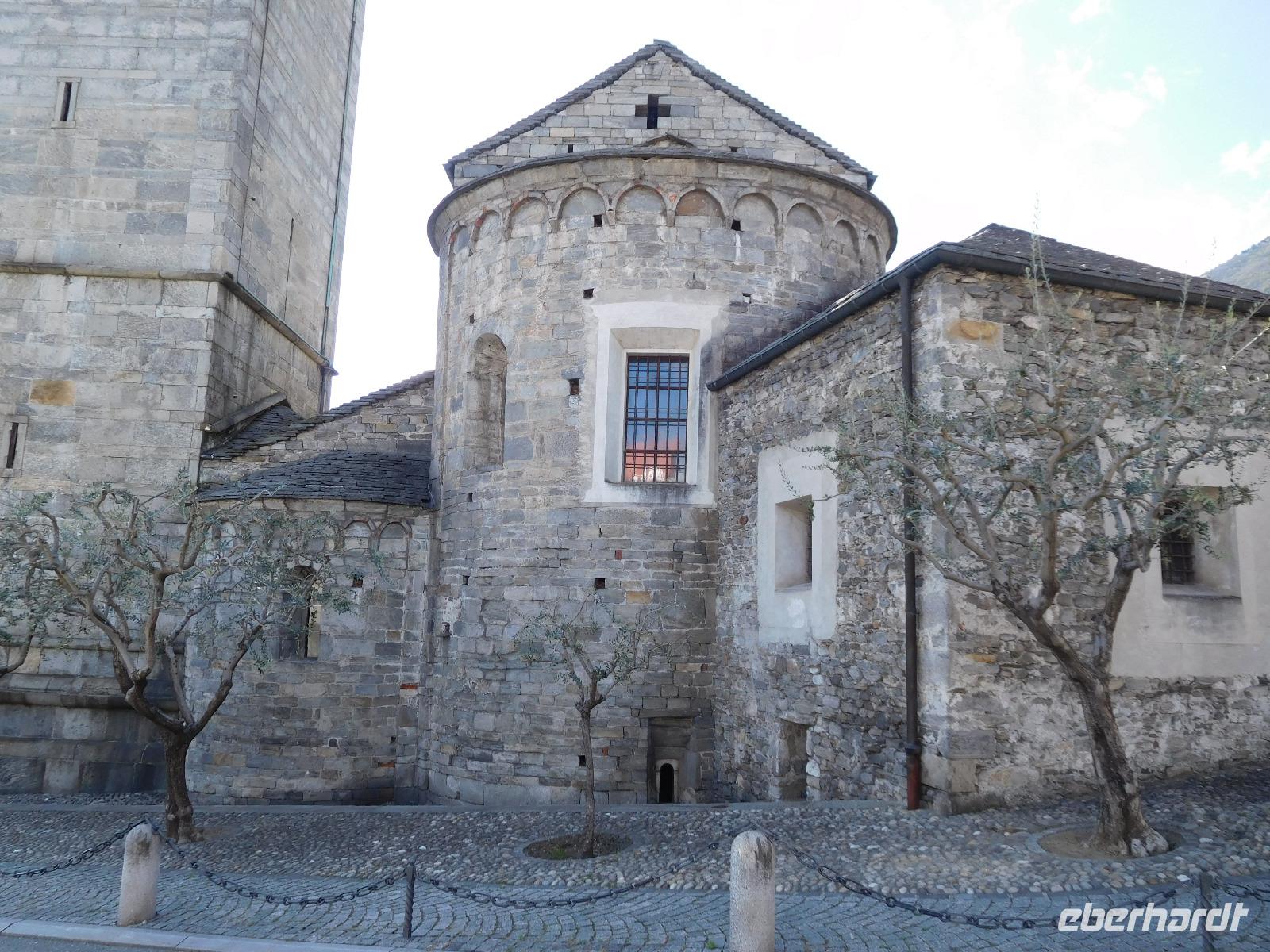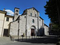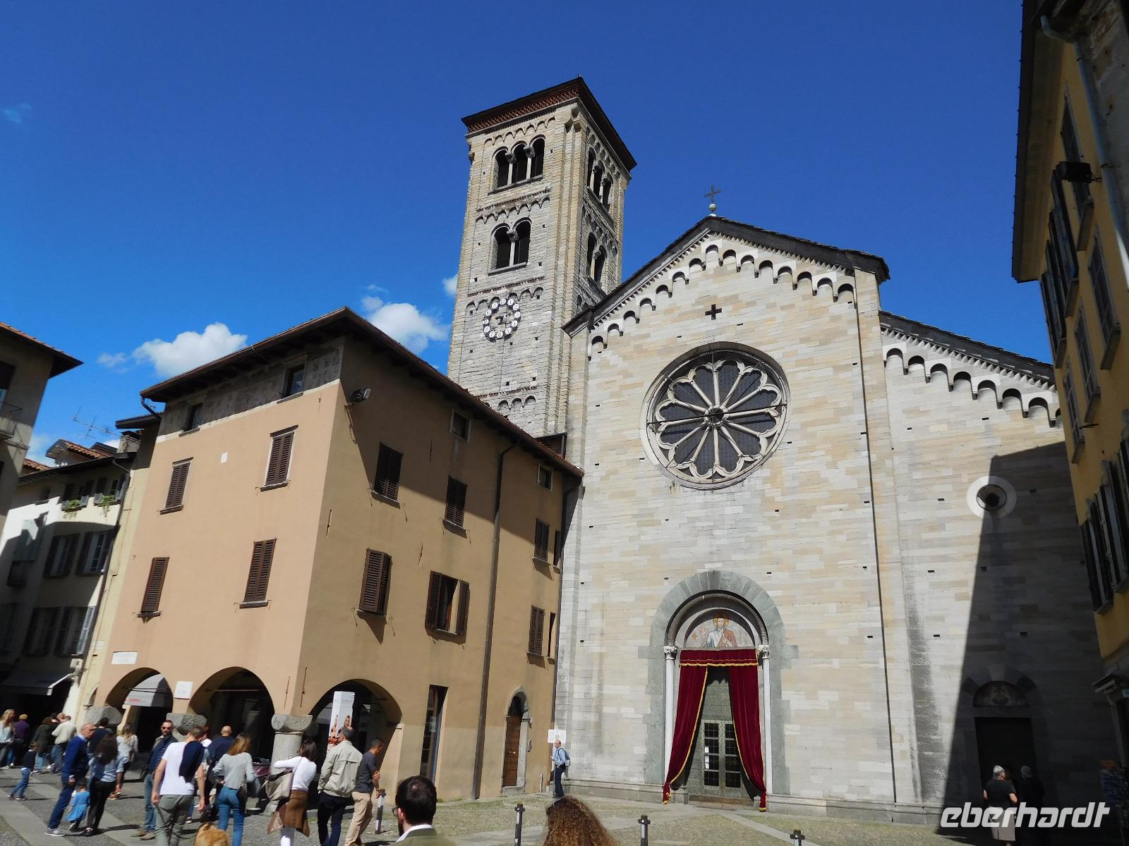 Einige Mitreisende wagten auch den Weg durch das alte Stadttor zur Kirche Sant'Abbondio, die älter ist, als der Dom. Ihr Langhaus wurde von 1022 bis 1095 errichtet, also zur Zeit der Ottonen, weshalb die Ähnlichkeit mit deutschen romanischen Gebäuden offensichtlich ist. Die Ornamentik erinnert sehr an die des Domes zu Speyer, der gleichzeitig gebaut wurde, so dass man hier von der gleichen Bauschule sprechen kann. Die beiden Türme weisen ebenfalls auf nordeuropäische Vorbilder hin, denn italienische Kirchen hatten zu dieser Zeit längst Campanile, also getrennte Glockentürme neben der Kirche. Der Innenraum mit seinen auffallenden Rundstützen verweist auf sein Vorbild Tournus in Burgund. Der Chor wurde über 100 Jahre nach dem Langhaus gebaut. Sein umfangreiches Freskenprogramm stammt aus der Mitte des 14. Jahrhunderts und seine Themen sind das Leben Christi und der Apostel Petrus und Paulus. Diese Malerei erinnert an die Giottos in der Toskana und in Umbrien, und tatsächlich werden diese Fresken einem Sieneser Meister zugeschrieben, der um 1350 diesen Stil in den Norden gebracht hat.