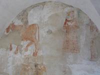 Zahlreiche Fresken bedecken einen Großteil der Wände in den Seitenschiffen, wo auch Kapitelle des 12. Jahrhunderts zu sehen sind. Das älteste Bild ist wahrscheinlich das mit dem Martyrium des hl. Laurentius auf einer Seite des zweiten Pfeilers links. Ebenfalls an den Pfeilern erkennt man die Bilder der Heiligen: Antonius der Große, Martin von Tours, Donninus, Christophorus, Elias, Julius, Audentius, Dorothea, Firmus, Apollonia, Nikolaus von Myra und Leonhard. Der Zyklus der Fresken im dritten Joch lässt sich ans Ende des 15. Jh. datieren; er umfasst: in den Kappen der Decke die Kirchenlehrer; unter dem Bogen Figuren von Heiligen; an der Wand in der Lünette die Geburt Christi und weiter unten die Cosmas und Damian an den Halbsäulen der Wand und in der Mitte davon die Figuren der Sebastian, Rochus, Jakob, Katharina von Alexandrien und Blasius, ein Fresko von 1486.