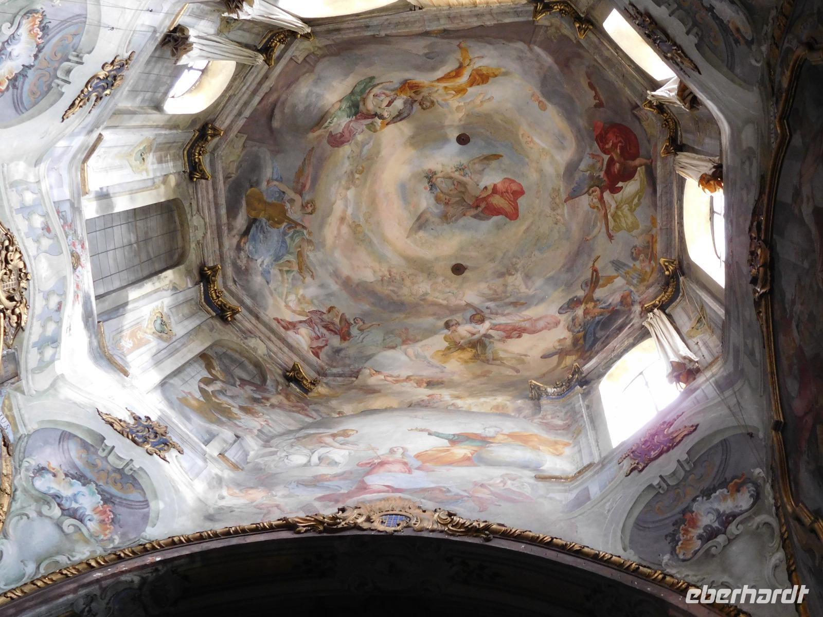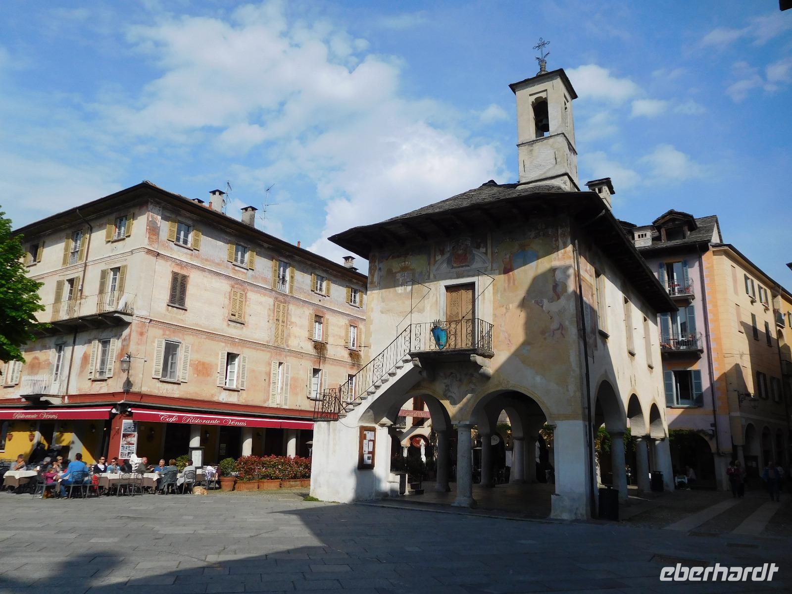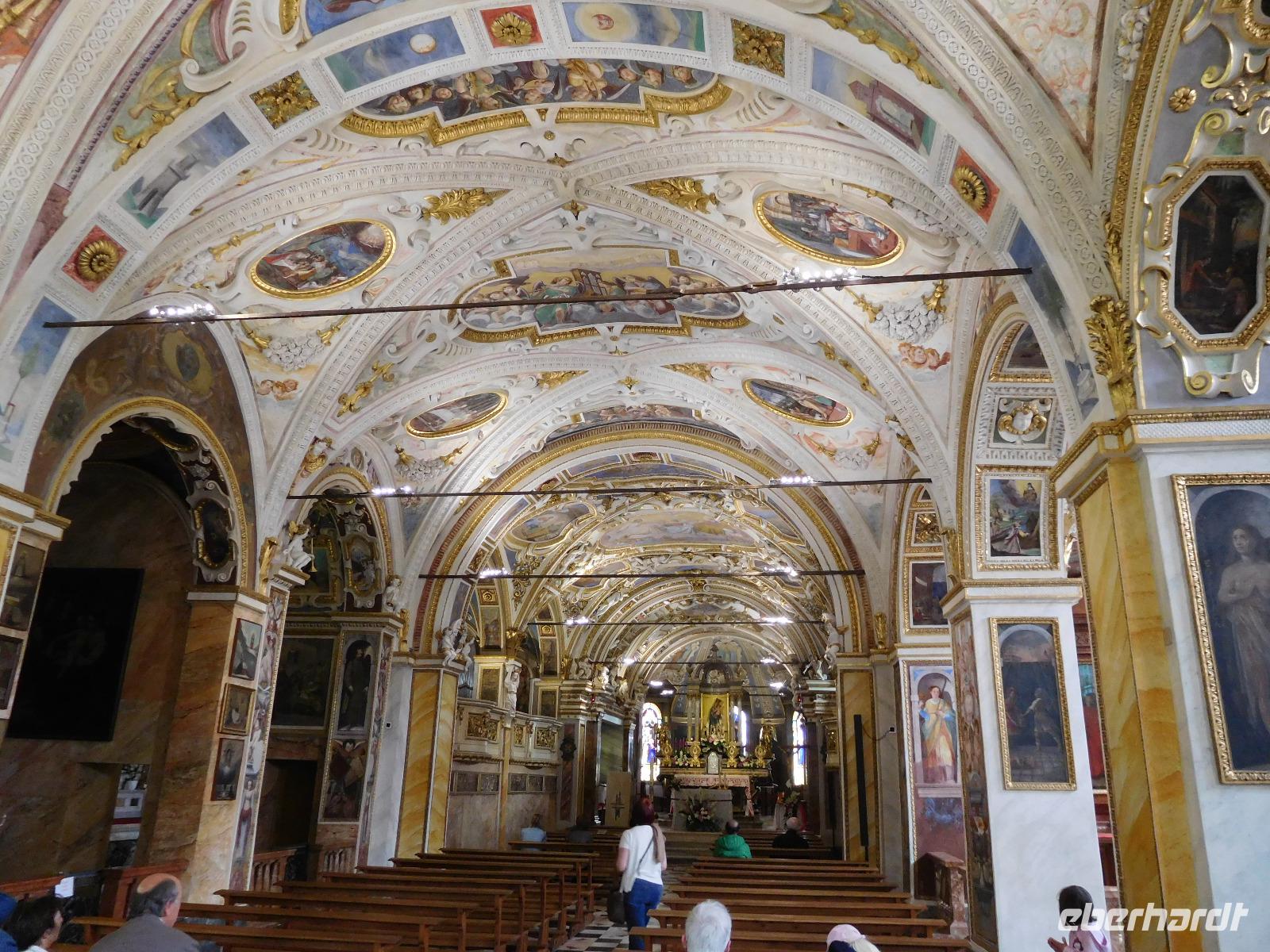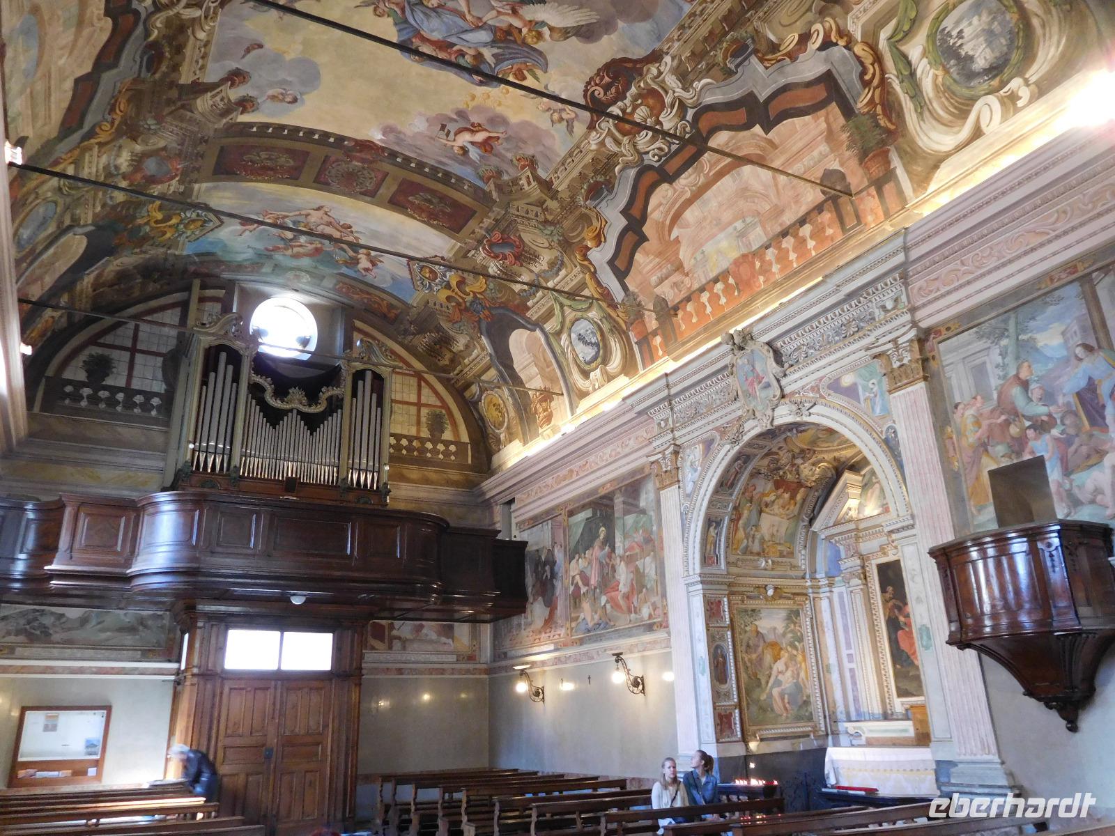 An der Wand des linken Schiffs finden wir ein großes Fresko mit der Darstellung der Dreieinigkeit in den Formen eines Gnadenthrons und im oberen Teil und Geschichten des heiligen Julius in der Form unterhaltsamer volkstümlicher Bilder im unteren Teil. Man konnte dann den so genannten Weg der Stille, der einmal rund um die kleine Insel führt gehen, bevor ein Boot uns wieder in den Hauptort brachte. Hier in Orta San Giulio galt es, den 400 Meter hohen Sacro Monte zu besteigen. Ein Kreuzweg mit zwanzig teilweise qualitätvoll ausgemalten Kapellen führt zum 1583 gegründeten Franziskanerkloster hinauf. In vielen Kapellen finden sich auch Gruppen lebensgroßer Terrakottafiguren, die wichtige Stationen der Passion Christi und aus dem Leben des hei8ligen Franziskus von Assisi darstellen. Fresken und Figuren geben einen interessanten Überblick über die norditalienische Kunst von der Renaissance bis zum Klassizismus. Das ganze Geschehen wurde duch mehrere Gruppen katholischer Pfadfinder aufgelockert. Die Jugendlichen eroberten die Landschaft mit Spiel und Gesang. Wer den ansteigenden Kapellenweg scheute, ließ es sich im hübschen Ort mit seinen engen Gassen und den netten Geschäften und Bars gut gehen oder erfreute sich einfach am Sonnenschein. Zurück in Stresa stiegen viele Gäste im Ortszentrum aus, während es sich andere im Hotel bis zum Abendessen gemütlich machten.