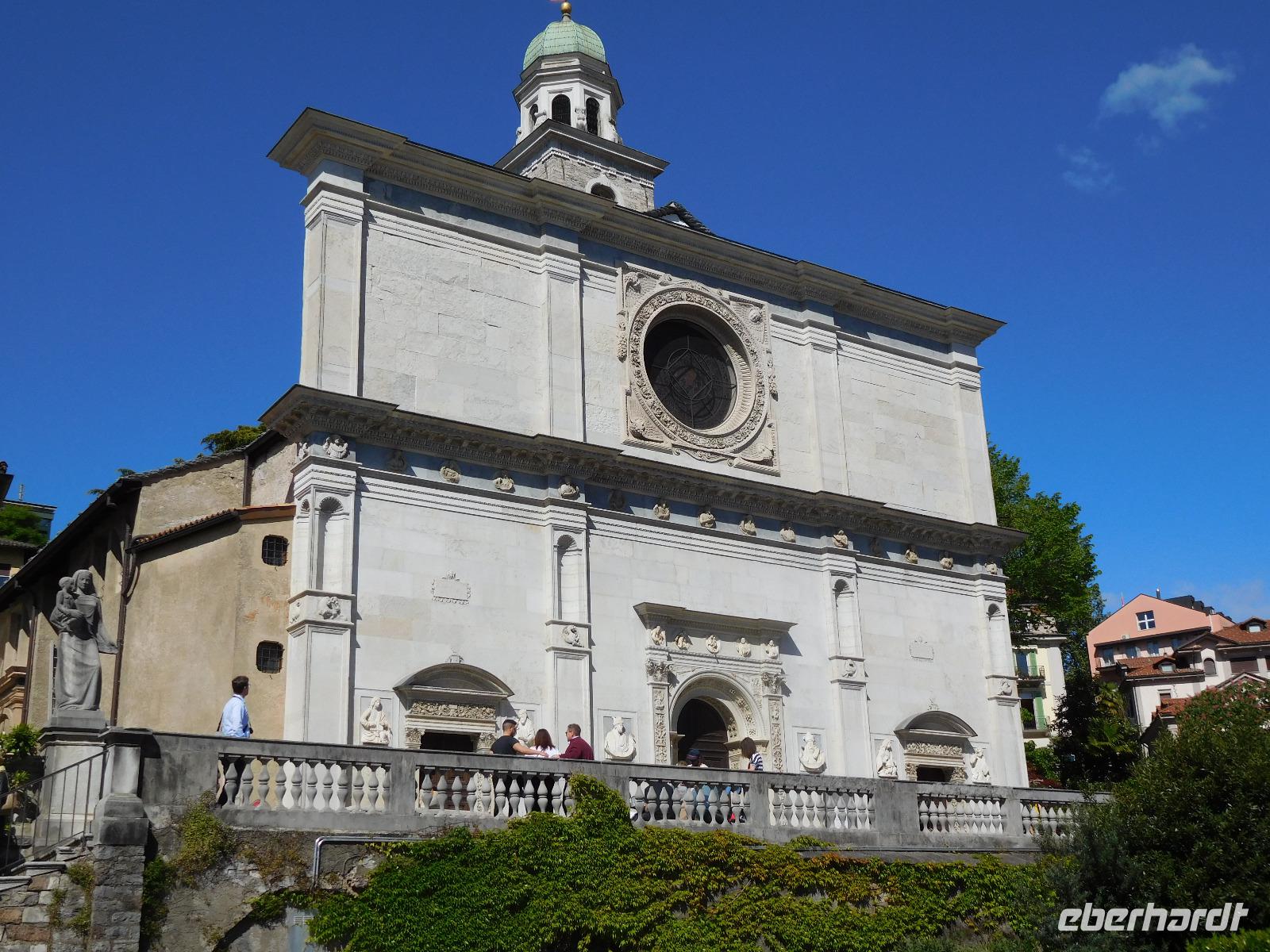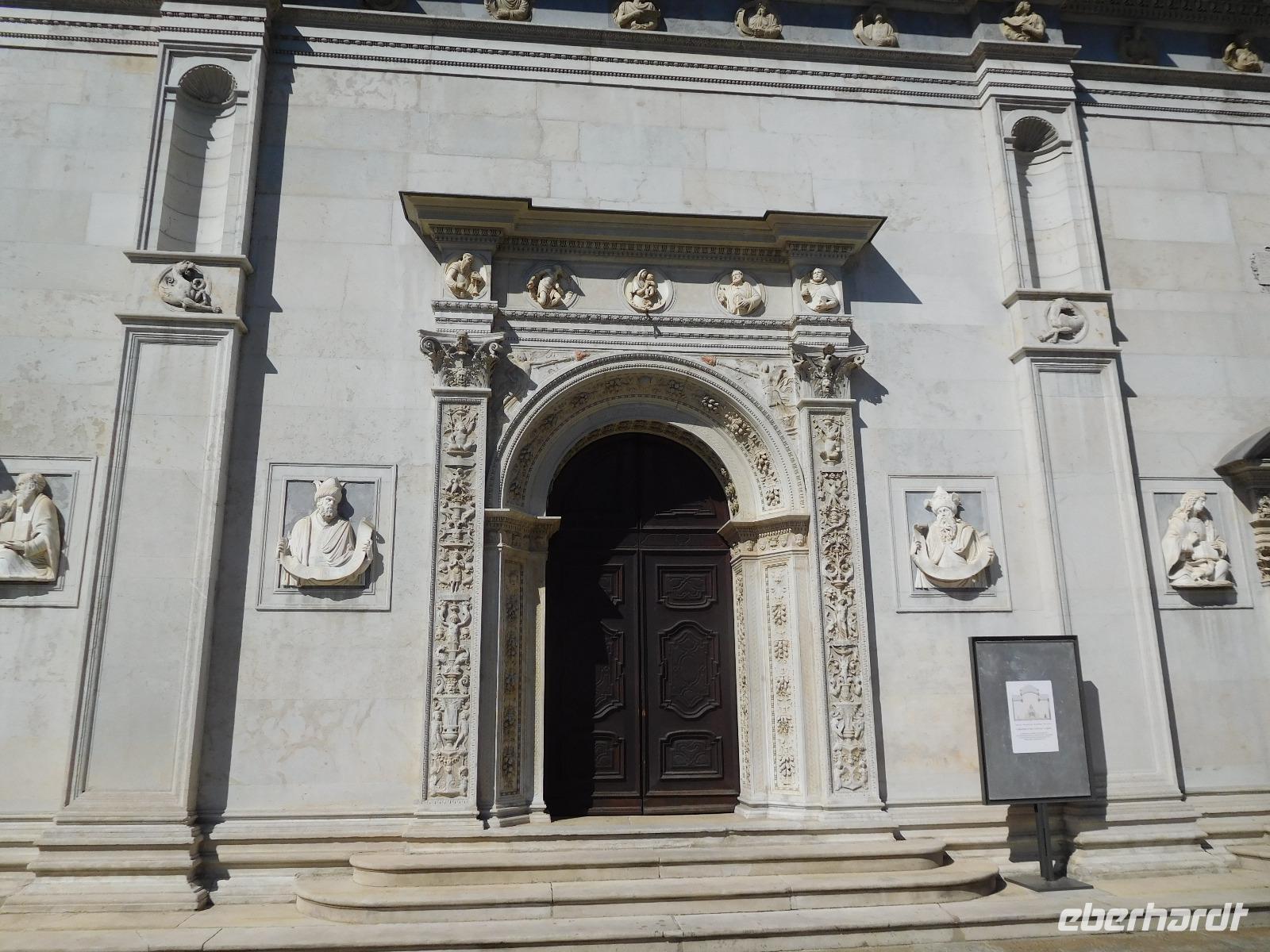 Unser Busfahrer ließ uns nahe der Kathedrale aussteigen, die wir gemeinsam mit dem Reiseleiter anschauen konnten. Der Bau wurde erst 1396 begonnen, die Fassade stammt aus der zweiten Hälfte des 15. Jahrhunderts, hat aber noch gotische Züge. Der plastische Schmuck des Comer Domes, der deutlich zur Renaissance gehört, wurde von Tommaso Rodari und seinen Brüdern um 1500 herum geschaffen. Zu beiden Seiten des Hauptportals sind, ungewöhnlich genug für eine christliche Kirche, die zwei heidnischen, in Como geborenen Schriftsteller Plinius der Ältere und der Jüngere verewigt, die beide in Como im 1. und 2. nachchristlichen Jahrhundert geboren wurden. Die Kuppeln wurden erst im 18. Jahrhundert vollendet. Damit gehört der Comer Dom zu den vielen bedeutenden Kirchen, an denen jahrhundertelang gebaut wurde, insgesamt von 1396 bis 1744.