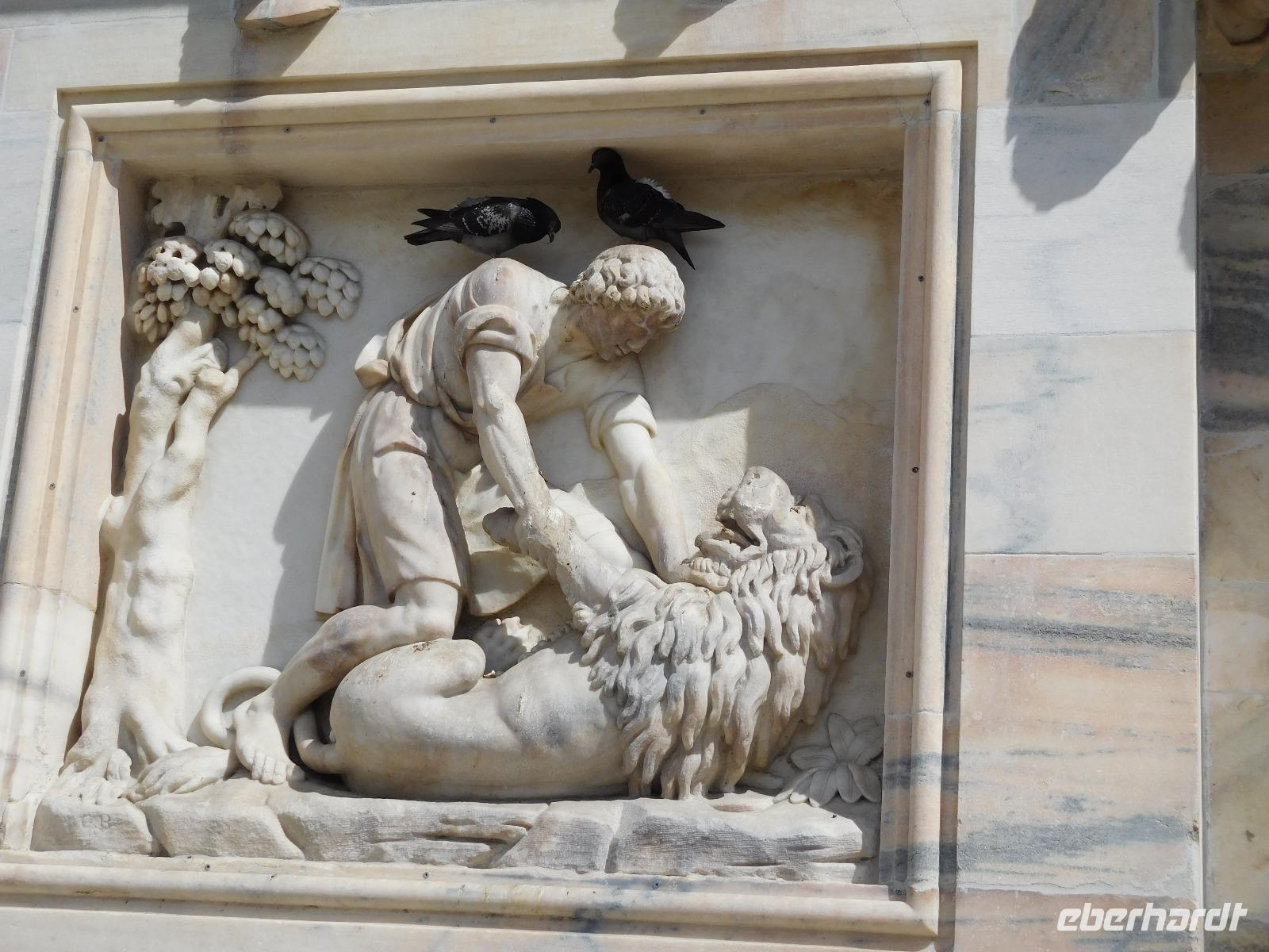 San Fedele liegt nicht weit weg vom Dom an derselben Straße und die meisten Gäste nahmen den Weg dorthin. Erbaut wurde diese Kirche im ausgehenden 12. Jahrhundert und von der mittelalterlichen Dekoration der Kirche sind noch einige Reste erhalten. Das imposant wirkende Nordportal liegt direkt zu der Straße vom Dom. Ganz links ist Daniel in der Löwengrube dargestellt, darüber Habakuk mit einem Engel. Das geflügelte Tier rechts wird teilweise als kämpfender Drache gedeutet, manchmal aber auch als geflügelter Löwe.