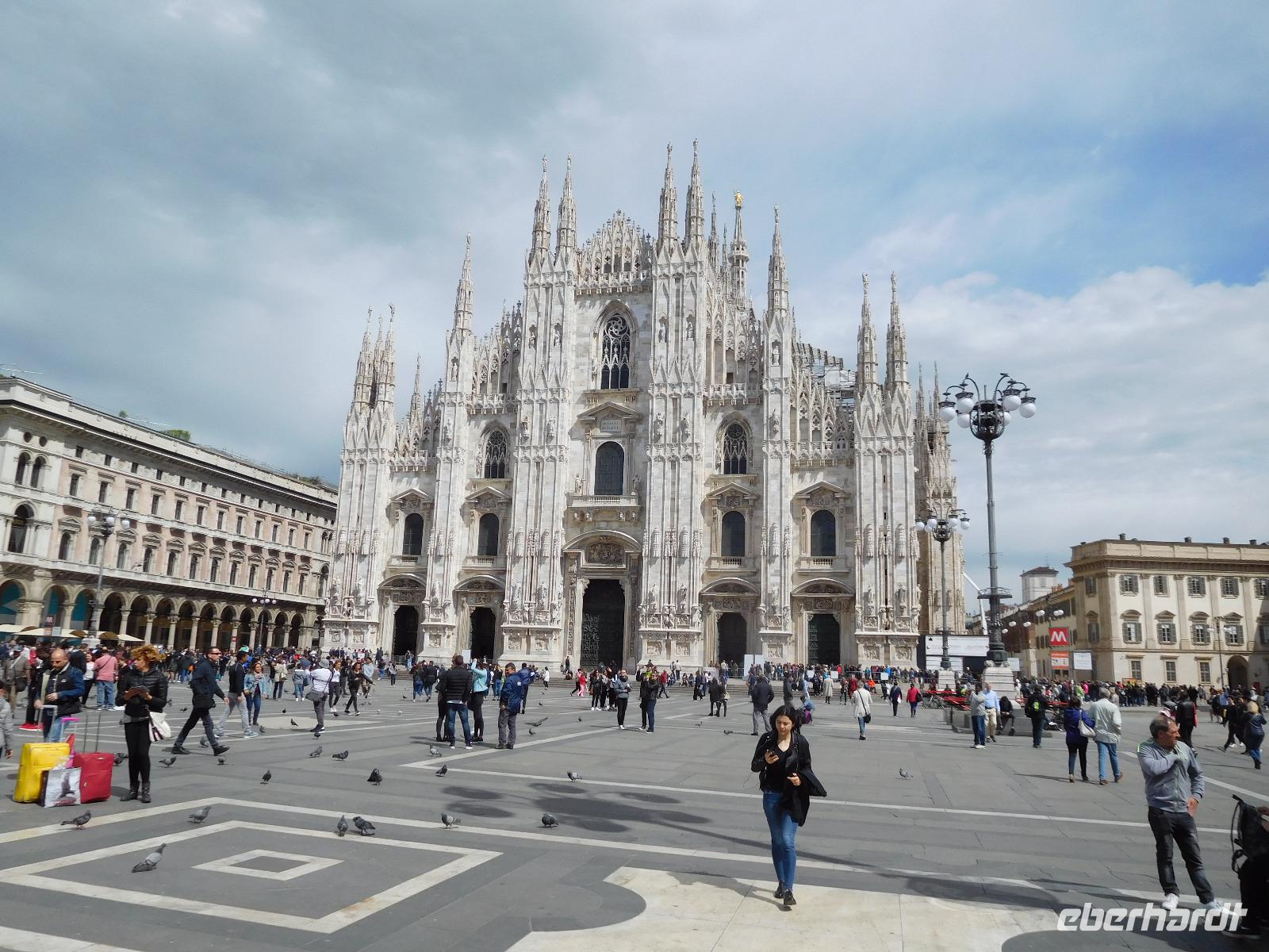 Architekturhistorischer Höhepunkt der Reise überhaupt war der Mailänder Dom als eines der berühmtesten Bauwerke Italiens und Europas. Er ist die Kathedrale des Erzbistums Mailand und nach dem Petersdom im Vatikan und der Kathedrale von Sevilla flächenmäßig die drittgrößte Kirche der Welt. Der fünfschiffige Bau ist 157 Meter lang und 109 Meter breit. Die hohen, farbenprächtigen Glasfenster des Chors gehören zu den größten der Welt und stellen eine Sehenswürdigkeit für sich dar. Das durch den hellen Marmor und die knapp 4000 Statuen einmalige Bauwerk wurde 1572 durch Karl Borromäus auf den Namen Santa Maria Nascente geweiht und trägt somit das Patrozinium Mariä Geburt. Der Stil des Kirchenbaus ist gotisch und stellt damit innerhalb der italienischen Architektur eine Ausnahme dar. Allerdings ist die Fassade, die erst unter Napoleon abgeschlossen wurde, eher als Mischung aus barocken und neugotischen Stilelementen anzusehen. Der große, repräsentative Domplatz wurde erst 1865-1873 geschaffen. Die Seitenwände des Domes stammen aus dem 15. bis 18. Jahrhundert und werden durch rhythmische fialengekrönte Strebepfeiler und hohe Fenster unterbrochen. Bei den Querschiffen sind die Strebepfeiler doppelt ausgeführt, hier führen im Inneren Treppen empor. Die Spitze ist mit feinem Zierwerk versehen und die Wände sind mit über 2000 Skulpturen und 135 Fialen ausgeschmückt, die einen Überblick geben über die Bildhauerkunst der Künstler und Handwerker dieser Zeit.