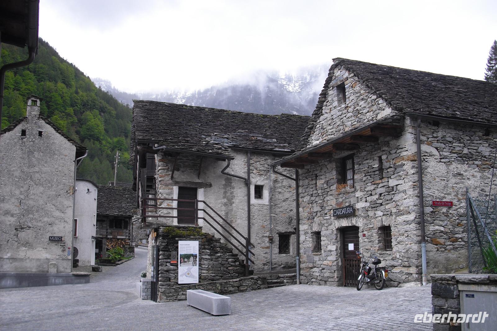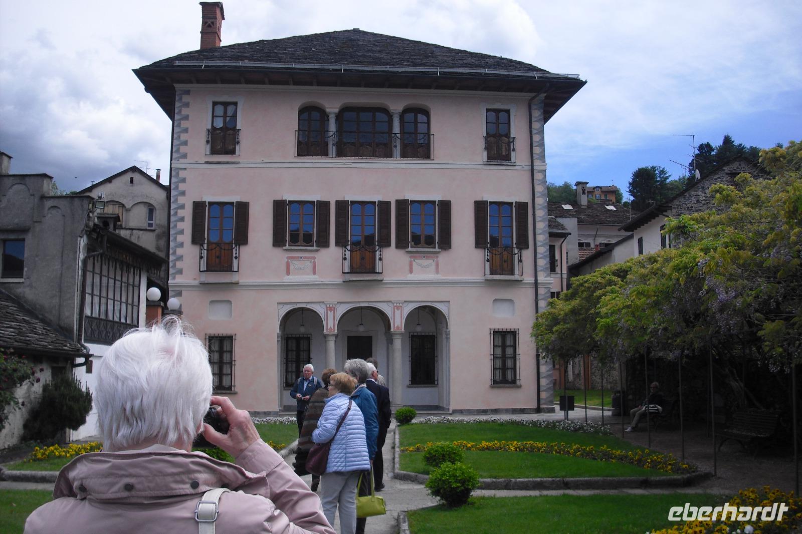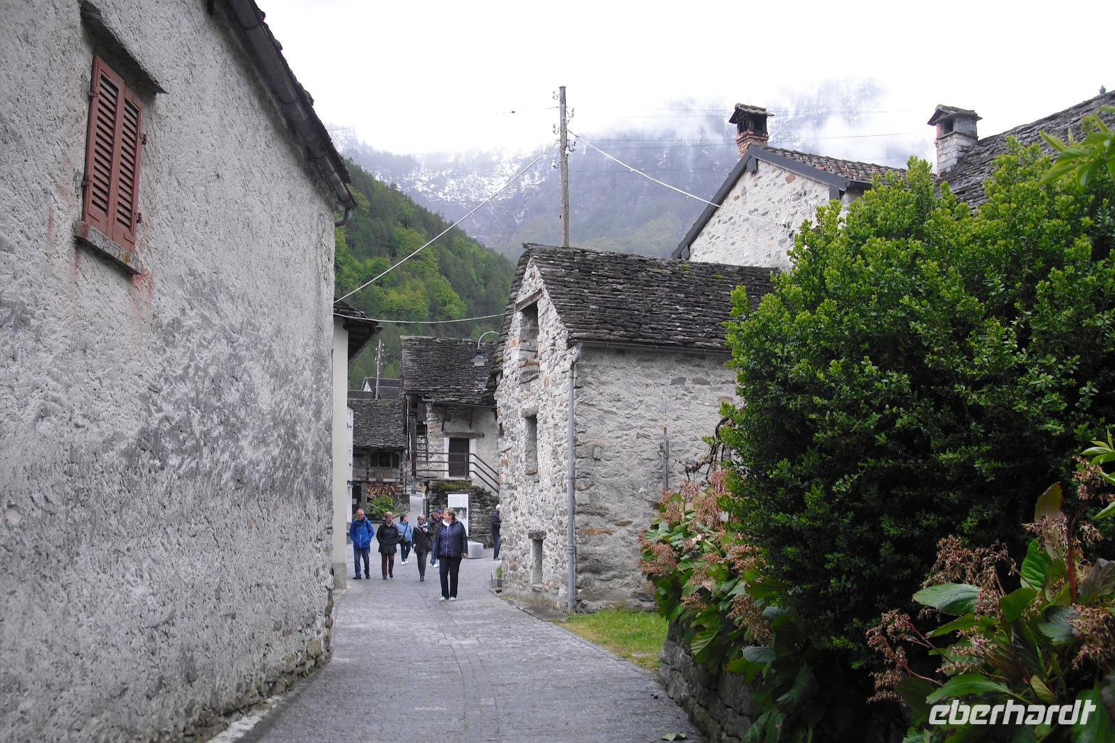 Als Auftakt des Tages, wie zuvor auch, unser Frühstück. Mit dem Bus entlang der westlichen Uferstraße des Lago Maggiore vorbei an Baveno, den Ortsteilen von Verbania, Ghiffa, Cannero, Cannobio, Brissago, Ascona und Locarno fuhren wir in das `Grüne Herz des Tessin`, das wildromantische Verzascatal. Einen ersten Aufenthalt legten wir an der 220m hohen Staumauer ein, an der schon James Bond seinen spektakulären Sprung im Film GOLDENEYE hinlegte. In der Saison kann nun jeder Adrenalinsüchtige hier seinen Sprung absolvieren, klassisch oder rückwärts oder nachts im Mond- und Sternenlicht. Für uns bot sich noch keine Möglichkeit und auch die Springleidenschaft hielt sich in engen Grenzen. Nach diesem Stopp fuhren wir an das Ende des Tales, nach Sonogno. Hier befindet sich mit dem Casa Genardini das Museum des Verzascatales, das einerseits als typisches Gebäude des 18. Jh. im Verzascatal gilt und andererseits das Leben der Talbewohner über die Jahrhunderte in einer Ausstellung dokumentiert. Wir machten einen Spaziergang durch den Ort, nahmen auch einen kleinen Imbiss ein und nutzten die Schönheit und Ruhe dieses Ortes für ein Gruppenfoto.