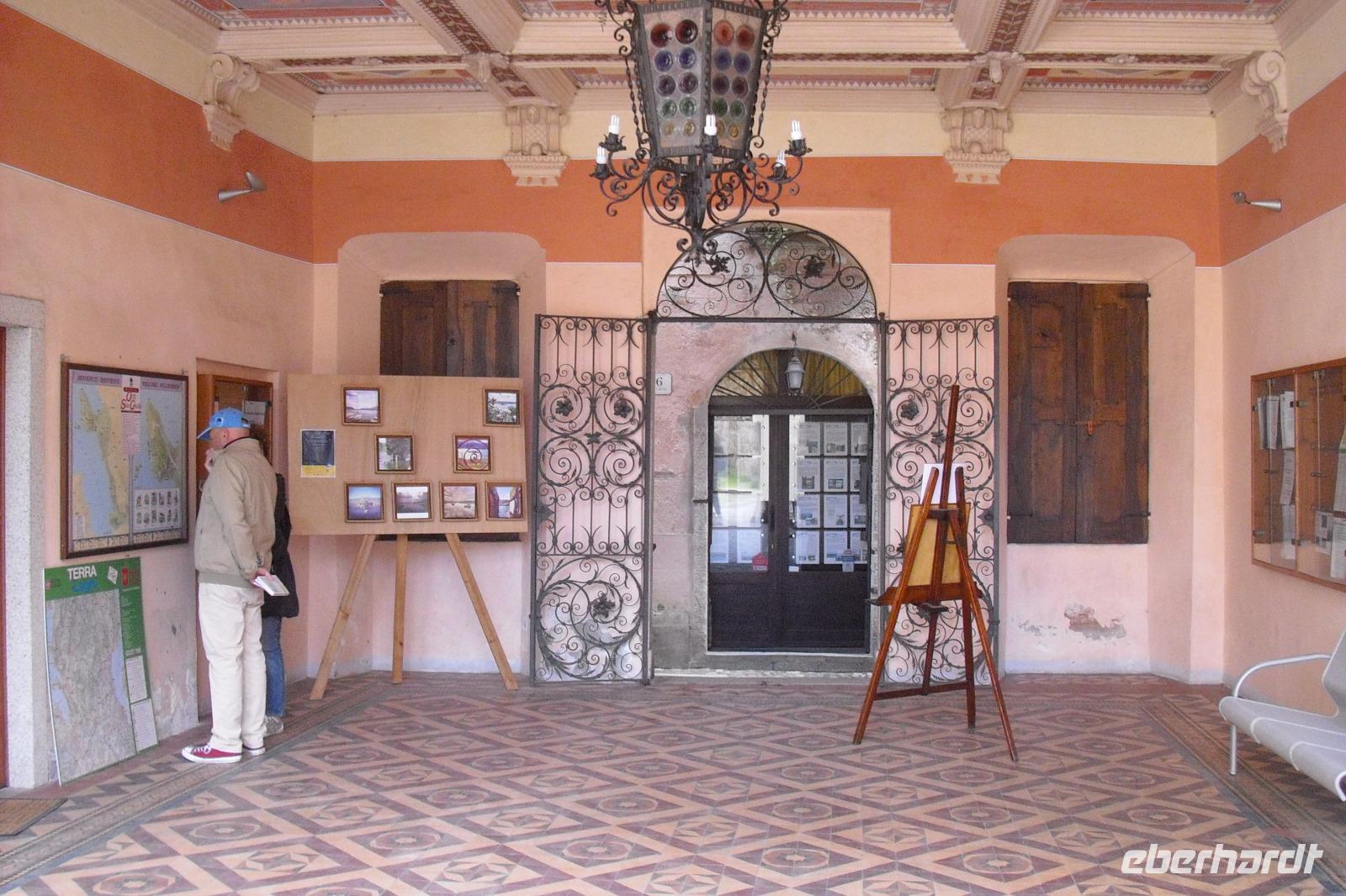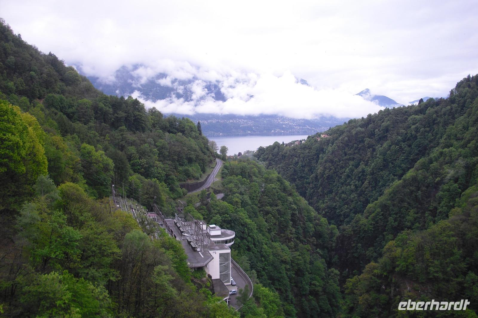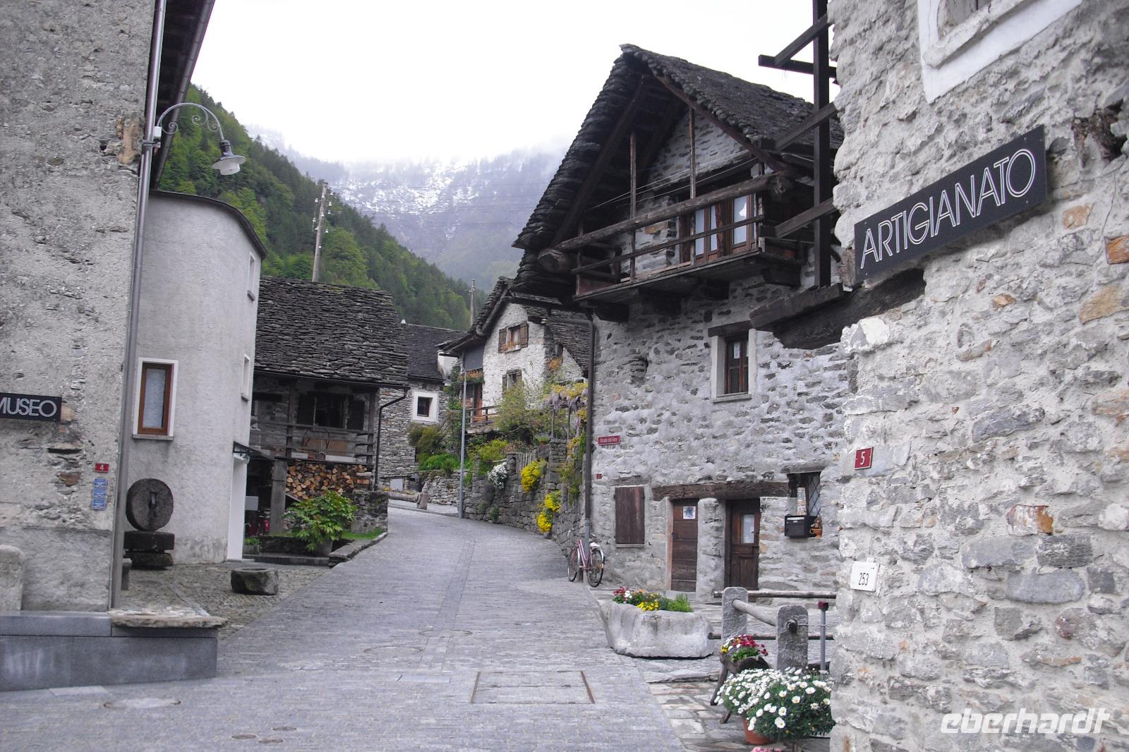 Als Auftakt des Tages, wie zuvor auch, unser Frühstück. Mit dem Bus entlang der westlichen Uferstraße des Lago Maggiore vorbei an Baveno, den Ortsteilen von Verbania, Ghiffa, Cannero, Cannobio, Brissago, Ascona und Locarno fuhren wir in das `Grüne Herz des Tessin`, das wildromantische Verzascatal. Einen ersten Aufenthalt legten wir an der 220m hohen Staumauer ein, an der schon James Bond seinen spektakulären Sprung im Film GOLDENEYE hinlegte. In der Saison kann nun jeder Adrenalinsüchtige hier seinen Sprung absolvieren, klassisch oder rückwärts oder nachts im Mond- und Sternenlicht. Für uns bot sich noch keine Möglichkeit und auch die Springleidenschaft hielt sich in engen Grenzen. Nach diesem Stopp fuhren wir an das Ende des Tales, nach Sonogno. Hier befindet sich mit dem Casa Genardini das Museum des Verzascatales, das einerseits als typisches Gebäude des 18. Jh. im Verzascatal gilt und andererseits das Leben der Talbewohner über die Jahrhunderte in einer Ausstellung dokumentiert. Wir machten einen Spaziergang durch den Ort, nahmen auch einen kleinen Imbiss ein und nutzten die Schönheit und Ruhe dieses Ortes für ein Gruppenfoto.