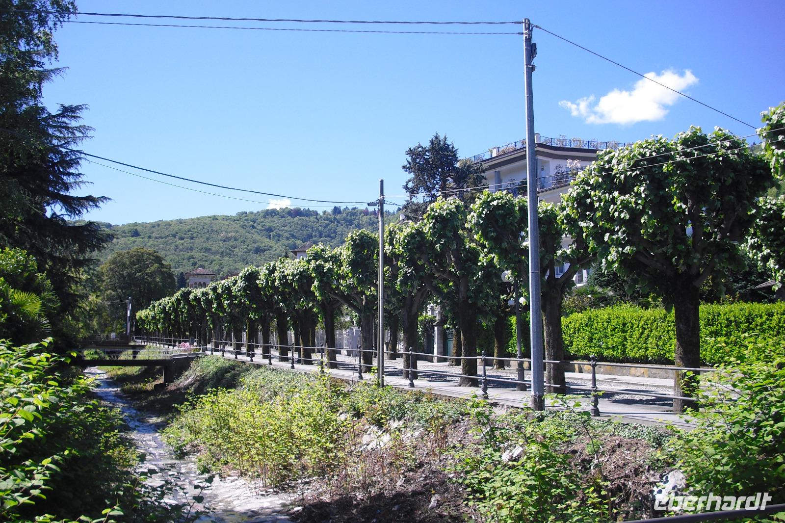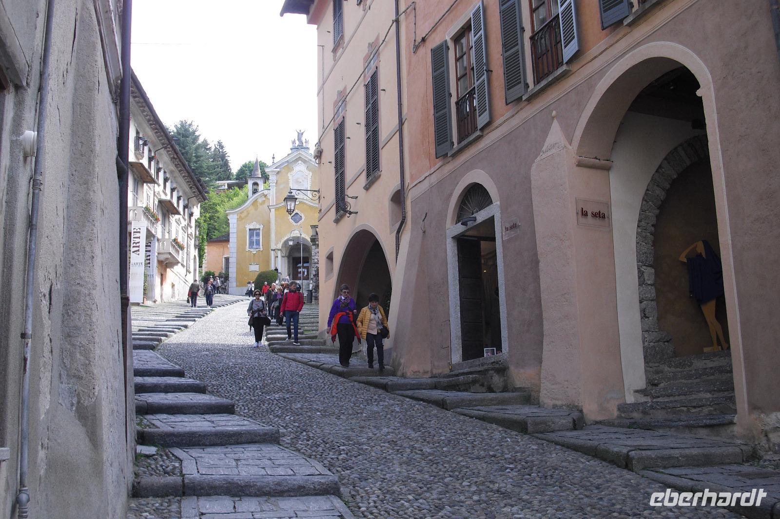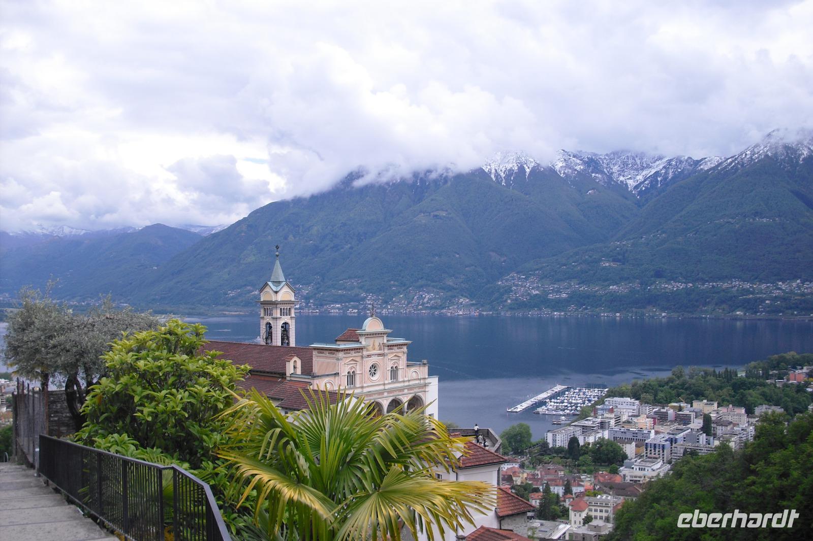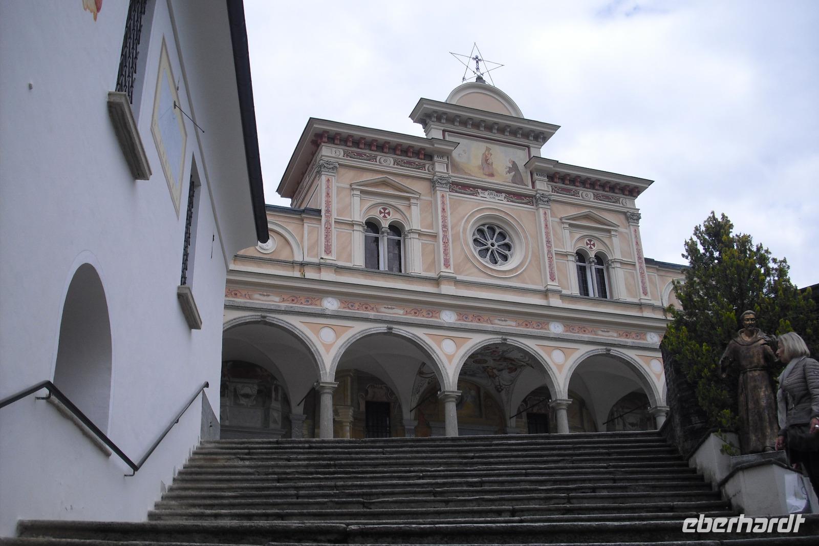 Schließlich wurde es Zeit für die Rückfahrt, denn am Nachmittag wollten wir noch Locarno besichtigen. Ein kurzer Fotostopp bot sich bei der Rückfahrt an der Ponte dei Salti an. Diese Fußgängerbrücke über die Verzasca, ausgeführt als Steinbrücke mit zwei Bögen, wurde im 17. Jh. erbaut. Sie mußte schon öfter repariert werden , da im Laufe der Zeit die reißenden Wasser der jährlichen Fluten immer wieder zu Erosionen führten. Heute ist die Brücke ein geschütztes Kulturgut. Unsere Weiterfahrt führte nach Locarno, weltweit bekannt durch das Filmfestival, aber auch seiner Blumenpracht wegen. Schon in der Römerzeit war dieser Ort strategisch und wirtschaftlich wichtig. Als Zeuge der Vergangenheit gilt u.a. die Wallfahrtskirche Madonna del Sasso, der wir zuerst einen Besuch abstatteten. Mit der historischen Standseilbahn fuhren wir zum Sacro Monte Madonna del Sasso hinauf und besichtigten die im April 2012 nach Renovierung wiedereröffnete Wallfahrtskirche. Uns bot sich eine Fülle an Kunst, Architektur und Geschichte. Im Anschluß und nach der Talfahrt konnten wir noch durch die einladende Altstadt von Locarno bummeln. Ein weiterer eindruckvoller Tag neigte sich dem Ende zu und wir fuhren zurück zum Hotel in Stresa. Hier erwartete uns das Abendessen und für einige Gäste noch ein `Bergfest´ - vier von acht Reisetagen waren flugs vergangen.