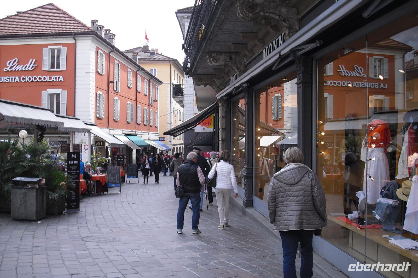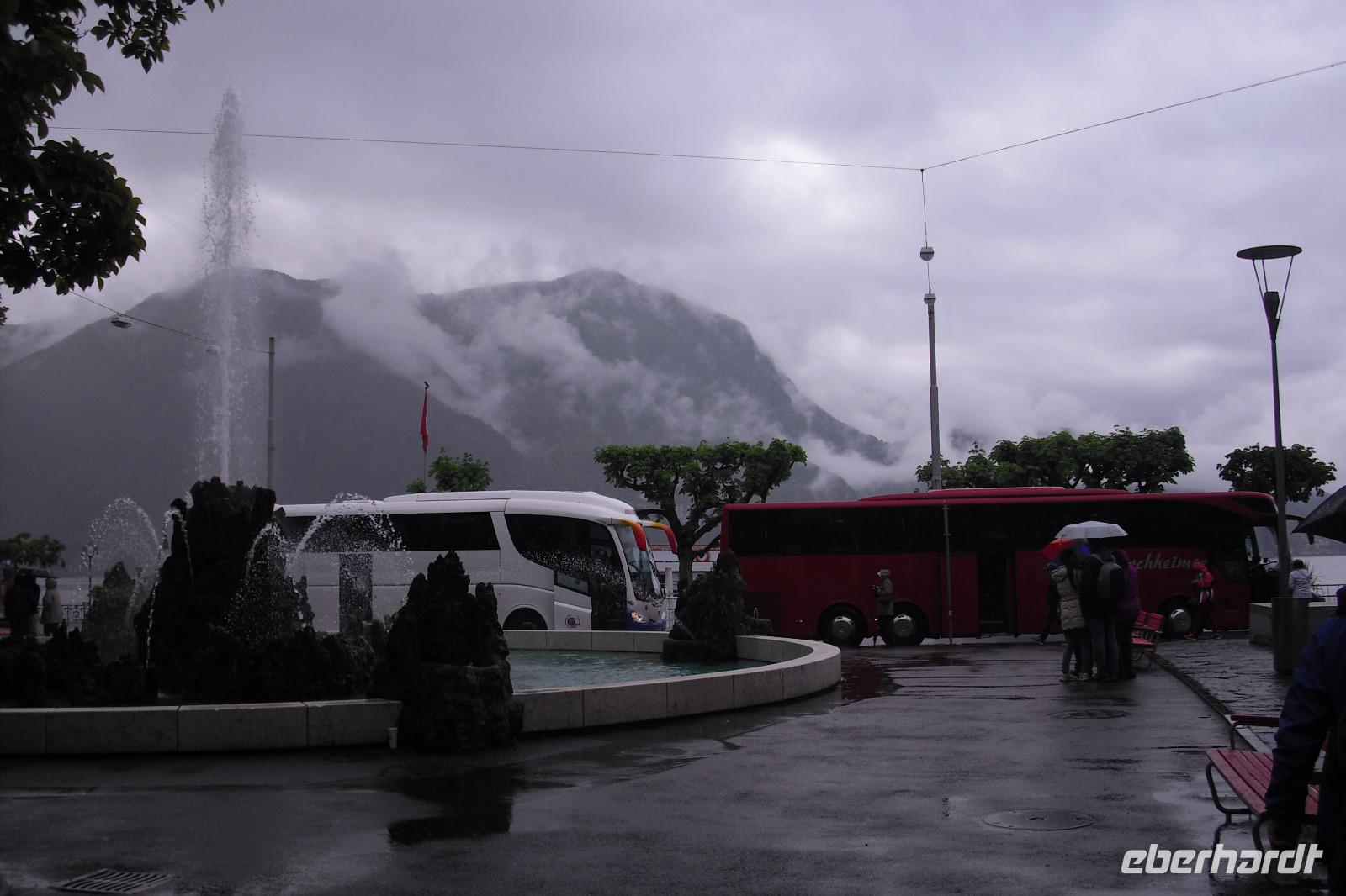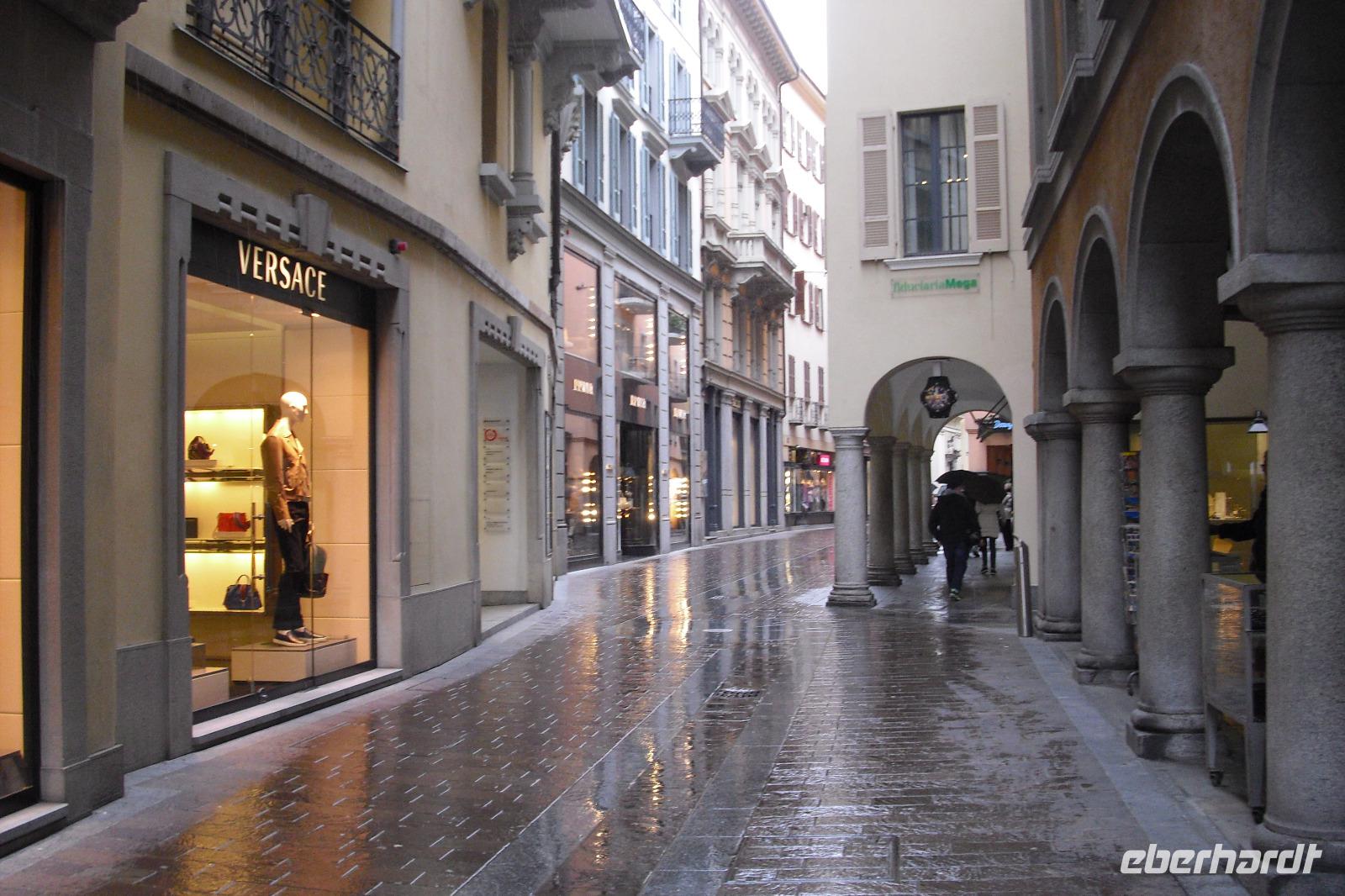 Ein zweites Frühstück in Italien und dann fuhren wir mit unserem Bus nach Lugano. Stau bei der Anfahrt und Regen in Lugano ließen nur wenige Eindrücke von dieser mondänen Stadt zu. Bei einem kleinen Bummel durch die Via Nassa konnten wir aber schon erkennen: Hier in Lugano braucht jeder die richtige Kreditkarte bei einer Einkaufstour. Wir sahen aber auch die kleine Kirche Santa Maria degli Angioli mit Fresken von Bernardino Luini, das im neoklassizistischen Stil 1844 erbaute Rathaus, das 2015 eröffnete neue Kulturzentrum und hatten einen guten Blick auf die "Hausberge" von Lugano, den Monte Bre und den Monte San Salvatore.