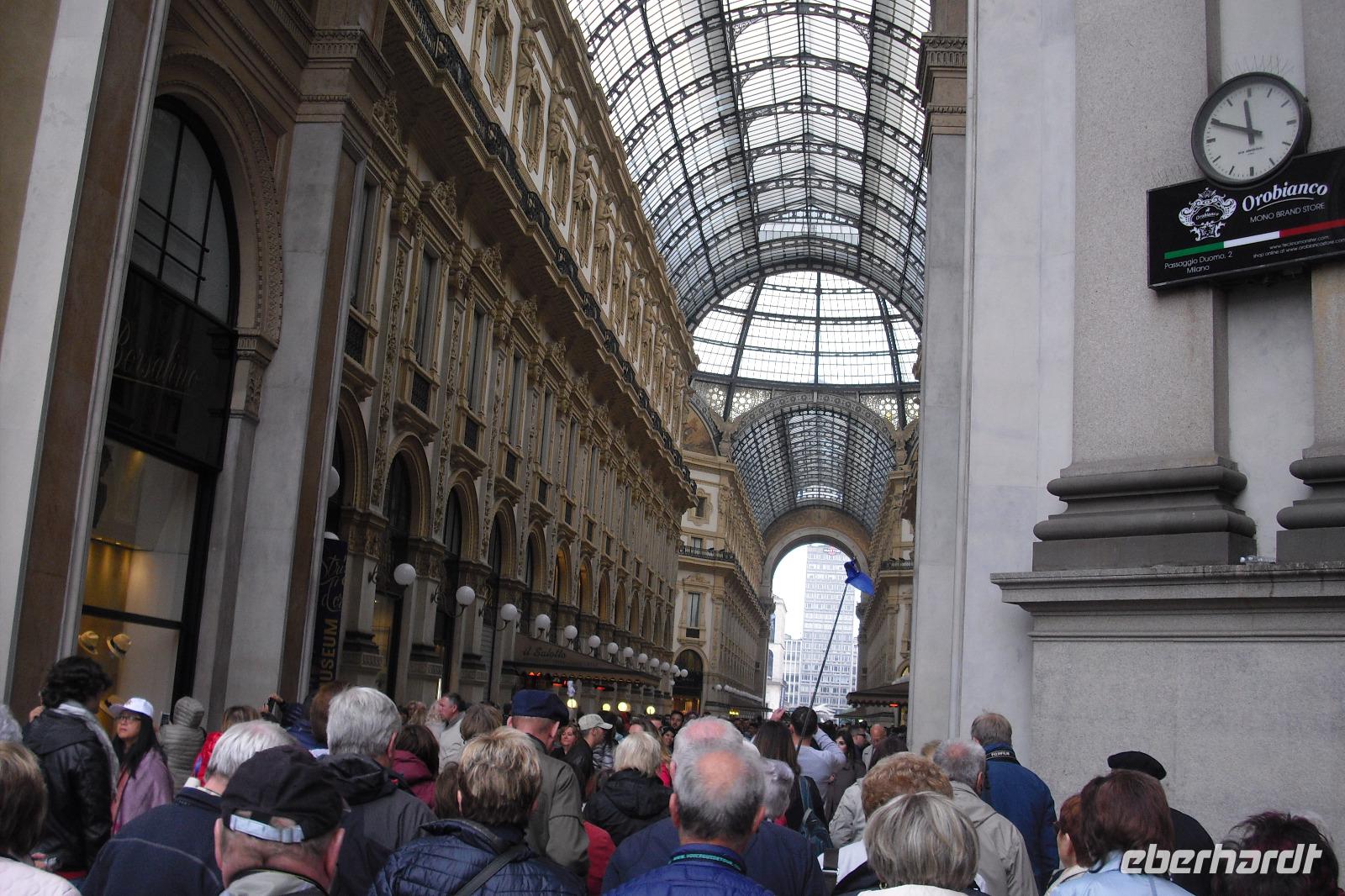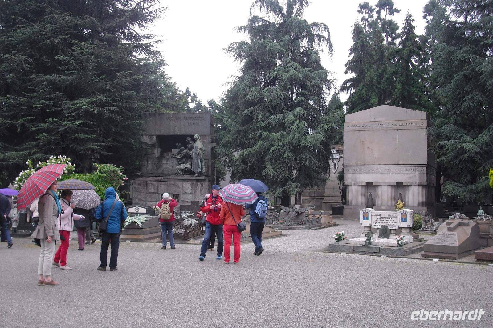 Zunächst ein vorletztes Frühstück im Hotel und dann starteten wir mit dem Bus nach Mailand. In Mailand waren wir mit Fedra am Monumentalfriedhof verabredet. Sie sollte uns einen guten Teil des Tages in Mailand begleiten. Pünktlich trafen wir uns, erledigten zunächst das Notwendige, wurden mit Hörfunk ausgerüstet und lernten bei einer Führung über einen Teil des Monumentalfriedhofs für uns eher ungewöhliche Grabstätten kennen. Dieser Friedhof wurde 1866 eingeweiht, das Projekt stammt vom lombardischen Architekten Carlo Maciachini und es soll berühmte Persönlichkeiten, deren Name eng an die politische und bürgerliche Geschichte Mailands gebunden ist, würdigen und lebendig erhalten. Recht eindrucksvoll allemal dieser Friedhof. Anschließend fuhren wir in das Zentrum von Mailand, verließen in der Nähe der berühmten Mailänder Scala den Bus und waren fortan zu Fuß unterwegs. Da das Opernhaus geschlossen war spazierten wir durch die Einkaufsgalerie Vittorio Emanuele zum Domplatz. Immer wieder erklärte Fedra mit Hilfe des Hörfunks allen Reisegästen Interessantes, Wissenswertes, Zweckmäßiges (z.B. auch zum Sicherheitscheck beim Einlaß in den Dom) sehr kompetent. Sie war und ist schon eine wahre Perle als Stadtführerin in Mailand. Nach der Führung im Dom verabschiedeten wir uns von Fedra und hatten nun noch einige freie Zeit bis zur Rückfahrt zum Hotel. Jeder konnte sich die Zeit nach eigener Interessenlage gestalten. Pünktlich trafen wir uns alle wieder zum Buseinstieg, fuhren störungsfrei nach Stresa, konnten schon das Gepäck für die Abreise am nächsten Morgen vorbereiten und nahmen ein letztes Abendessen in unserem schönen Hotel ein.