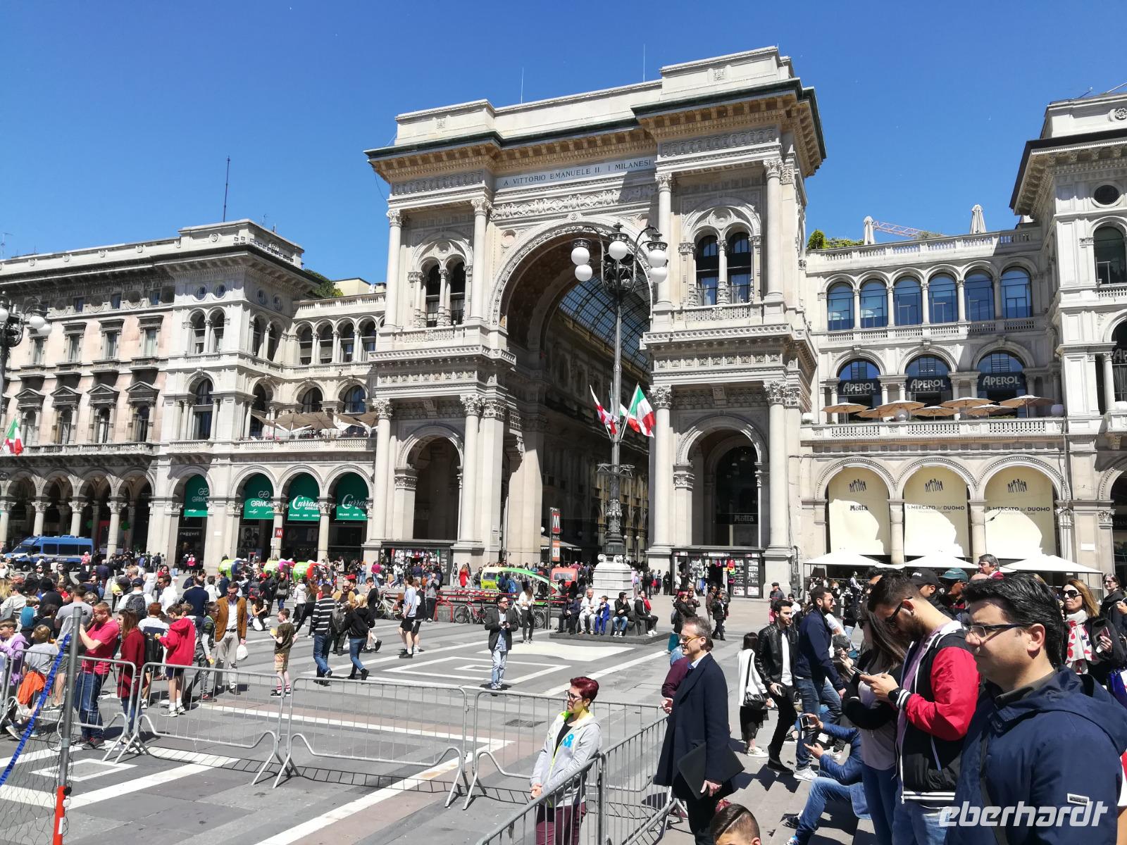 Schließlich ist Zeit zur freien Verfügung angesagt und zum vereinbarten Treffpunkt auf der Domplatte sind wir alle wieder beisammen und laufen über den Domplatz zur Via Dante, nicht, ohne noch einmal am Ende des Domplatzes einen Blick zurückzuwerfen zu einem der großartigsten Kirchenbauten weltweit.