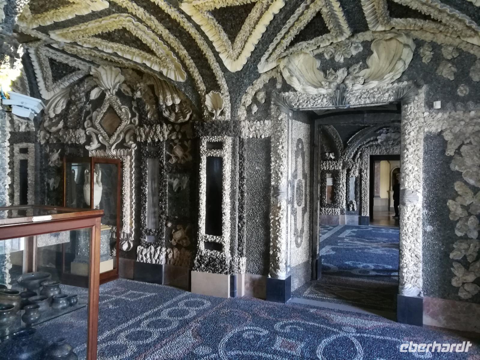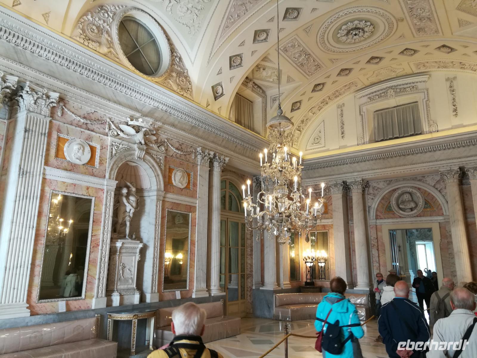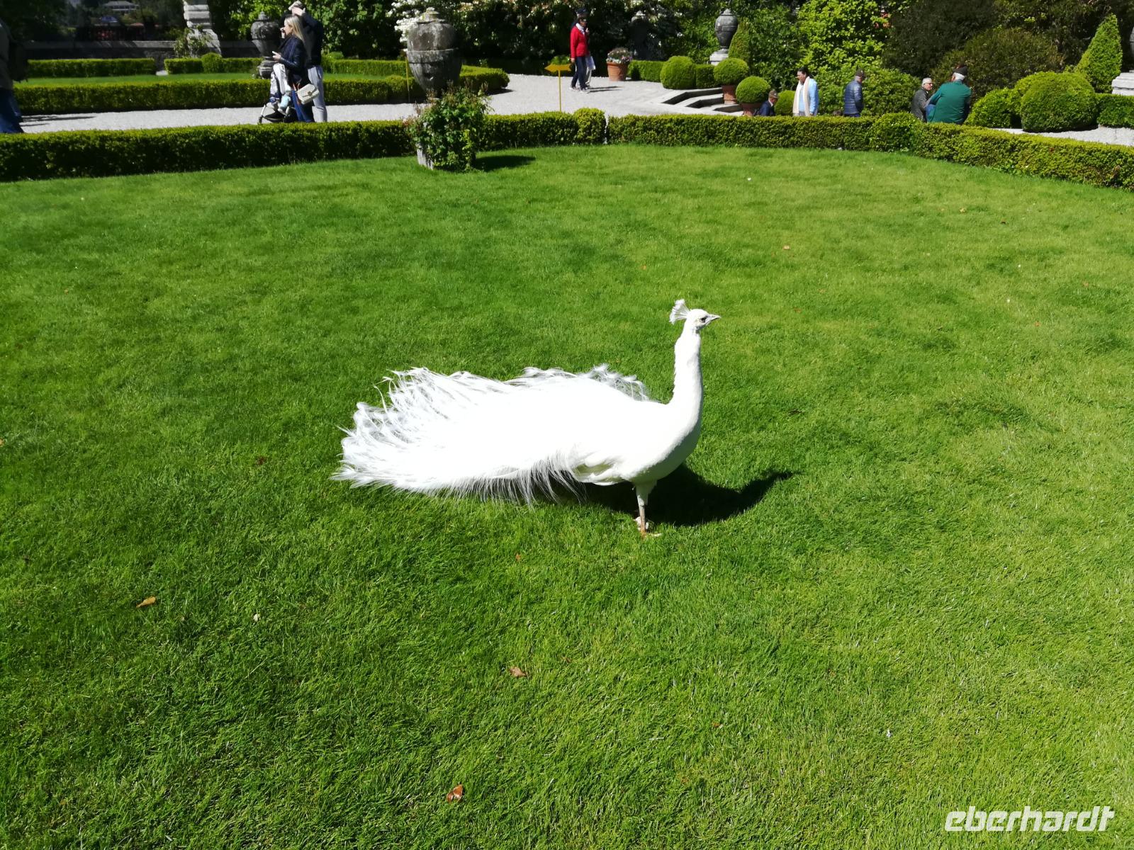 Und auf den Wiesenflächen und auch auf den Balustraden sitzend, erfreuen uns weiße Pfaue, die nur darauf zu warten scheinen, dass wir ein Foto von ihnen schießen. Dann schlagen sie auch hin und wieder einmal ein repräsentatives Rad, was sodann von den vielen Besuchern mit einem Ooh und Aah begleitet wird.