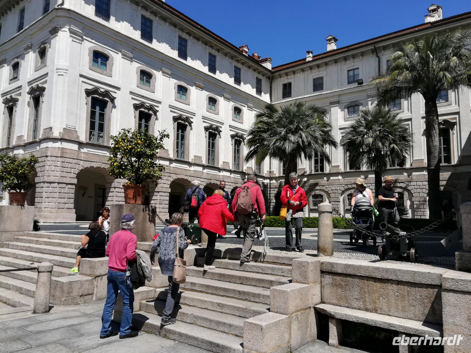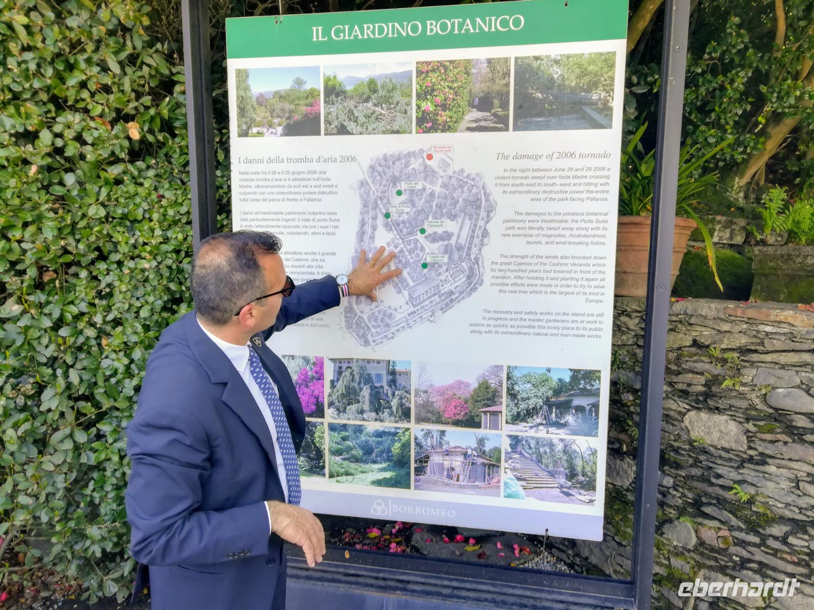 Hier empfängt uns Alfredo ein elegant gekleideter Italiener mit dem Humor für zwei. Mit fundiertem Wissen zu Botanik gepaart mit viel Spaß führt er uns über die Insel mit riesigen, uralten Bäumen, mit sehr großen Rhododendronbüschen und überhaupt mit seltenen exotischen Pflanzensorten aus aller Welt zusammengetragen. Schließlich gelangen wir zum Palazzo, der mit Einrichtungsgegenständen der Familie Borromeo ausgestattet ist, mit Wandteppichen, mit wertvollem Porzellan, mit Baldachinbetten geziert mit prächtigem Brokat, was alles insgesamt gesehen das höfische Leben von Adelsfamilien im 16. und 17. Jh. widerspiegelt.