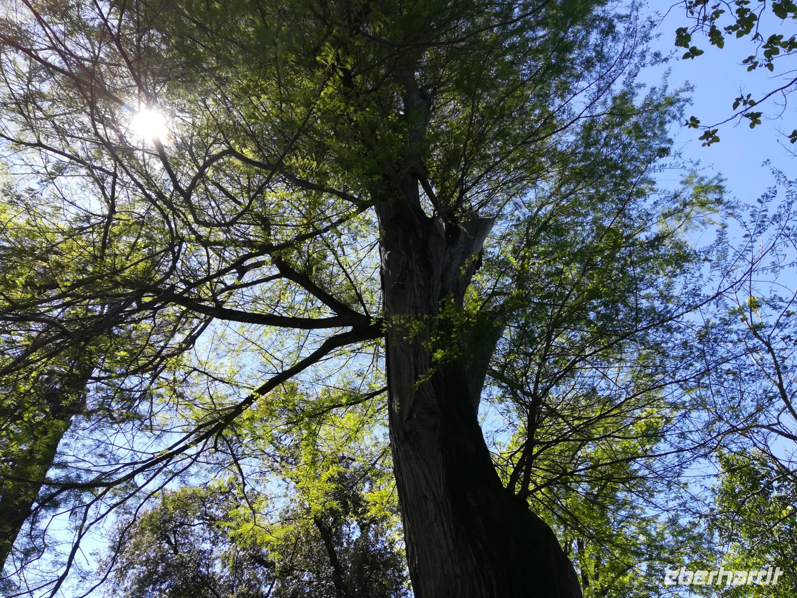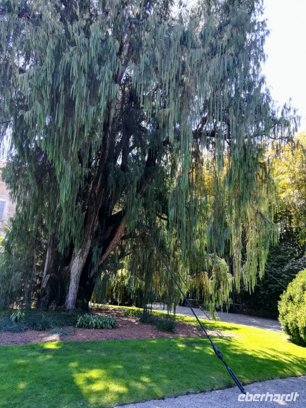 Beim Blick aus dem Fenster schaut man auf die 200 Jahre alte Kaschmir-Zypresse, die bei einem Sturm umgefallen war, aber wieder aufgerichtet wurde und mit Seilen abgespannt nun schon seit 12 Jahren wieder weiterlebt.
