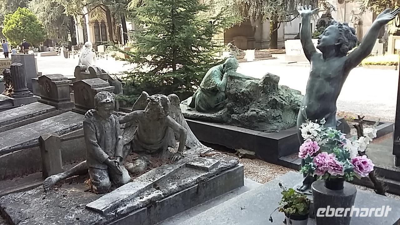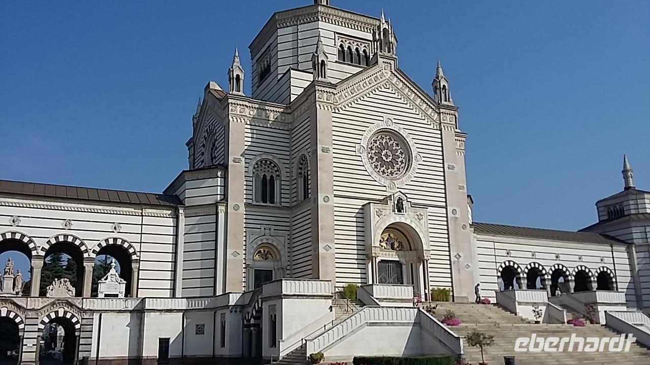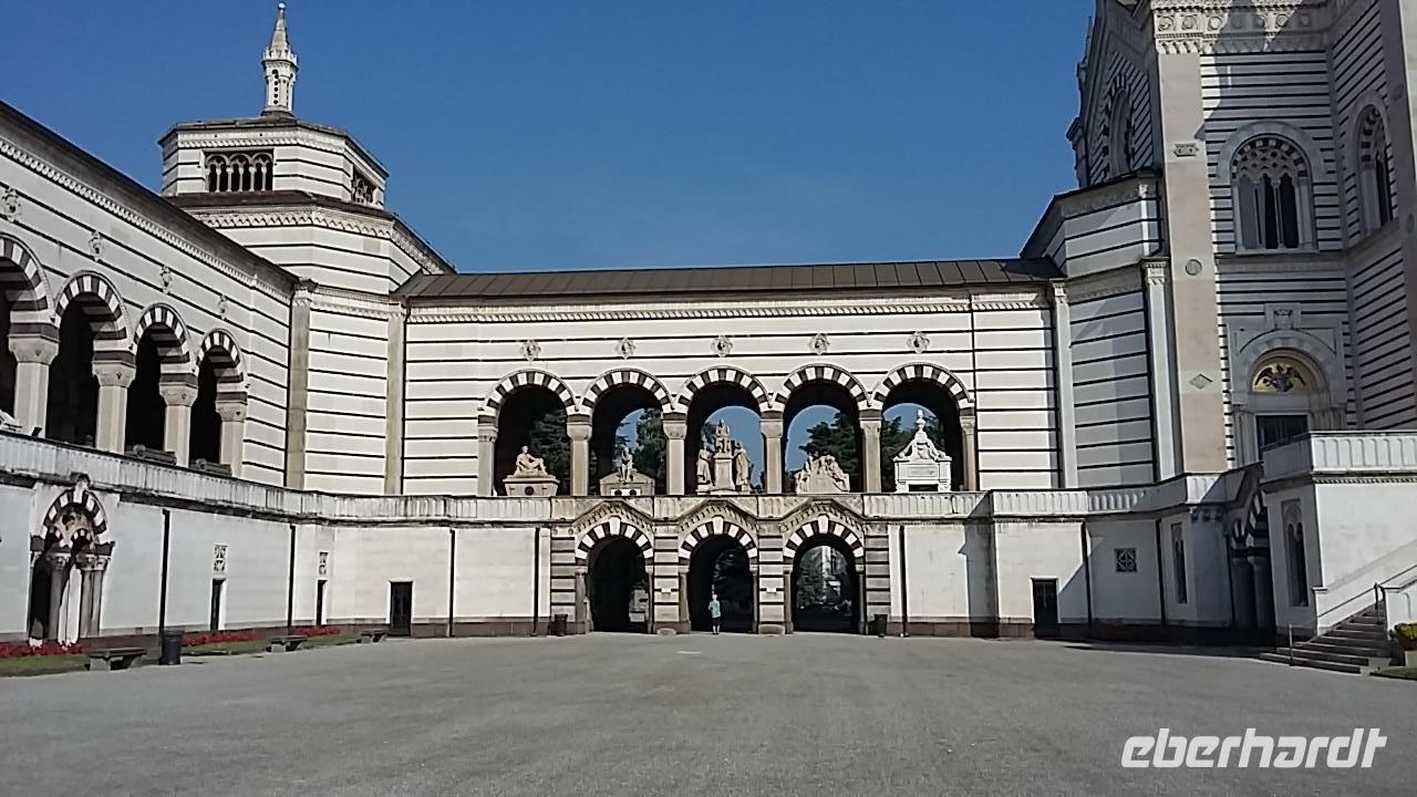Zum Sonntag müssen wir heute früher aufstehen, die Fahrt nach Mailand steht auf dem Programm. Die Modestadt lernen wir mit unserem örtlichen Reiseleiter Giorgio kennen. Wir treffen ihn am Monumentalfriedhof „Cimitero Monumentale", ihn besichtigen wir gemeinsam. 1865 hat man ihn als einen Bürgerfriedhof angelegt, hier sehen wir gigantische Familiengruften, bestattet wird heute immer noch hier, aber nur berühmte und betuchte Menschen finden ihre letzte Ruhe auf diesem Friedhof.