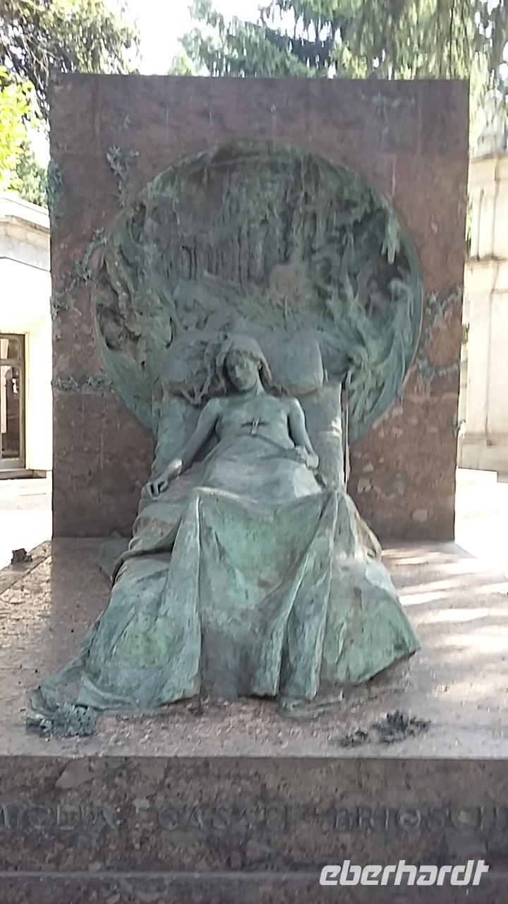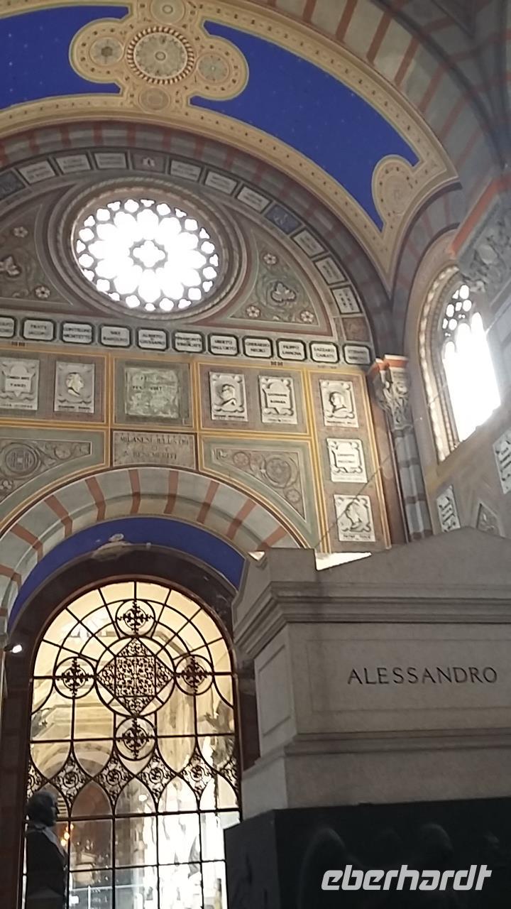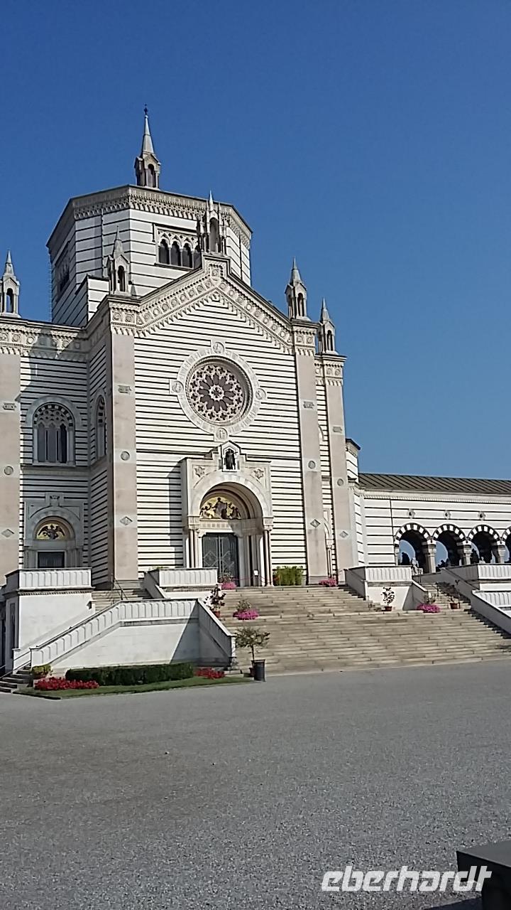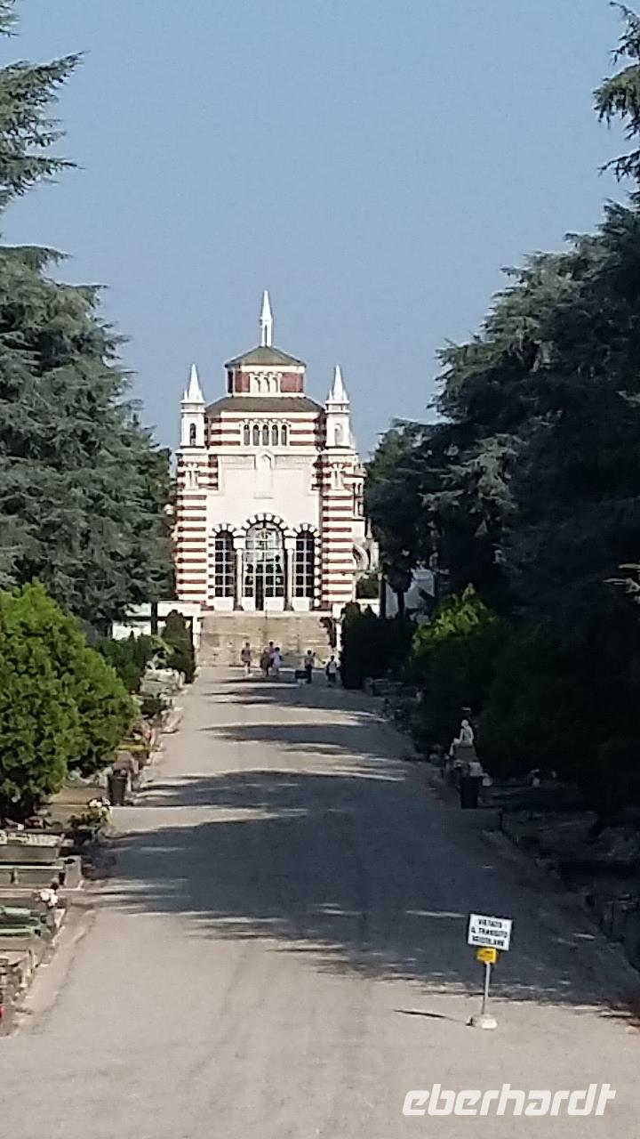 Zum Sonntag müssen wir heute früher aufstehen, die Fahrt nach Mailand steht auf dem Programm. Die Modestadt lernen wir mit unserem örtlichen Reiseleiter Giorgio kennen. Wir treffen ihn am Monumentalfriedhof „Cimitero Monumentale", ihn besichtigen wir gemeinsam. 1865 hat man ihn als einen Bürgerfriedhof angelegt, hier sehen wir gigantische Familiengruften, bestattet wird heute immer noch hier, aber nur berühmte und betuchte Menschen finden ihre letzte Ruhe auf diesem Friedhof.