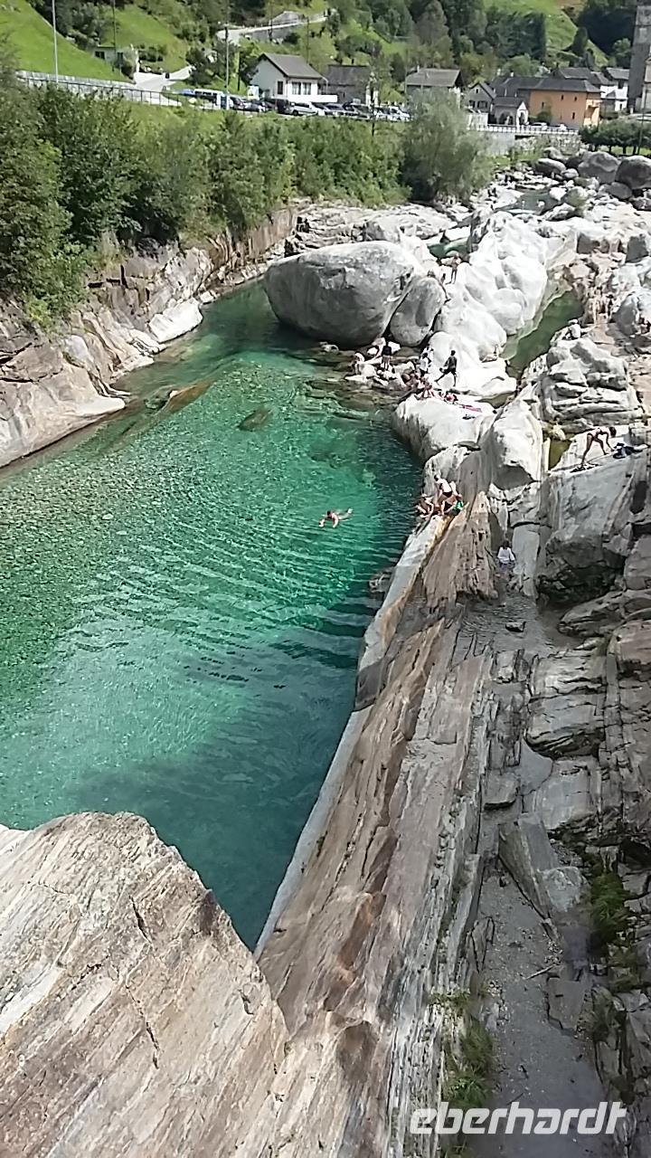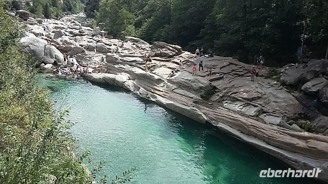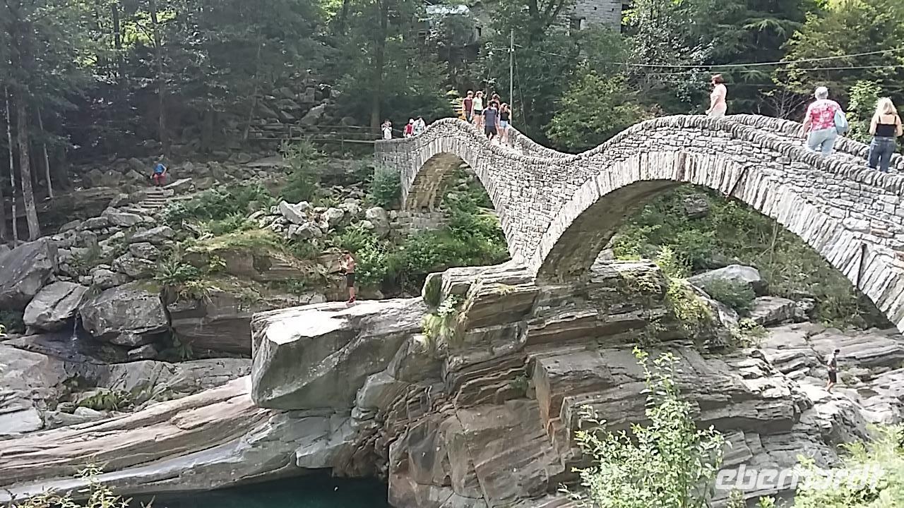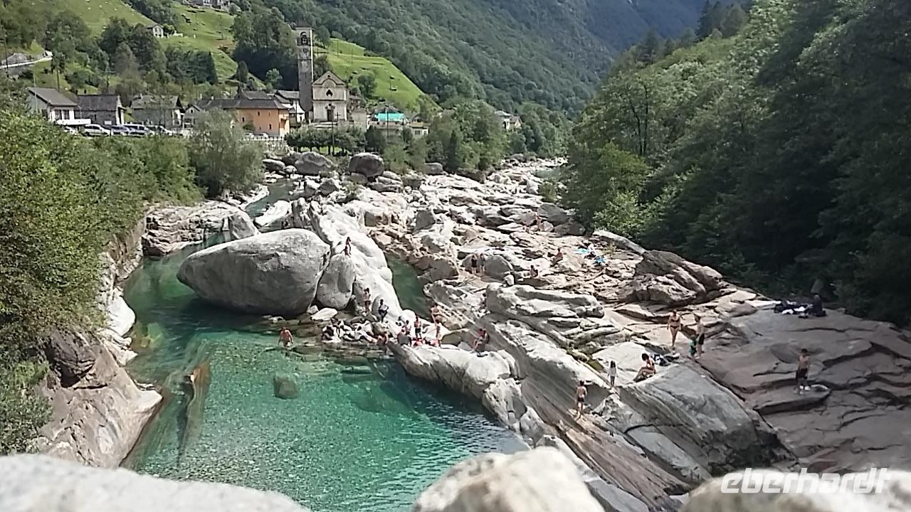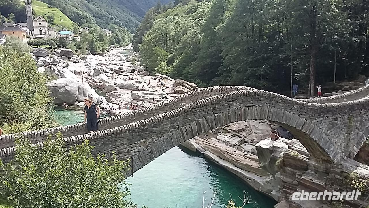 Wir sind hier am Lago Maggiore Glückskinder, verwöhnt mit tollem Wetter und die paar Regentropfen heute zwischendurch, haben nicht gestört. Entlang des Lago Maggiore fahren wir am Morgen, bei Brissagio passieren wir die Schweizer Grenze und fahren an Ascona und Locarno vorbei in das fantastische Verzascatal. Übersetzt heißt das Tal auch das grüne Wasser und das sehen wir zwischen sehr großen Steinen, die das Wasser glatt und rund gehobelt hat, dahinfließen. Unseren ersten Stopp legen wir an der Staumauer „La Selvatica" ein. Sie ist 220 Meter hoch und 380 m lang, wir spazieren auf ihr entlang. Von der Staumauer stürzte sich James Bond im Film „Golden Eye" in die Tiefe. Wir setzen unsere Fahrt im kurvenreichen Tal fort und der nächste Aufenthalt gilt dem Ort Sonogno auf 918 m Höhe auch das letzte Dorf des Tales. Typische Häuser im gut erhaltenen Ortskern und die schöne Bepflanzung mit Sommerblumen begeistert uns alle. Zurück auf Fahrt im Verzascatal kommen wir an der römischen 2 Bogen Brücke „Ponte die Salti" an. Diese schöne mittelalterliche Brücke aus Stein ruht auf einem natürlichen Granitpfeiler. Viele junge Leute tummeln sich am grünlich schimmernden Wasser zwischen den glatt geschliffenen Steinen und auch ein Reisegast unserer Gruppe testet bei einem Bad das eher frische Wasser im Fluß.
