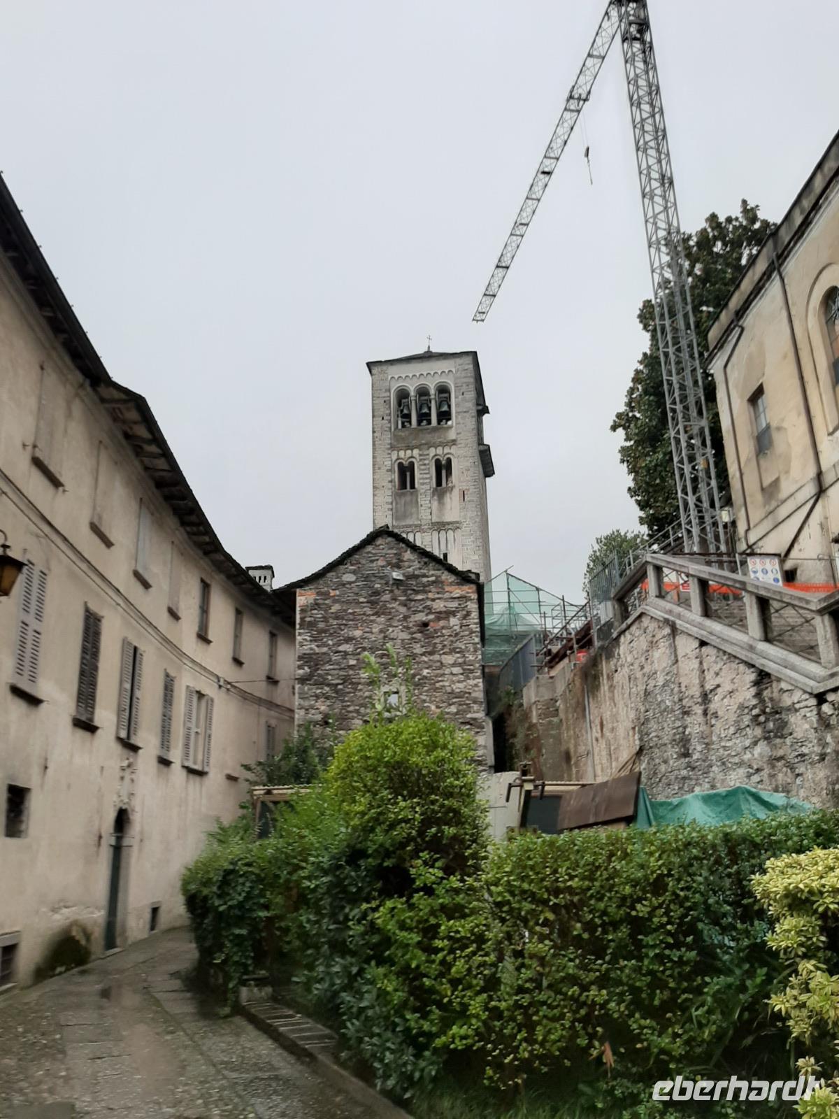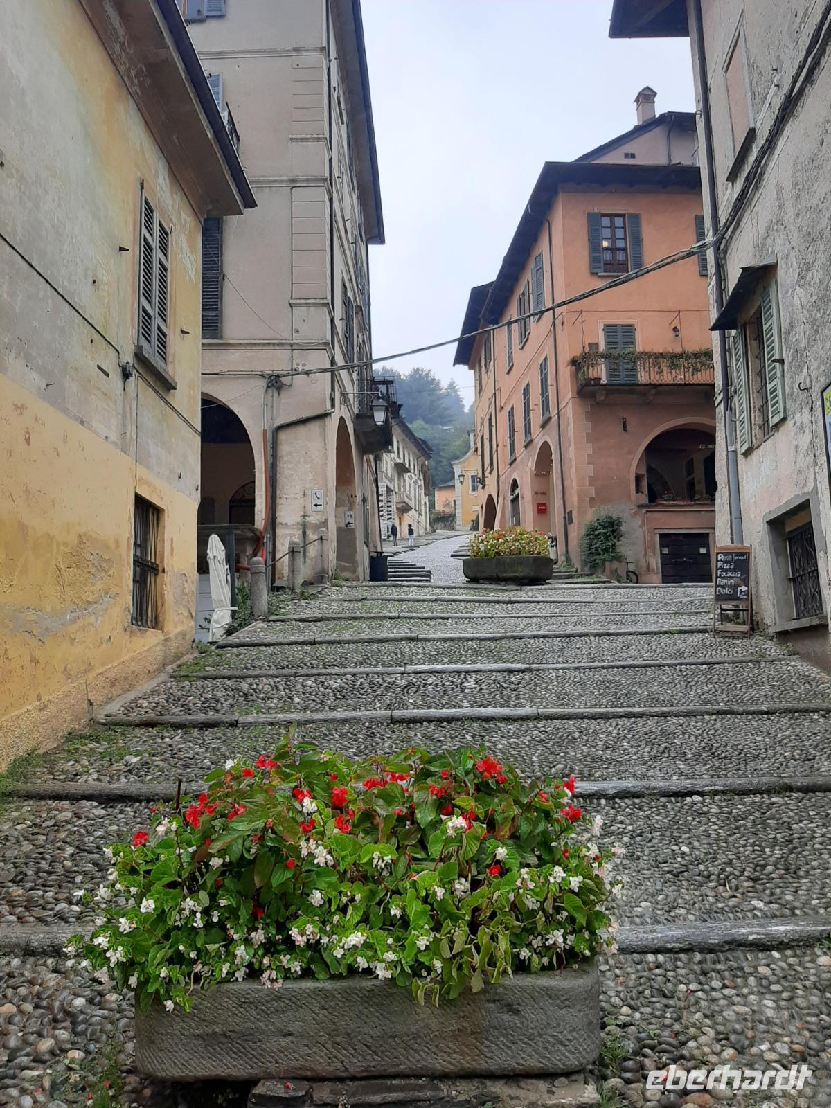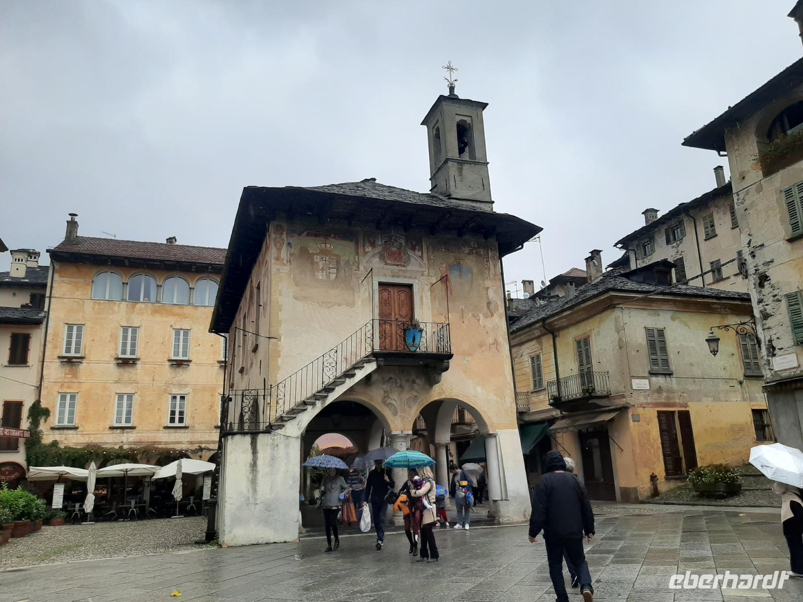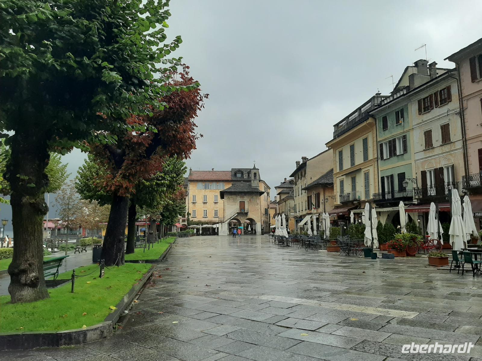 An unserem letzten Ausflugstag zeigte sich der Himmel wolkenverhangen und es regnete! Trotzdem brachen wir zum Ortasee auf, welcher westlich vom Lago Maggiore liegt und durch den Monte Mottarone vom Lago Maggiore getrennt ist. Es ist übrigens der einzige See in Norditalien, der keinen Abfluss nach Süden hat. Der von waldreichen Hügeln gerahmte See ist mit reichlich 18 Quadratkilometern zwar einer der kleinsten, aber auch einer der reizvollsten der Oberitalienischen Seen. Unsere Fahrt führte am Ostufer des Ortasees entlang zu der auf einer Landzunge gelegenen Siedlung Orta San Giulio. Mit einem kleinen Zug fuhren wir gemeinsam in die Stadt, denn unser Bus musste ziemlich weit außerhalb parken. Alle Treppenwege und Gässchen führen zur zentralen Piazza Motta, die von alten Palazzi mit Arkadengängen gesäumt wird und sich zum See mit Blick auf die kleine Isola di San Giulio öffnet. Wir hatten Glück, denn trotz der heftigen Windböen fuhren die kleinen Schiffe zur Insel hinüber! Diese wird beherrscht vom imposanten Bischofspalast, heute Priesterseminar und der Basilica di San Giulio. Der Legende zufolge wurde die Kirche im 4. Jahrhundert vom heiligen Julius gegründet, der das Eiland von Schlangen und Feuer speienden Drachen befreit hatte. Die dreischiffige romanische Emporenbasilika geht auf das 12. Jahrhundert zurück, im weitgehend barockisierten Inneren bewahrt sie mit der reich skulptierten schwarzen Marmorkanzel ein Meisterwerk romanischer Bildhauerei. Wieder zurück auf dem Festland hatten wir noch etwas Zeit für einen ausgiebigen Bummel durch Orta San Giulio, bevor es mit dem kleinen Zug zum Busparkplatz zurück ging. Den Nachmittag wollten wir eigentlich ganz gemütlich bei Kaffee und Eis in Stresa verbringen, aber es setzte ein unglaublicher Starkregen ein, der uns dazu zwang, vorzeitig nach Baveno zurückzukehren.