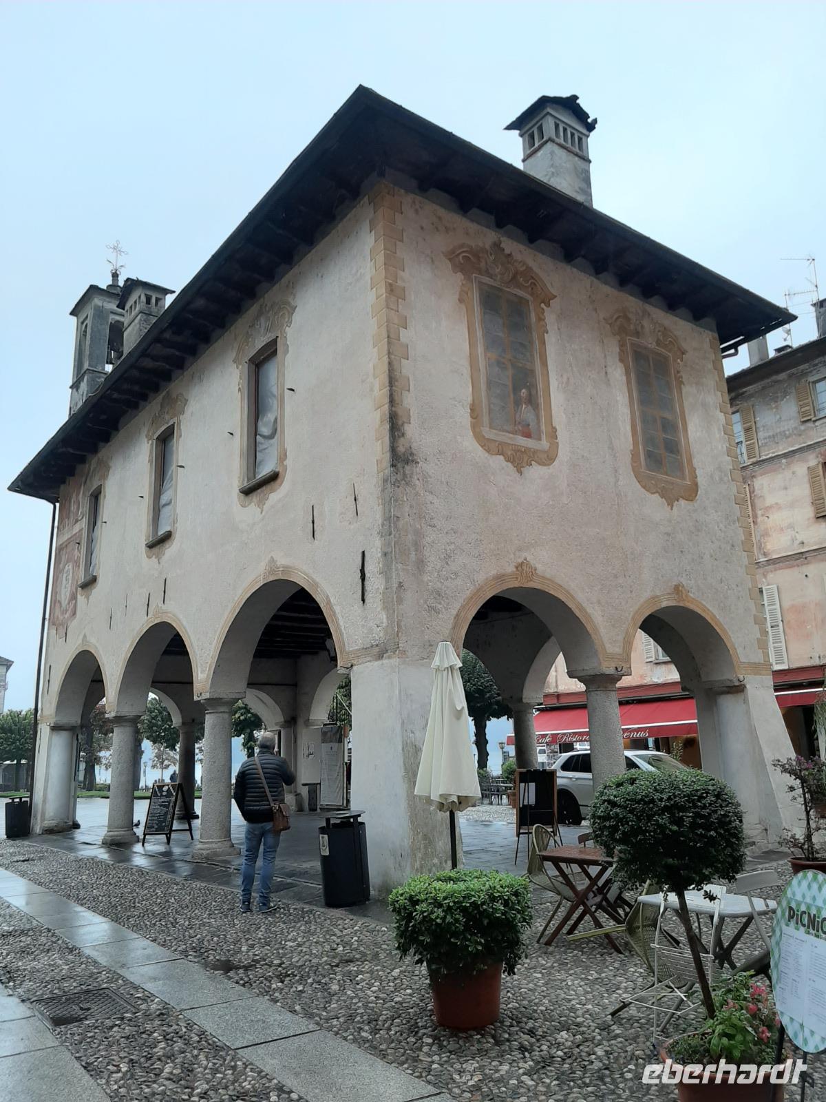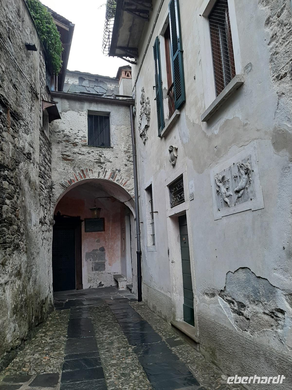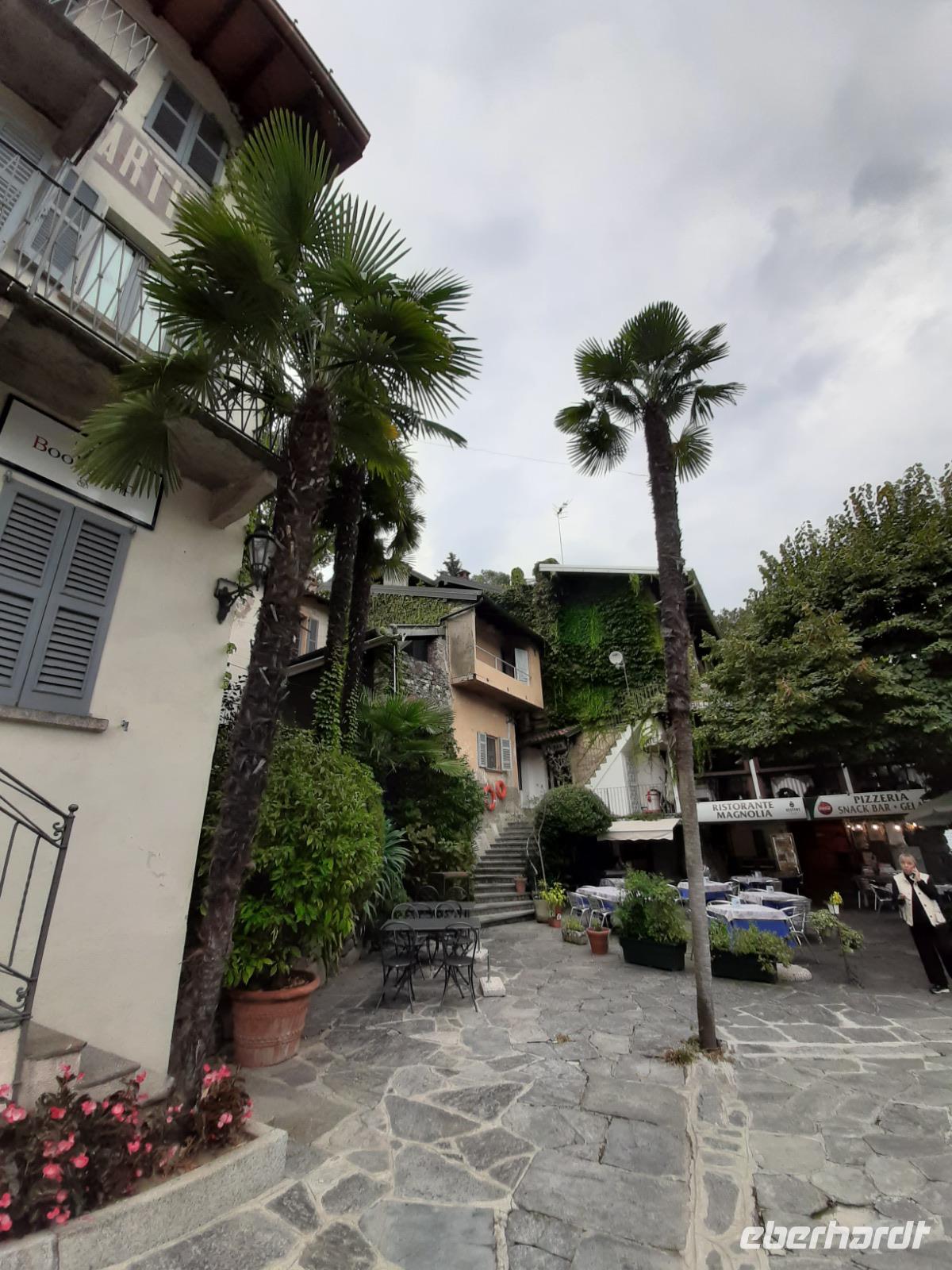 An unserem letzten Ausflugstag zeigte sich der Himmel wolkenverhangen und es regnete! Trotzdem brachen wir zum Ortasee auf, welcher westlich vom Lago Maggiore liegt und durch den Monte Mottarone vom Lago Maggiore getrennt ist. Es ist übrigens der einzige See in Norditalien, der keinen Abfluss nach Süden hat. Der von waldreichen Hügeln gerahmte See ist mit reichlich 18 Quadratkilometern zwar einer der kleinsten, aber auch einer der reizvollsten der Oberitalienischen Seen. Unsere Fahrt führte am Ostufer des Ortasees entlang zu der auf einer Landzunge gelegenen Siedlung Orta San Giulio. Mit einem kleinen Zug fuhren wir gemeinsam in die Stadt, denn unser Bus musste ziemlich weit außerhalb parken. Alle Treppenwege und Gässchen führen zur zentralen Piazza Motta, die von alten Palazzi mit Arkadengängen gesäumt wird und sich zum See mit Blick auf die kleine Isola di San Giulio öffnet. Wir hatten Glück, denn trotz der heftigen Windböen fuhren die kleinen Schiffe zur Insel hinüber! Diese wird beherrscht vom imposanten Bischofspalast, heute Priesterseminar und der Basilica di San Giulio. Der Legende zufolge wurde die Kirche im 4. Jahrhundert vom heiligen Julius gegründet, der das Eiland von Schlangen und Feuer speienden Drachen befreit hatte. Die dreischiffige romanische Emporenbasilika geht auf das 12. Jahrhundert zurück, im weitgehend barockisierten Inneren bewahrt sie mit der reich skulptierten schwarzen Marmorkanzel ein Meisterwerk romanischer Bildhauerei. Wieder zurück auf dem Festland hatten wir noch etwas Zeit für einen ausgiebigen Bummel durch Orta San Giulio, bevor es mit dem kleinen Zug zum Busparkplatz zurück ging. Den Nachmittag wollten wir eigentlich ganz gemütlich bei Kaffee und Eis in Stresa verbringen, aber es setzte ein unglaublicher Starkregen ein, der uns dazu zwang, vorzeitig nach Baveno zurückzukehren.