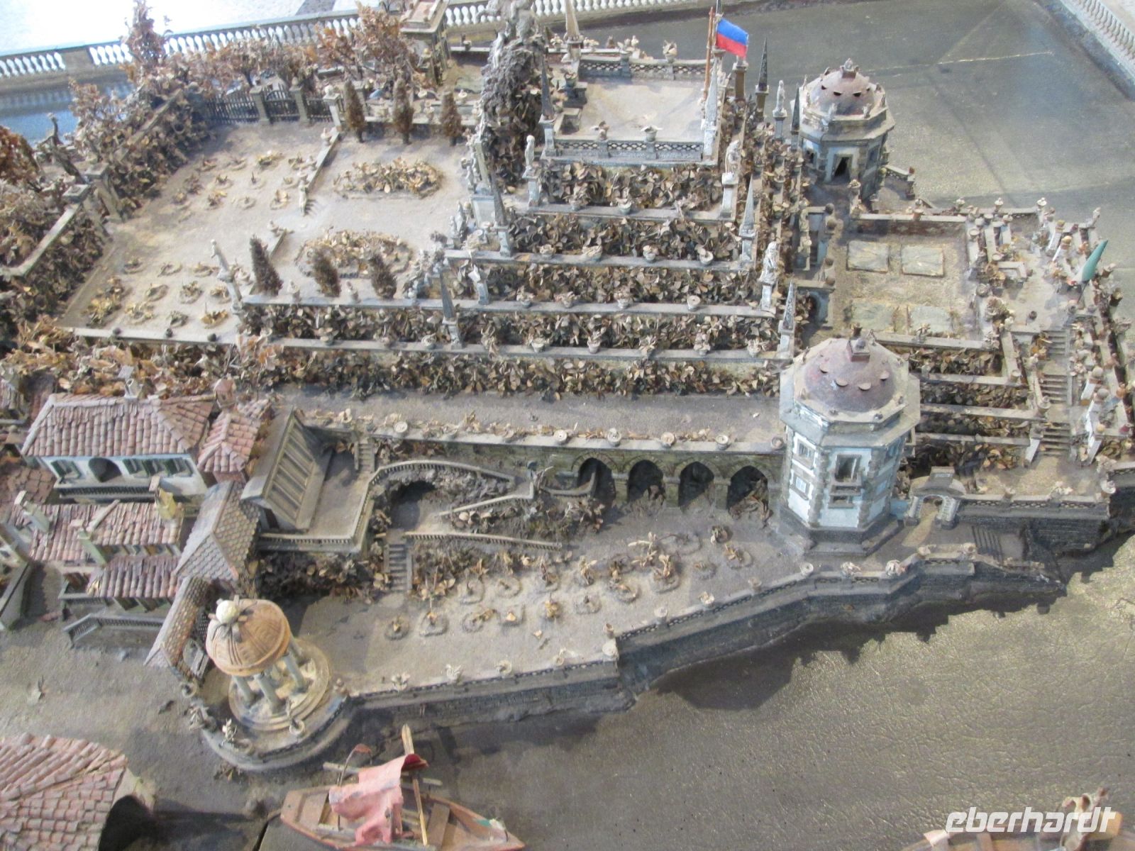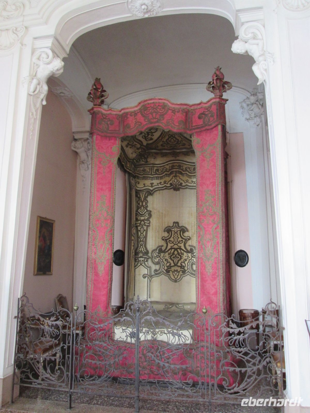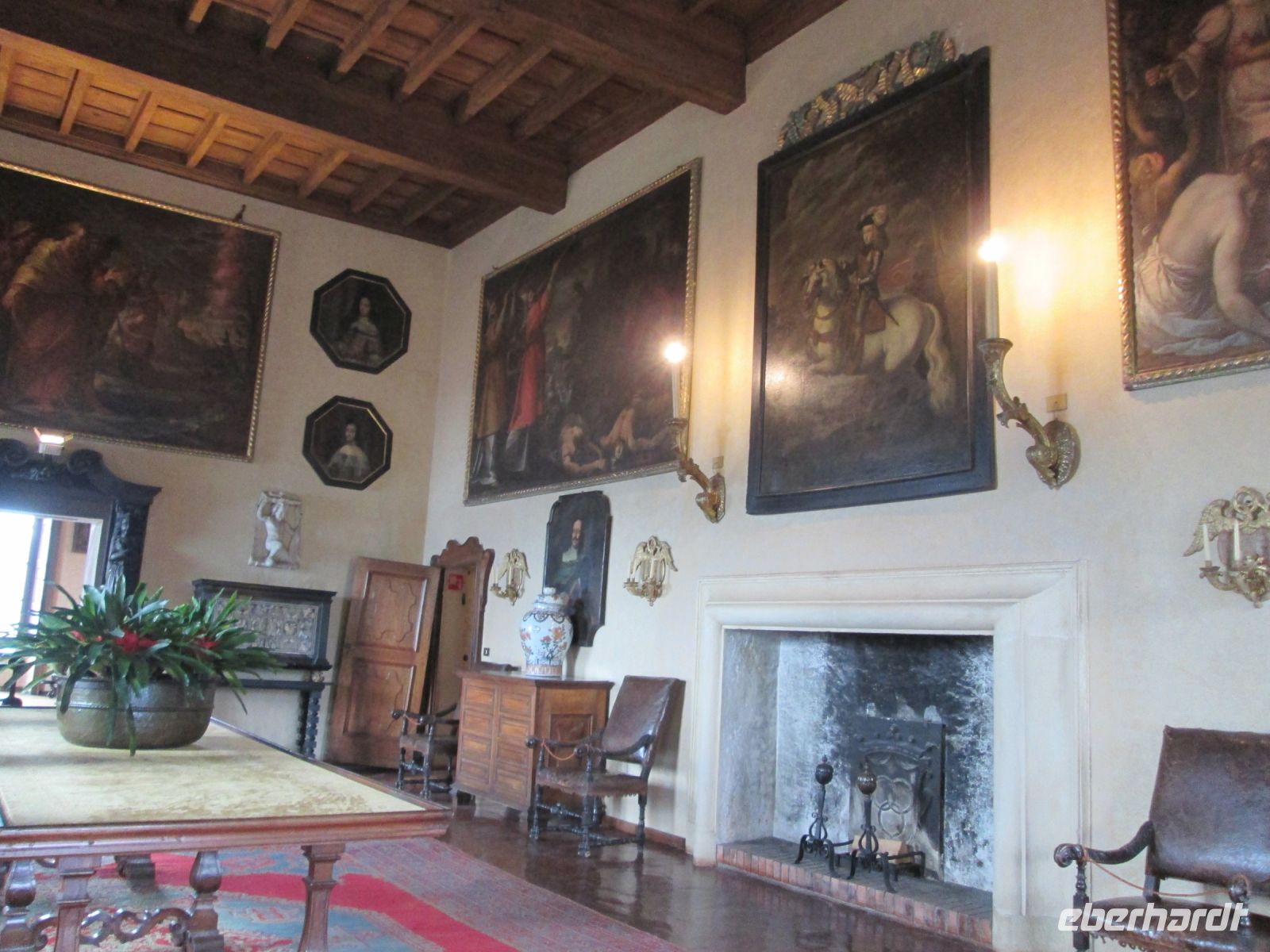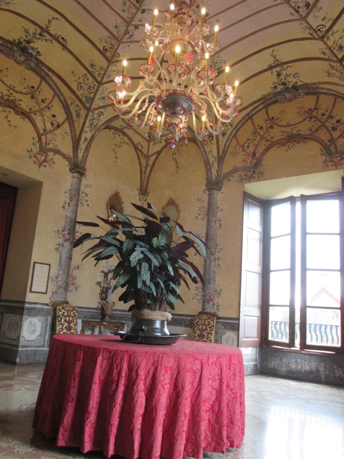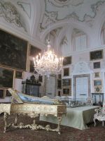 Die Besichtigung des Borromeo-Palastes auf der Isola Madre ist ebenso ein Muss wie der Palast auf der Isola Bella. Dieser wurde später, in der Zeit des Barock erbaut und wird im Obergeschoss heute noch in den Sommermonaten von der Familie bewohnt. So bleiben von den insgesamt 198 Schlossräumen 50 der Familie vorbehalten und 30 sind für die Öffentlichkeit zugänglich. Diese hat uns hervorragend der Schlossführer Matteo nahe gebracht. Sehr beeindruckend sind z.B. der 23 m hohe Festsaal, er ist damit ebenso hoch wie die Statue des Carlo Borromeo in Arona, der Musiksaal, in dem 1935 mit den Herren Mussolini, Laval und Mac Donald die Konferenz von Stresa tagte, der Napoleon Saal und die Grotten. Sie befinden sich um Untergeschoss und sind gen Norden gerichtet, weil man Erholung und Entspannung vor der sommerlichen Hitze suchte. Aus Tausenden von weißen und schwarzen Kieselsteinchen bestehend, bilden sie einen starken Kontrast zum Marmor, Stuck, Gold und Damast in den oberen Stockwerken.