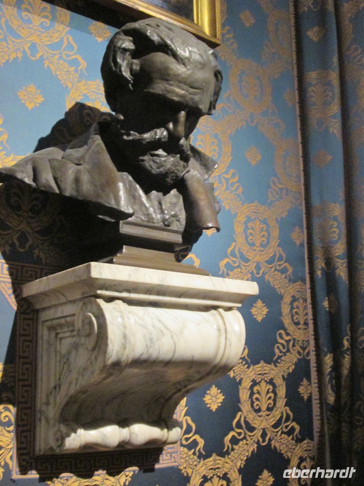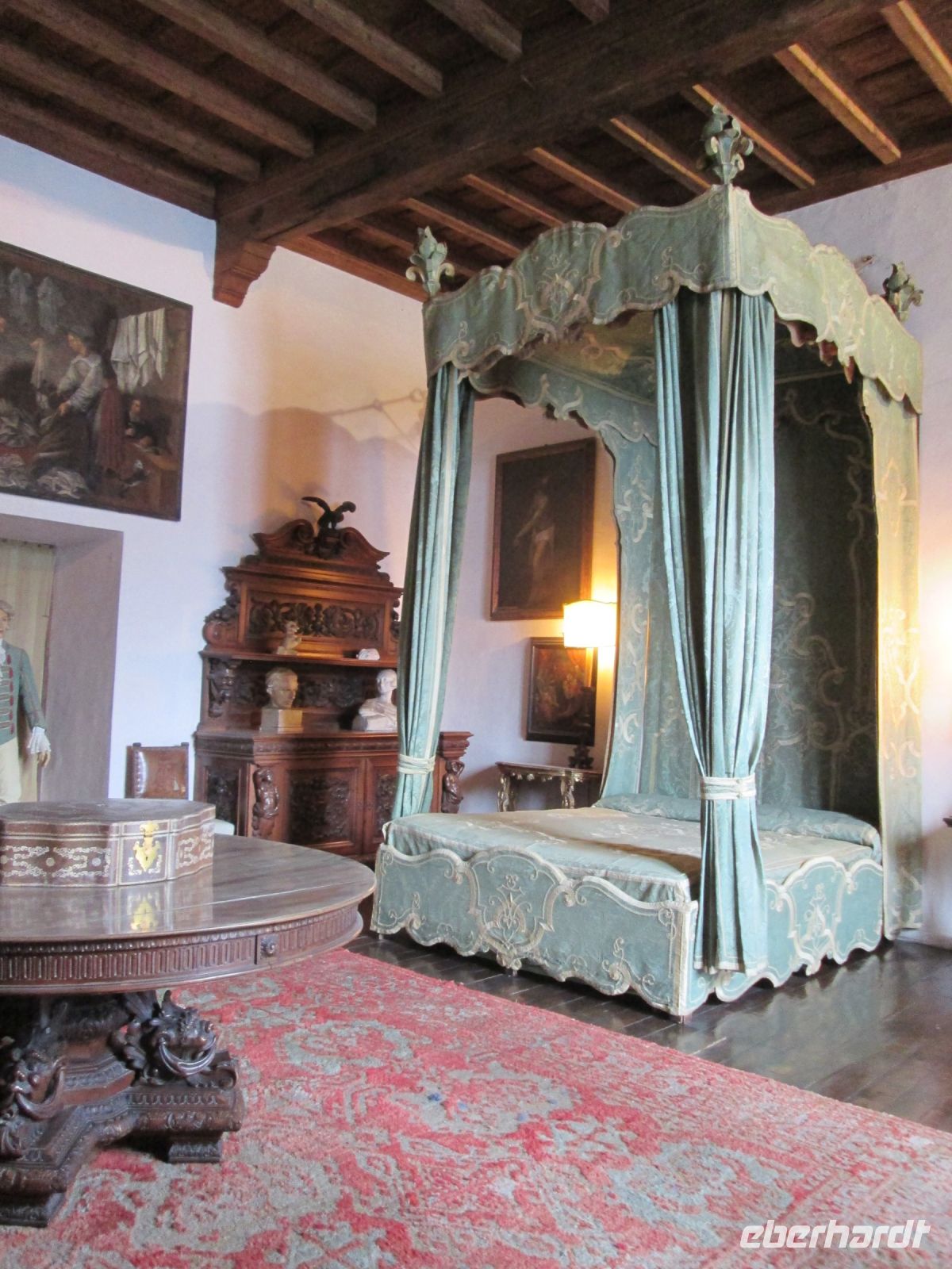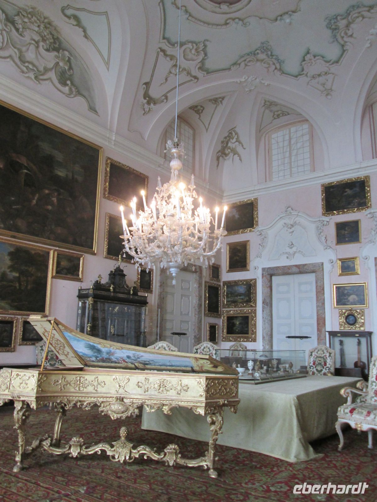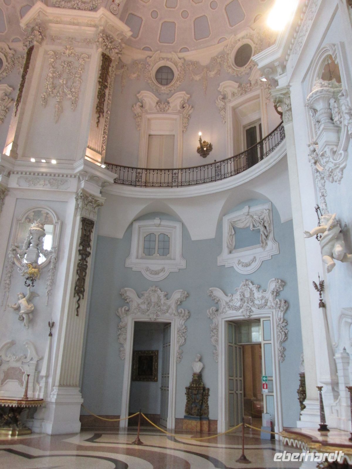 Die Besichtigung des Borromeo-Palastes auf der Isola Madre ist ebenso ein Muss wie der Palast auf der Isola Bella. Dieser wurde später, in der Zeit des Barock erbaut und wird im Obergeschoss heute noch in den Sommermonaten von der Familie bewohnt. So bleiben von den insgesamt 198 Schlossräumen 50 der Familie vorbehalten und 30 sind für die Öffentlichkeit zugänglich. Diese hat uns hervorragend der Schlossführer Matteo nahe gebracht. Sehr beeindruckend sind z.B. der 23 m hohe Festsaal, er ist damit ebenso hoch wie die Statue des Carlo Borromeo in Arona, der Musiksaal, in dem 1935 mit den Herren Mussolini, Laval und Mac Donald die Konferenz von Stresa tagte, der Napoleon Saal und die Grotten. Sie befinden sich um Untergeschoss und sind gen Norden gerichtet, weil man Erholung und Entspannung vor der sommerlichen Hitze suchte. Aus Tausenden von weißen und schwarzen Kieselsteinchen bestehend, bilden sie einen starken Kontrast zum Marmor, Stuck, Gold und Damast in den oberen Stockwerken.