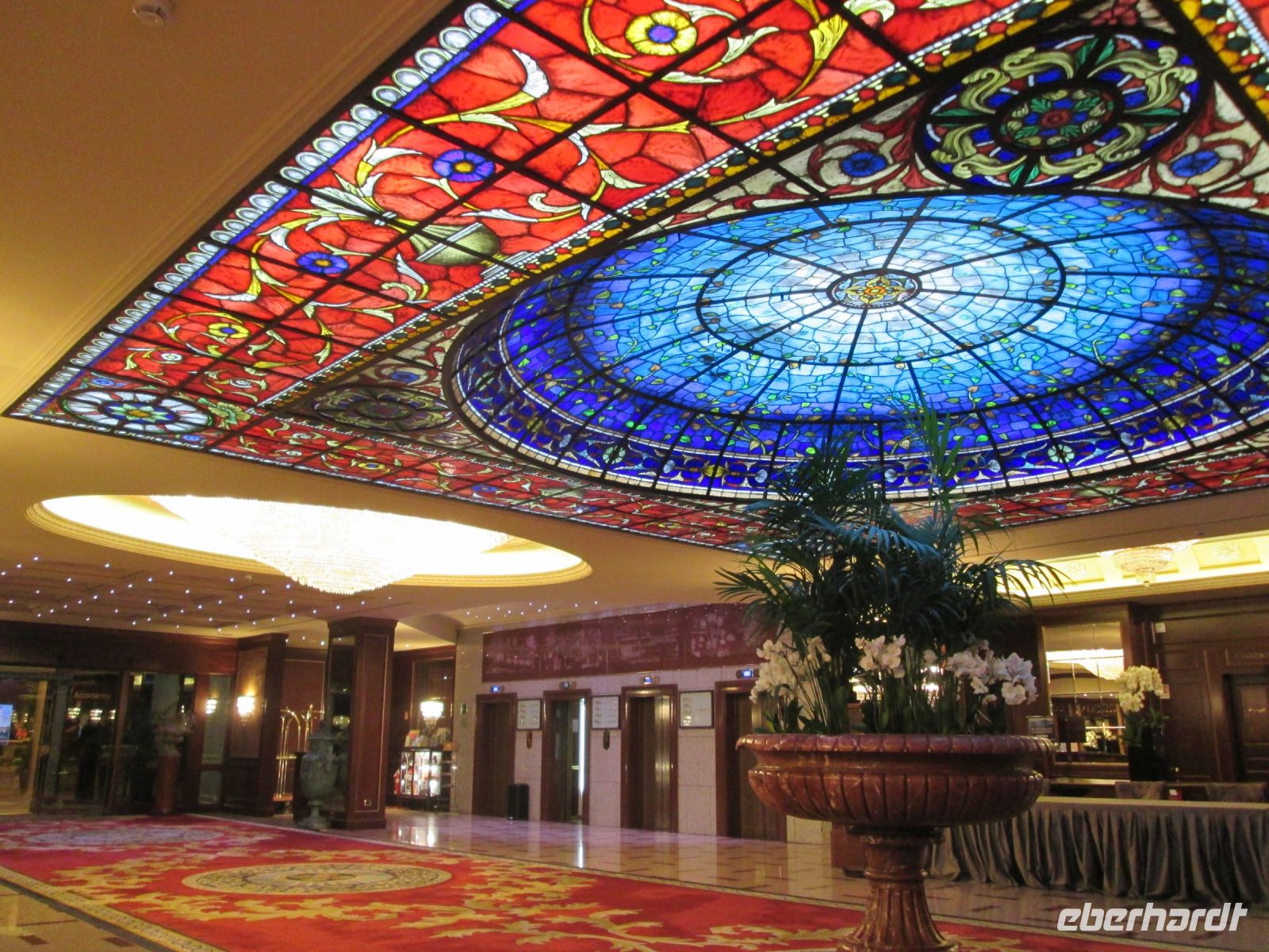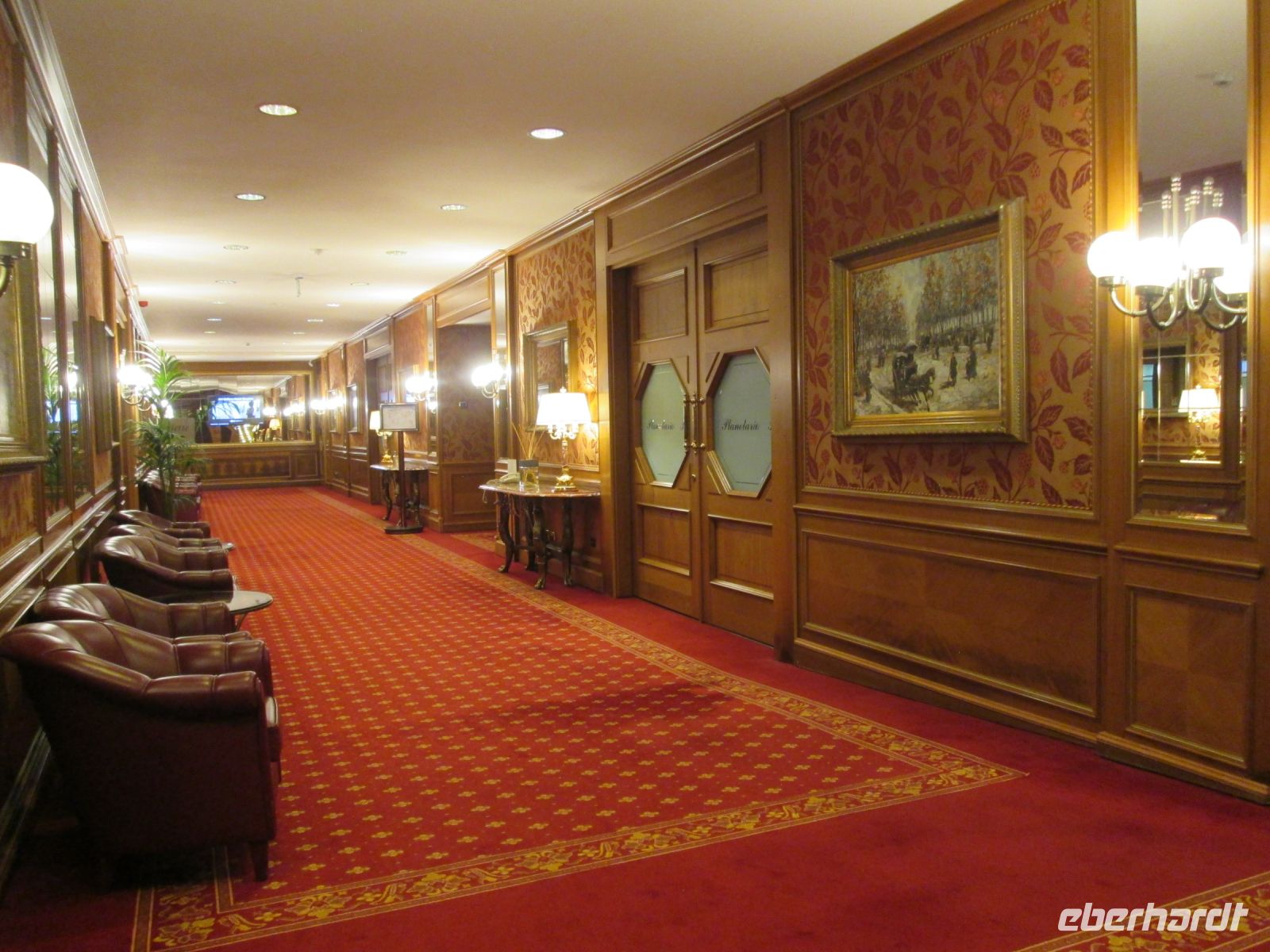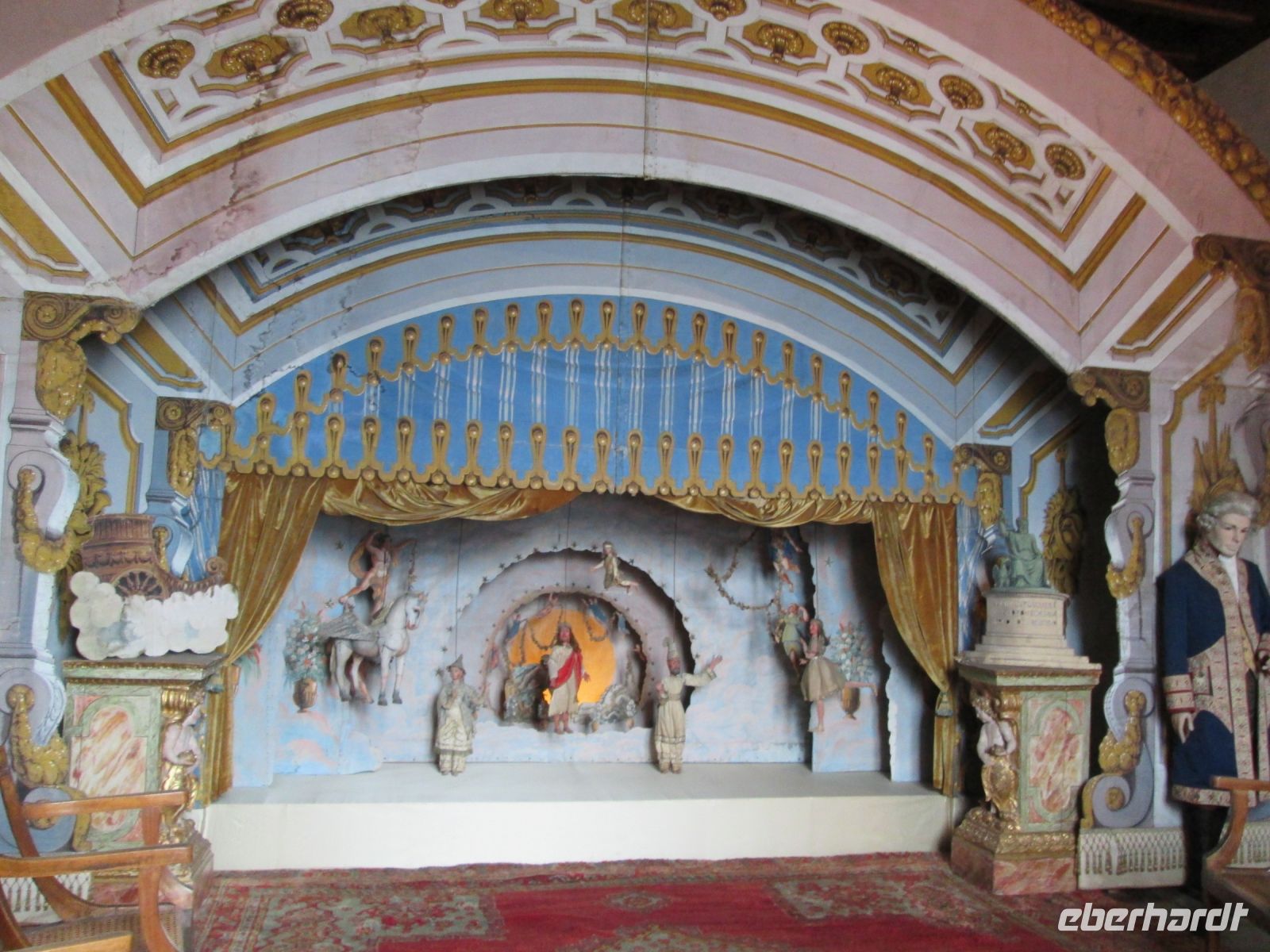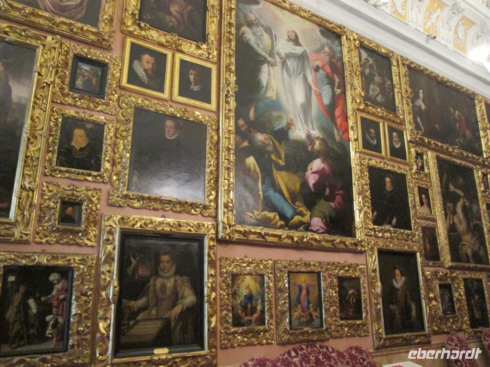 Die Besichtigung des Borromeo-Palastes auf der Isola Madre ist ebenso ein Muss wie der Palast auf der Isola Bella. Dieser wurde später, in der Zeit des Barock erbaut und wird im Obergeschoss heute noch in den Sommermonaten von der Familie bewohnt. So bleiben von den insgesamt 198 Schlossräumen 50 der Familie vorbehalten und 30 sind für die Öffentlichkeit zugänglich. Diese hat uns hervorragend der Schlossführer Matteo nahe gebracht. Sehr beeindruckend sind z.B. der 23 m hohe Festsaal, er ist damit ebenso hoch wie die Statue des Carlo Borromeo in Arona, der Musiksaal, in dem 1935 mit den Herren Mussolini, Laval und Mac Donald die Konferenz von Stresa tagte, der Napoleon Saal und die Grotten. Sie befinden sich um Untergeschoss und sind gen Norden gerichtet, weil man Erholung und Entspannung vor der sommerlichen Hitze suchte. Aus Tausenden von weißen und schwarzen Kieselsteinchen bestehend, bilden sie einen starken Kontrast zum Marmor, Stuck, Gold und Damast in den oberen Stockwerken.