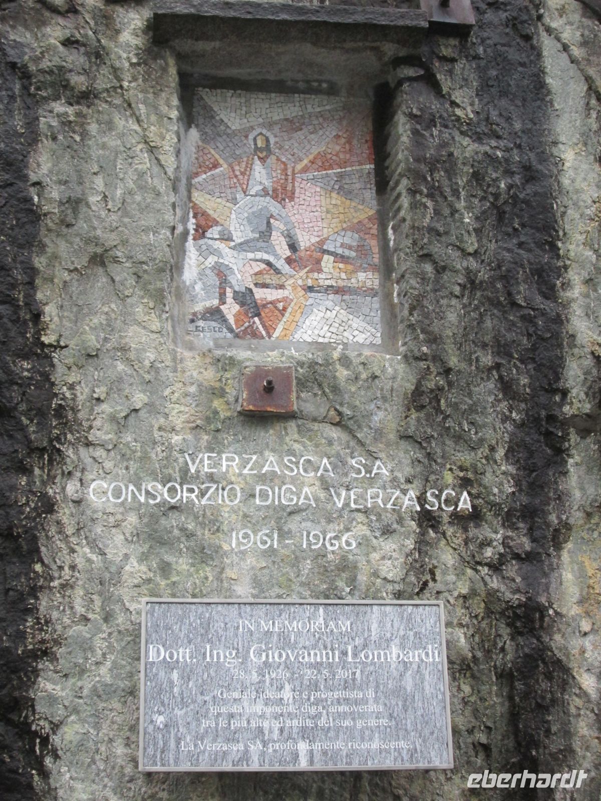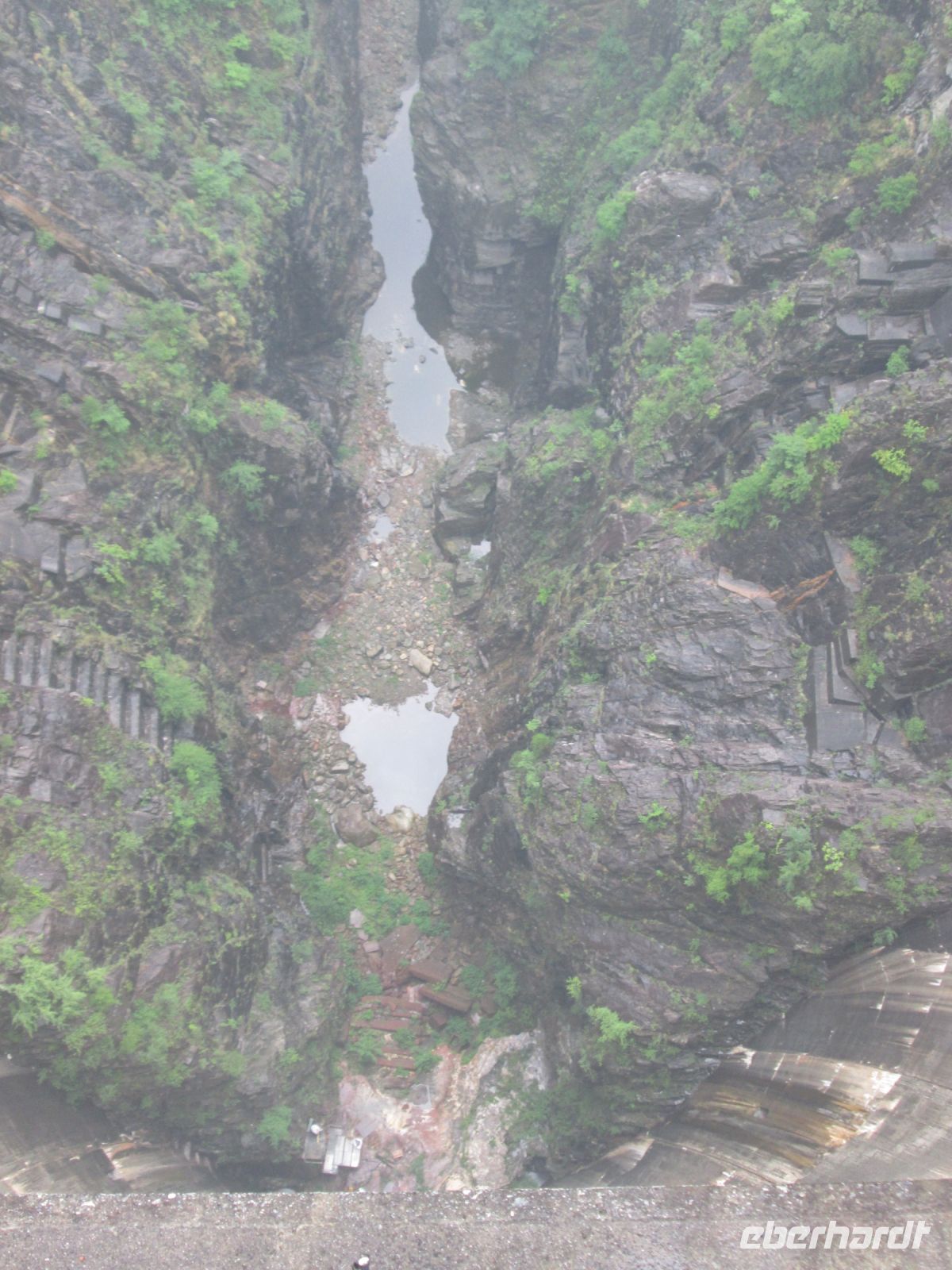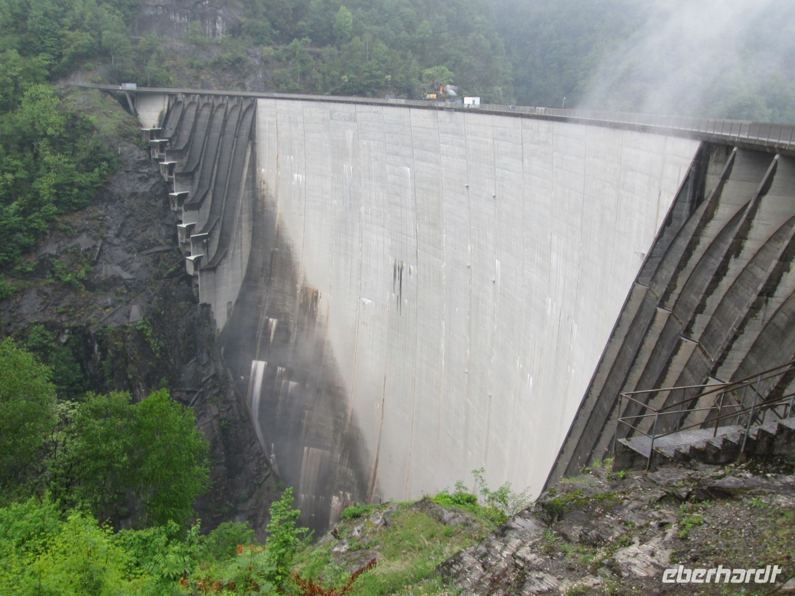 Auf der fast 2stündigen Busfahrt entlang des Westufers des Lago Maggiore und in das Verzasca Tal hinein öffnete Petrus tatsächlich immer wieder seine Schleusen. Aber pünktlich zum 1. Ausstieg an der gewaltigen 220 m hohen Staumauer hörte es auf zu regnen. So konnten wir das zwischen 1961 und 1966 erbaute Projekt besser betrachten. Auf der einen Seite der 7 km lange Stausee, auf der anderen der Blick in die Tiefe, in der nur noch der Verzasca Fluss als Bächlein zu erkennen war.