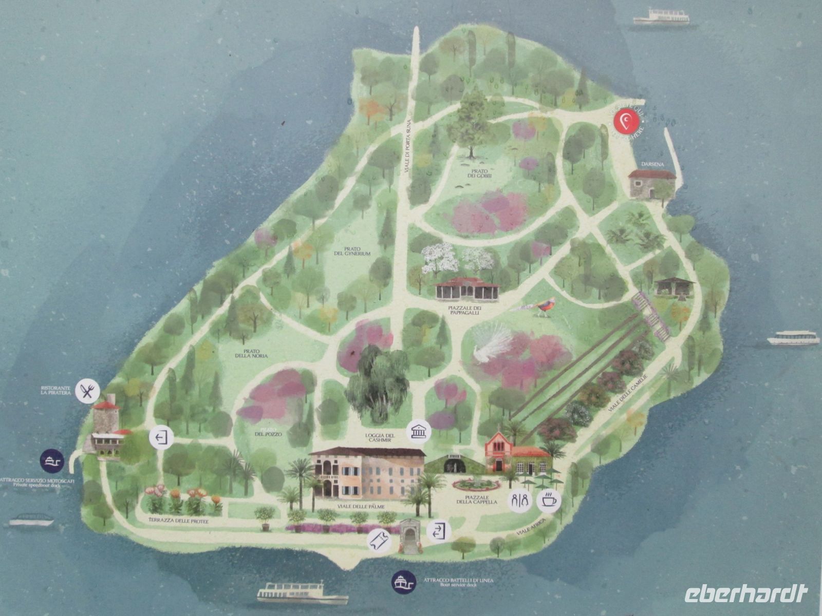 Durch das milde Klima gedeihen auf der Isola Madre z.B. Kamelien, Bambus, Glyzinien, Eukalyptus, Hortensien, eine Kaschmir Zypresse und sogar der uns nicht so geläufige Taschentuchbaum. Alle Pflanzen und Bäume zu bestaunen, war ein Genuss. Zwischen all dieser Farbenpracht begrüßte uns auch mal der Schrei eines Pfau, eines Fasan oder eines Papageis.