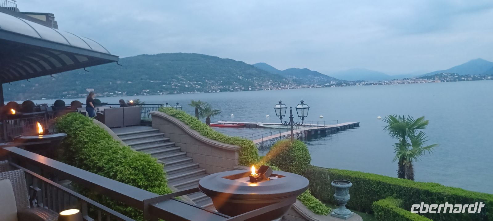 Im Grand Hotel Dino in Baveno werden wir schon lang erwartet, alles ist für den Check In vorbereitet u. dann...das Abendessen in gepflegtem Ambiente mit Weitblick auf den Lago Maggiore; wir sitzen an zwei großen runden Tischen u. bekommen den Tischservice vom Getränkekellner u. jeweils zwei Servicekräften. Dann das Menu: