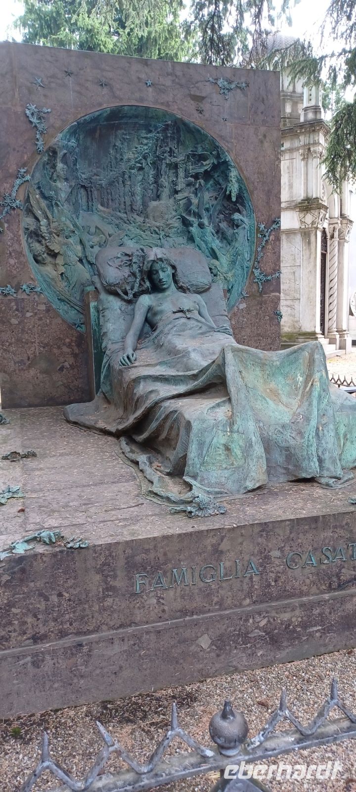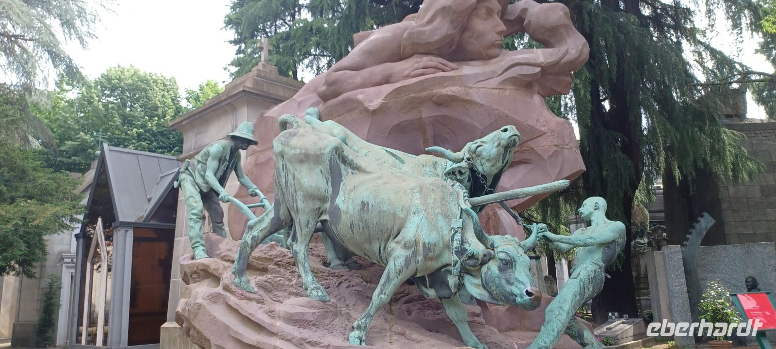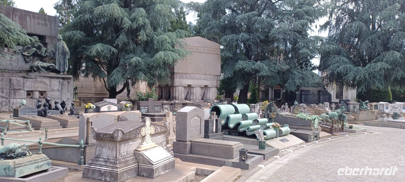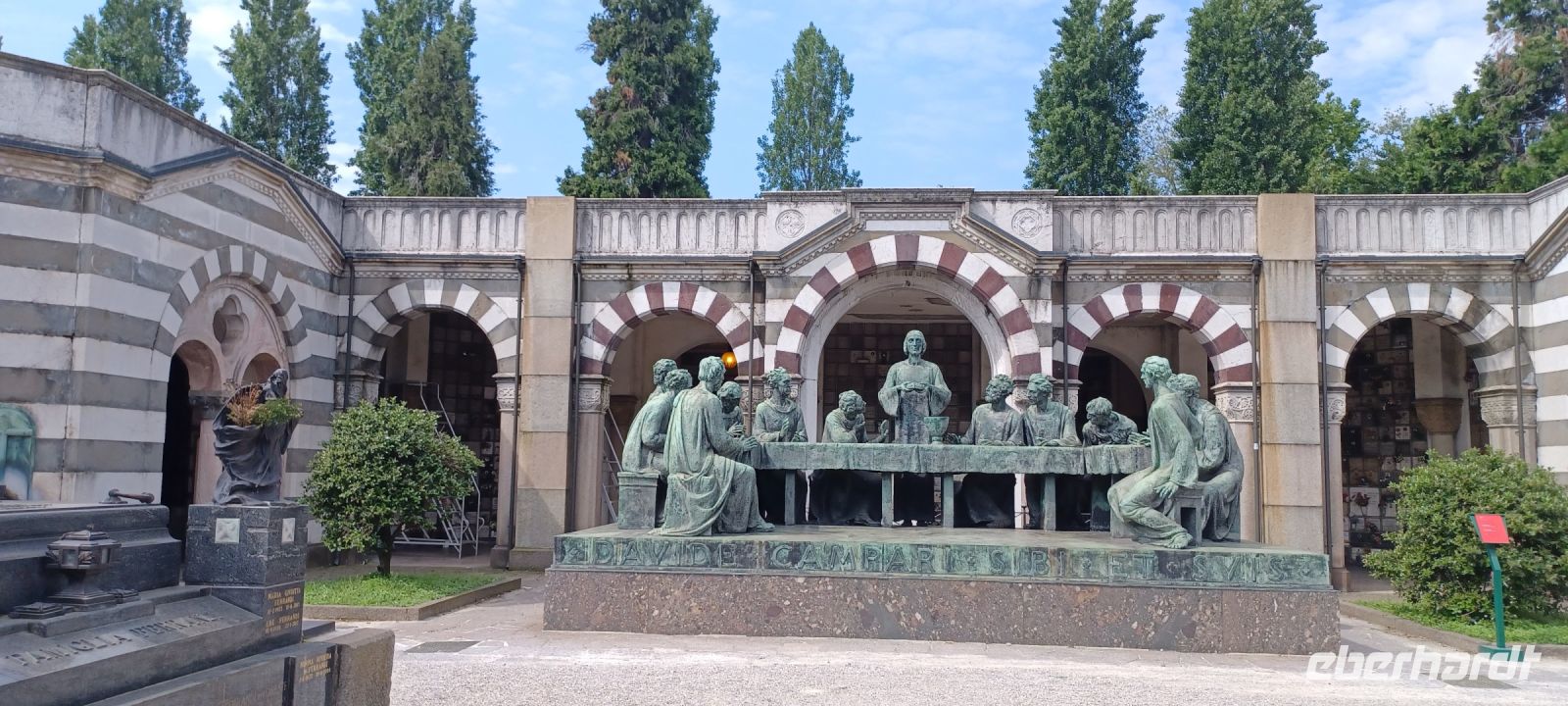Mailand am Sonntag: es war ein guter Plan, die Hauptstadt der Lombardei auf diesen Tag zu legen, zumal wir mit viel Glück fast alle Wünsche erfüllen können: wir haben Muttertag u. unsere Reiseleiterin spendiert einen original Mailändischen Panettone (italienischer Hefekuchen); die Verkehrslage ist ungewöhnlich ruhig, daher erreichen wir Mailand vorzeitig!! Am Monumentalfriedhof treffen wir unseren Stadtführer, Giorgio. Während seiner Ausführungen beim Rundgang über den geschichtsträchtigen u. künstlerische gestalteten Friedhof stellt sich schnell heraus, dass Giorgio Kunst u. Architektur studiert hat u. er dieses Feld auch durch eigene Literaturbeiträge beherrscht. Wir folgen seinen Ausführungen an ausgewählten Grabstätten von Mailands Persönlichkeiten. Sehr imposant das Grabmal der Unternehmerfamilie Campari: der Künstler Giannino Castiglioni hat 1939 das Abendmahl von Leonardo da Vinci als bronzene Plastik geschaffen.
