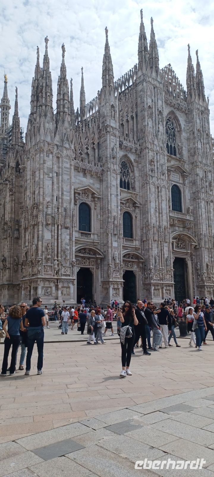 Dann stehen wir plötzlich vor dem Mailänder Dom, der imposanten Fassade - vor dem Domplatz touristisches Getummel. Die Atmosphäre wird getragen von einer Musikprobe auf dem Domplatz. Giorgio gibt sich noch einmal große Mühe, uns über die Audioguides akustisch zu erreichen -wir werden vieles nachlesen in der Verschriftlichung der Reisebücher, denn wir haben ja Zeit im Bus auf unserer Rückreise. Wir beratschlagen die Möglichkeiten für eine effektive dreistündige Freizeitnutzung: alle Geschäfte haben sonntags geöffnet, die Schlange für den Domeintritt ist überschaubar mit 45 Minuten bis zum Eintritt, das Brera-Viertel (Künstlerviertel) mit ruhigerem Treiben u. Verweilen u. schlussendlich die Scala noch einmal mit Vorführungsfilm u. Theatersaal. Zufrieden über die Gesamtkomposition des heutigen Tages nimmt uns der Bus standesgemäß direkt vor der Scala wieder auf.