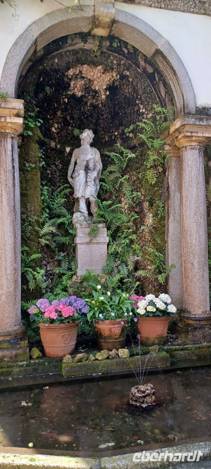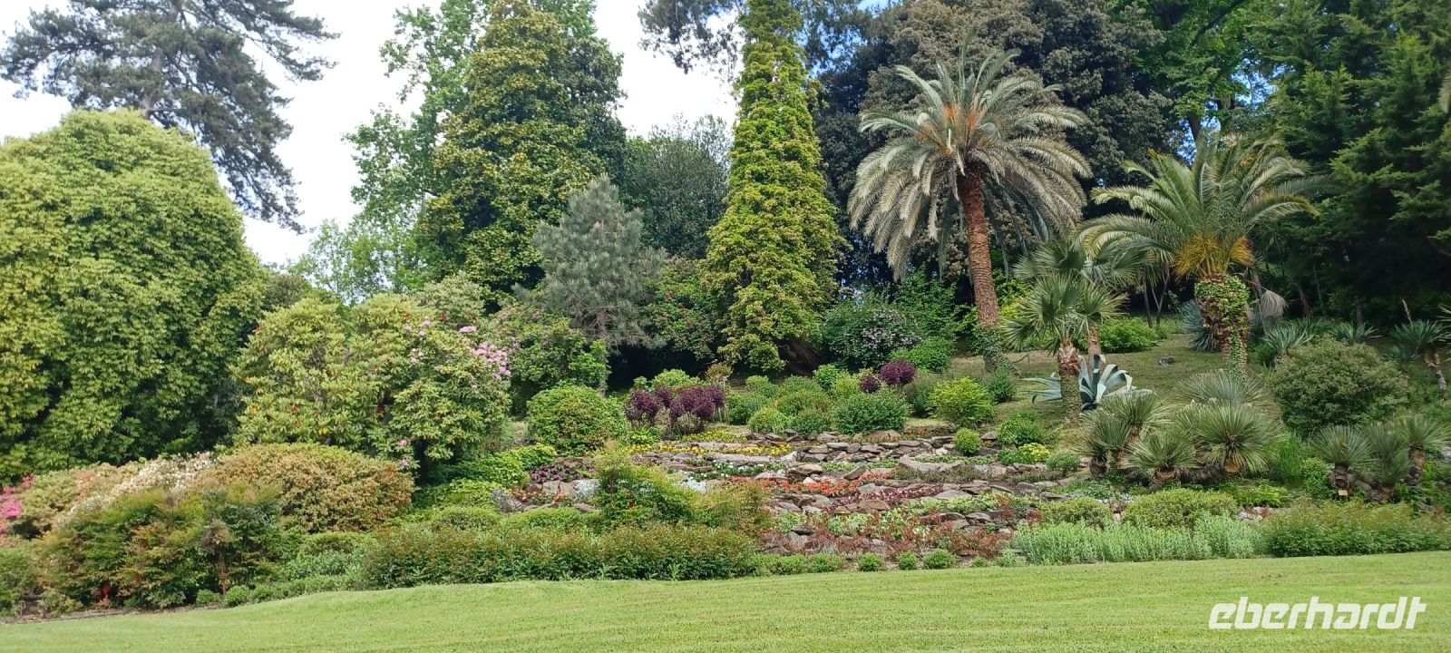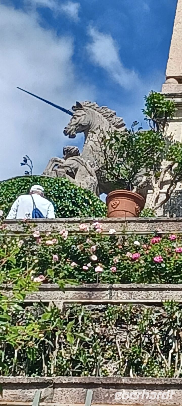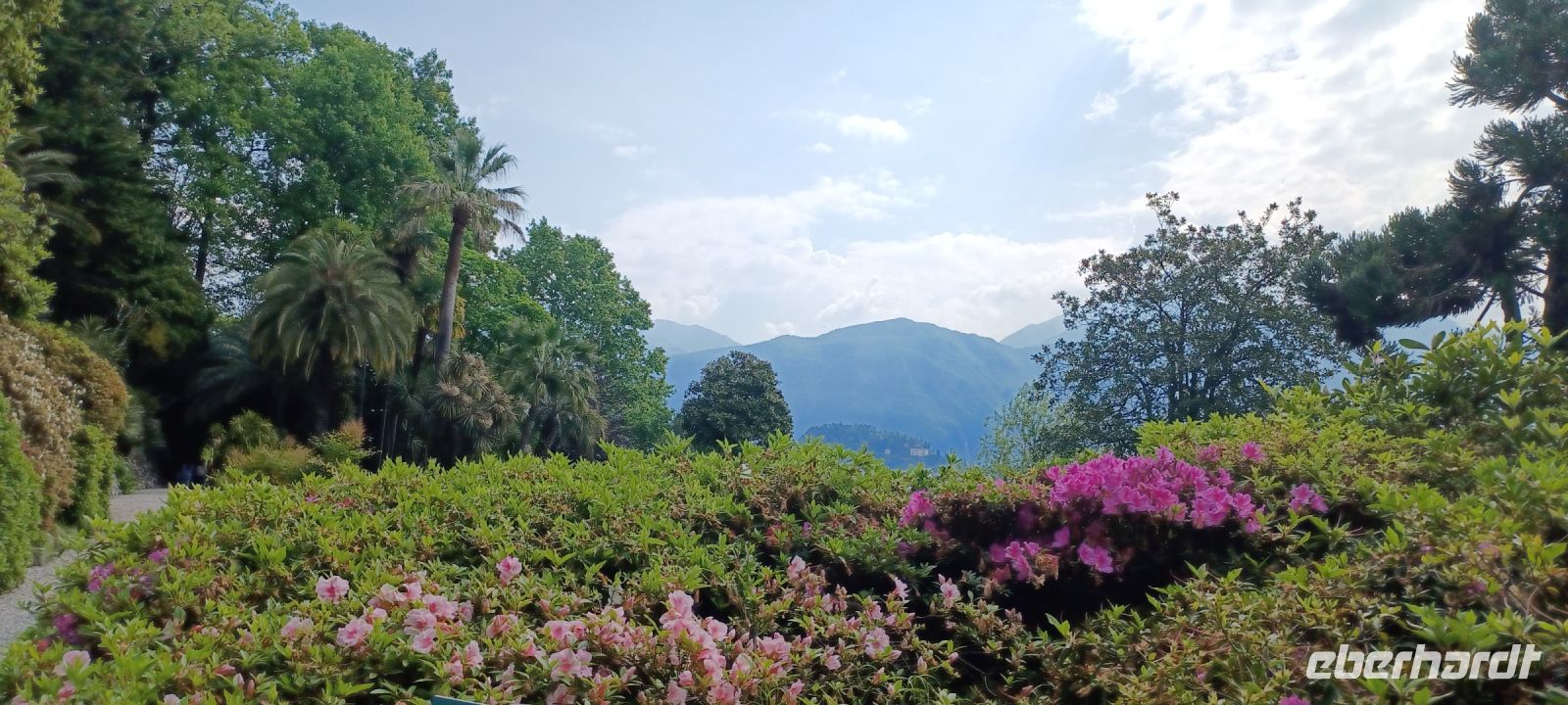 Gartenseitig gibt sich die Insel im barocken Stil, zur Seeseite terrassiert. Im Mittelpunkt das Teatro Massimo mit 10 Terrassen, die eine abgestufte Pyramide bilden. Auf der Spitze thront das Wappentier der Borromäo - das Einhorn. Wir sind im Mai zur Frühlingsblüte u. erleben die Rhododendren, Kameloen u. Azaleen in ihrer Blüte.