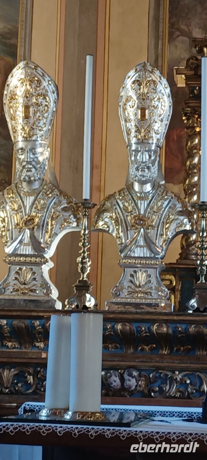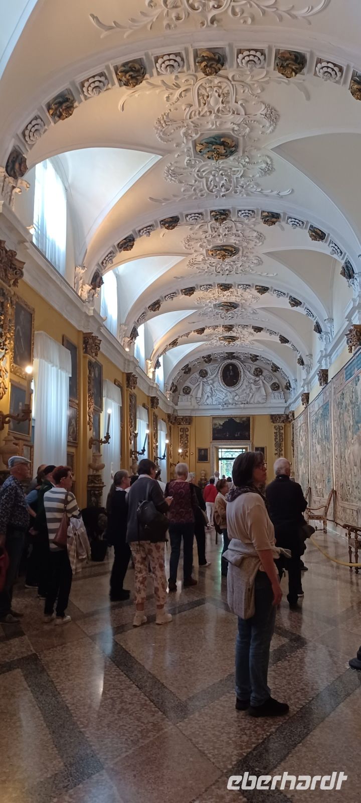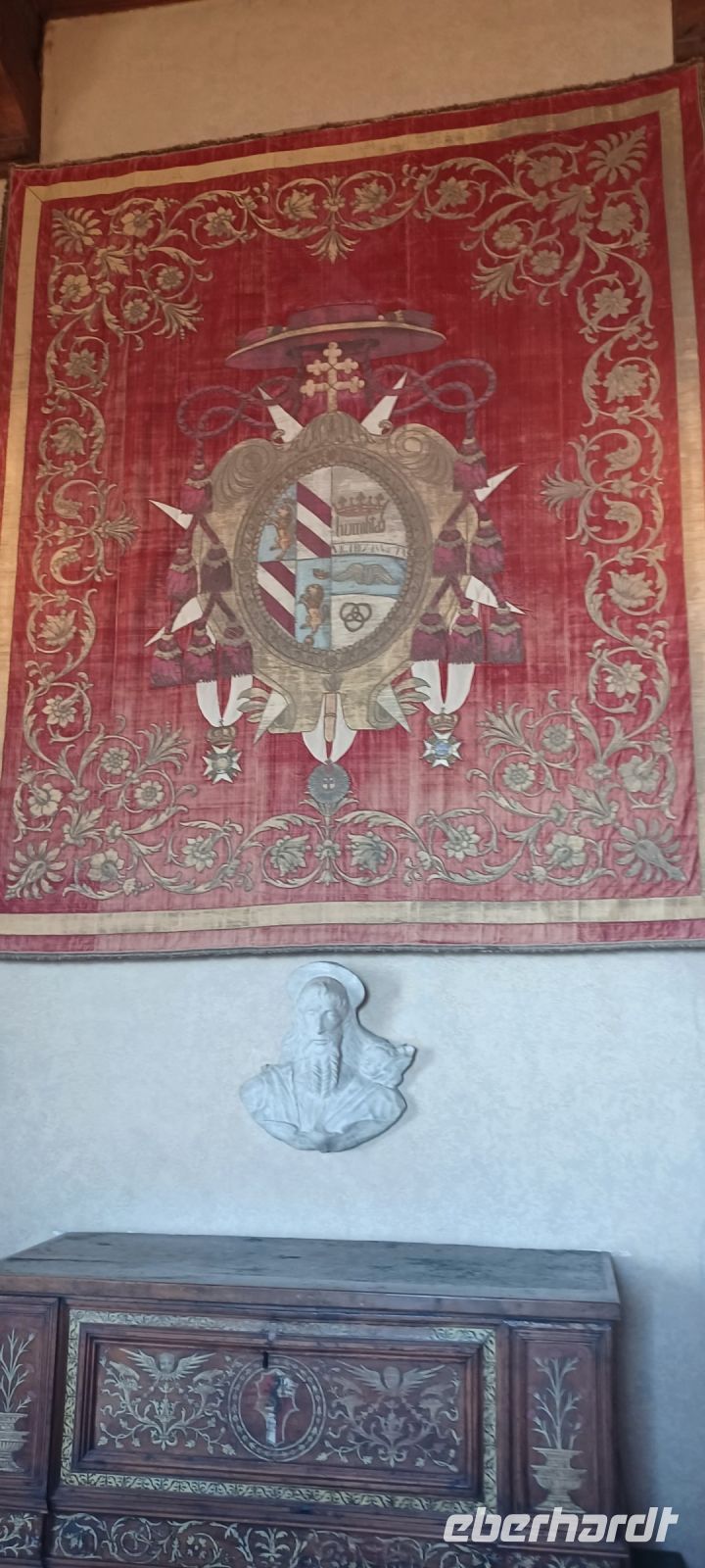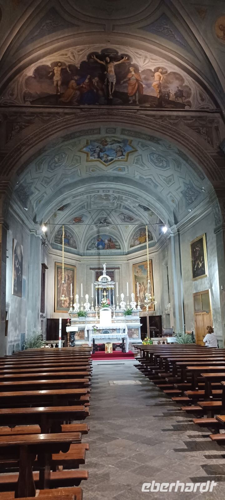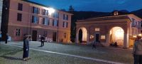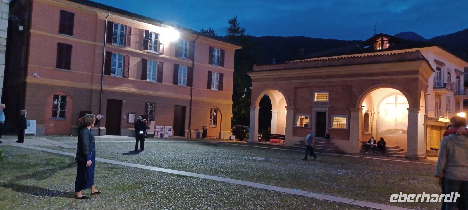 Am Abend unternimmt eine kleine Gästegruppe noch einen Spaziergang zum Monumentalen Komplex der Probsteikirche, nur wenige Minuten vom Hotel entfernt. Der Kirchenkomplex mit der Taufkapelle u. die Kirche der Heiligen Gervasus mit dem Glockenturm wird durch einen L-förmig angelegten Platz mit einem Kreuzgang vollendet. Wir haben diesen Freitag Abend aus zwei Gründen für unseren Spaziergang gewählt: zum einen ist nur freitags der Platz angestrahlt u. zugleich sind die Kirchen bis 22:00 Uhr geöffnet, zum anderen folgen wir einer Einladung von unserem Gästeführer Alfredo zur Finissage der Bilderausstellung seiner Frau. Wir erhalten Erklärungen zu den ausgestellten Motiven u. erfahren von der Künstlerin etwas über die Naturgewalten des Lago Maggiore.