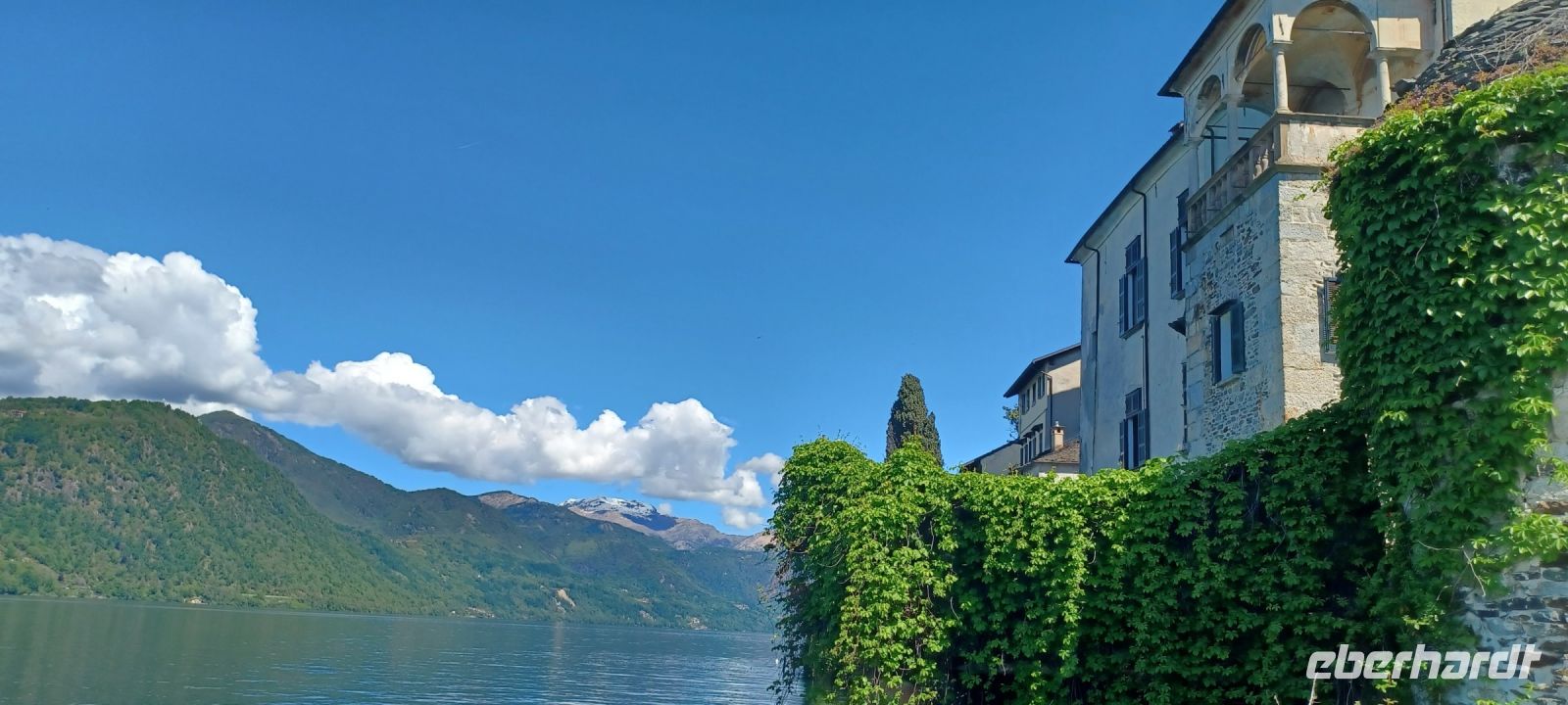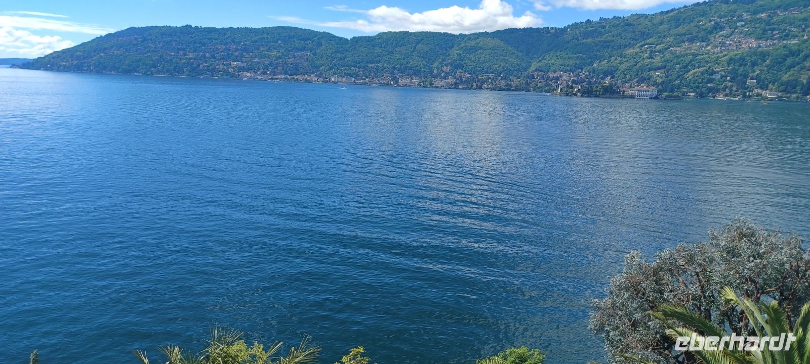Der landschaftliche Reiz der oberitalienischen Seen durch Berge mit ewigem Schnee auf den Gipfeln, zu deren Füßen die Wasserflächen sich im Sonnenlicht spiegeln, Steilwände und Inseln mit Gartenland