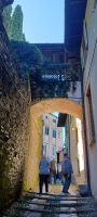 Nur 45 Minuten Fahrtzeit benötigen wir für unser heutiges Ziel. Der Orta See liegt in einer dünn besiedelten Gegend. Die steilen Ufer verhinderten die Bildung größerer Siedlungen. Über Jahrhunderte hinweg war die Gegend weitgehend abgeschnitten von der weiteren Umgebung. Drei Orte sind wichtige Zentren am See. Die Kleinstadt Omegna am nördlichen Ufer wuchs insbesondere seit dem 19. Jahrhundert und ist heute der bei Weitem größte Ort am Lago d’Orta. In Omegna siedelte sich Industrie an und die Stadt entwickelte sich zum wirtschaftlichen Zentrum des Sees. Ein zweiter Ort mit historischem Ortskern direkt am See ist Pella auf der Westseite. Orta San Giulio mit der Isola San Giulio in der Mitte des Sees ist das historische Zentrum u. liegt auf der Ostseite. Vom Busparkplatz nehmen wir das bestellte Bähnchen zur Stadt hinunter u. unternehmen zunächst einen kleinen Rundgang durch den Ortskern:
