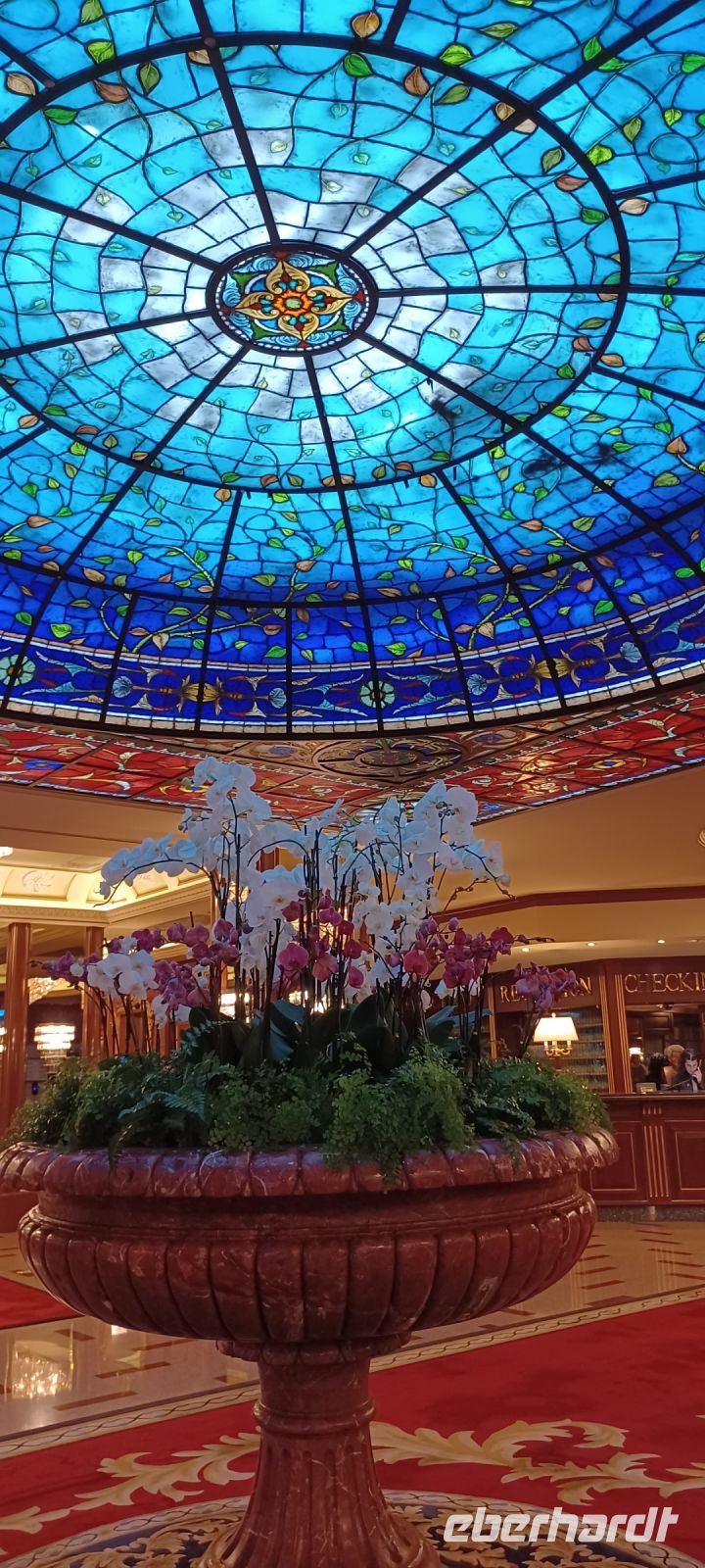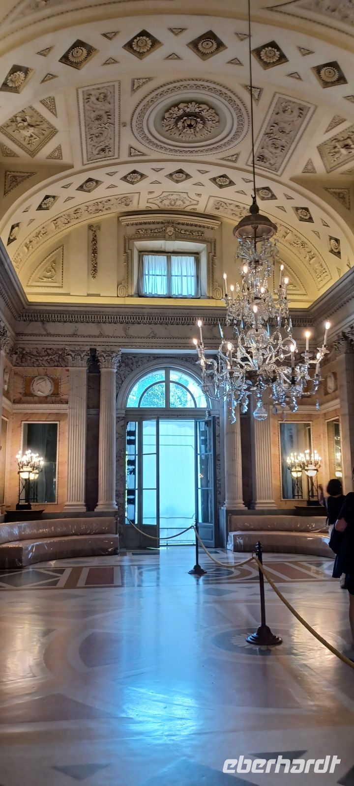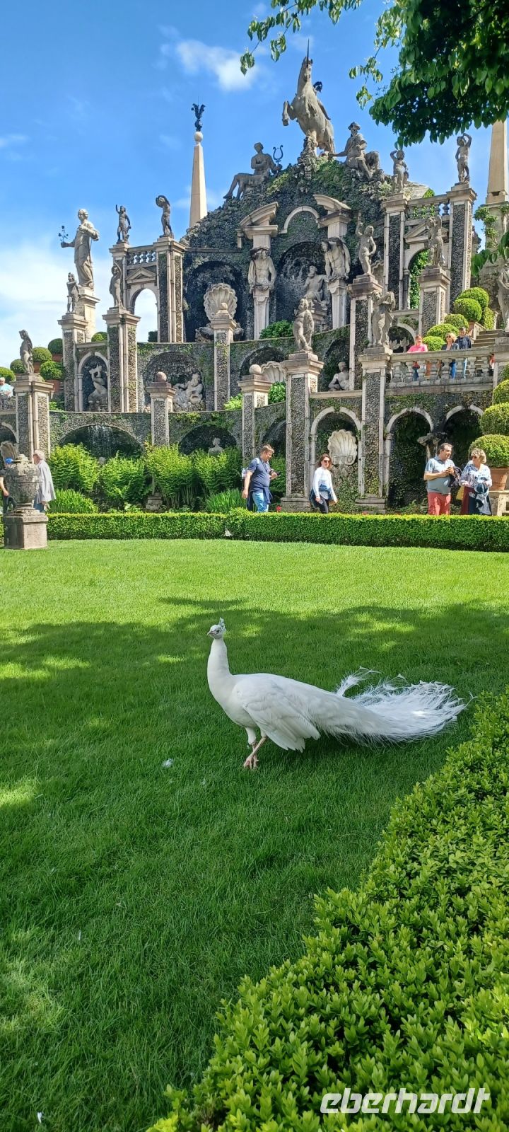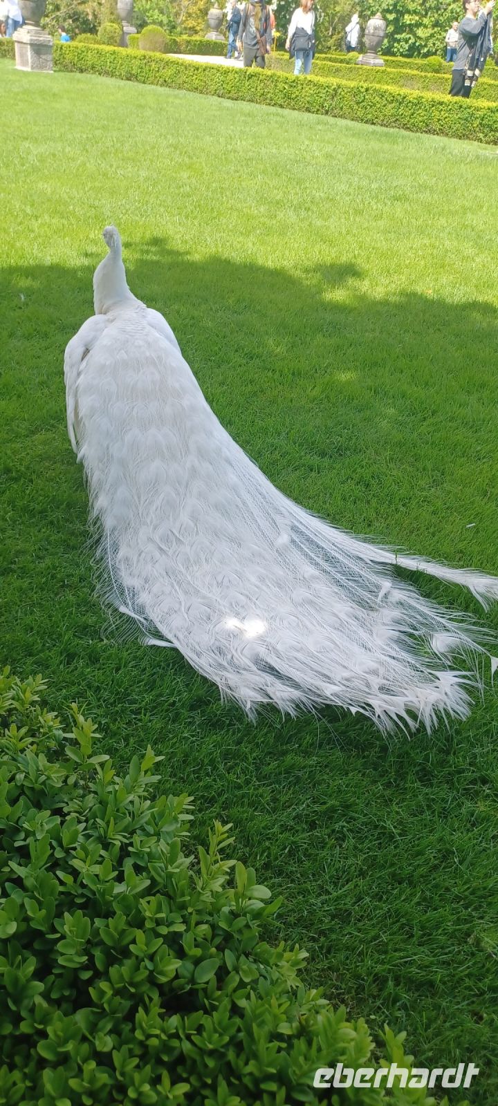 Auf den Gartenfreiflächen begegnen uns bunte u. weiße Pfaue, die auch über Ballustraden fliegen u. mit lauter Stimme bei den Gästen um etwas Essbares betteln.